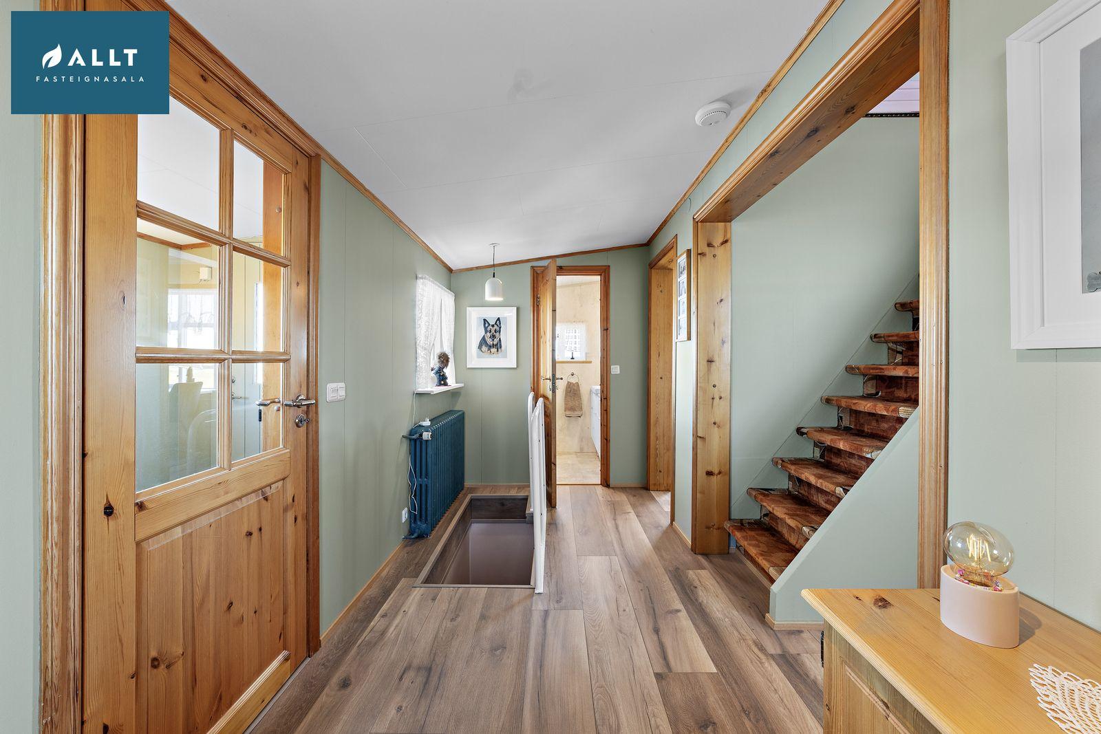 Gangur: Parketlagt, útgengt beint á suðurpall sem leiðir niður í baklóð.