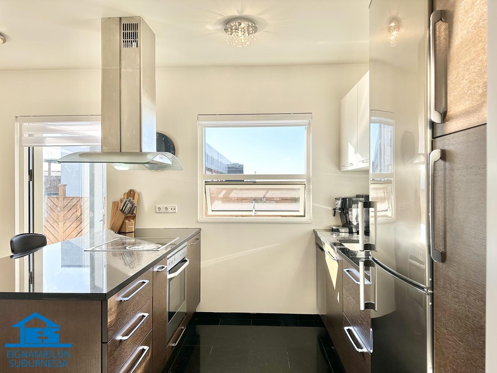 Eldhús hefur góða innréttingu, eldhúseyja með innbyggðu helluborði, viftu og ofn. Dökkar flísar eru á gólfi.