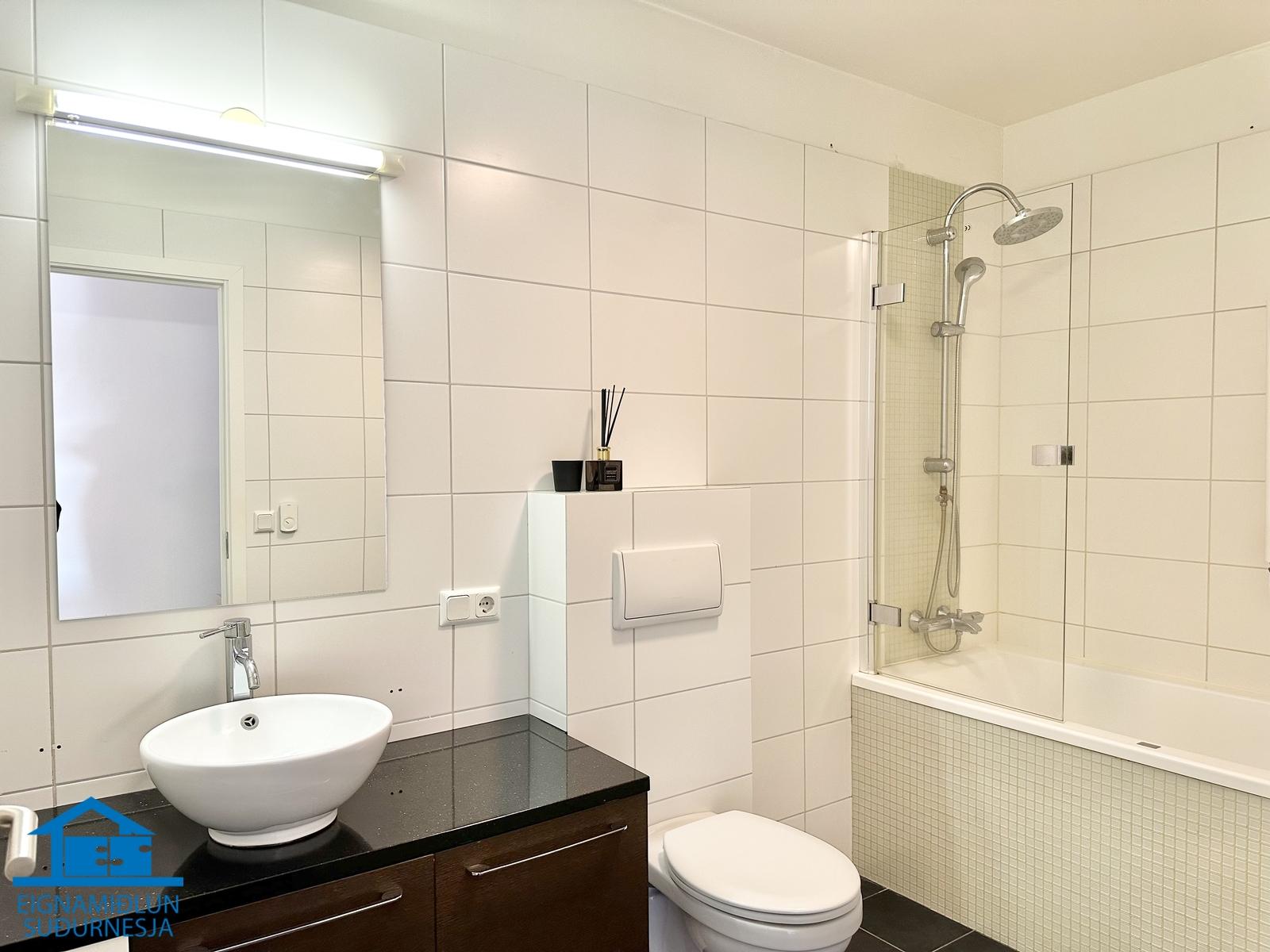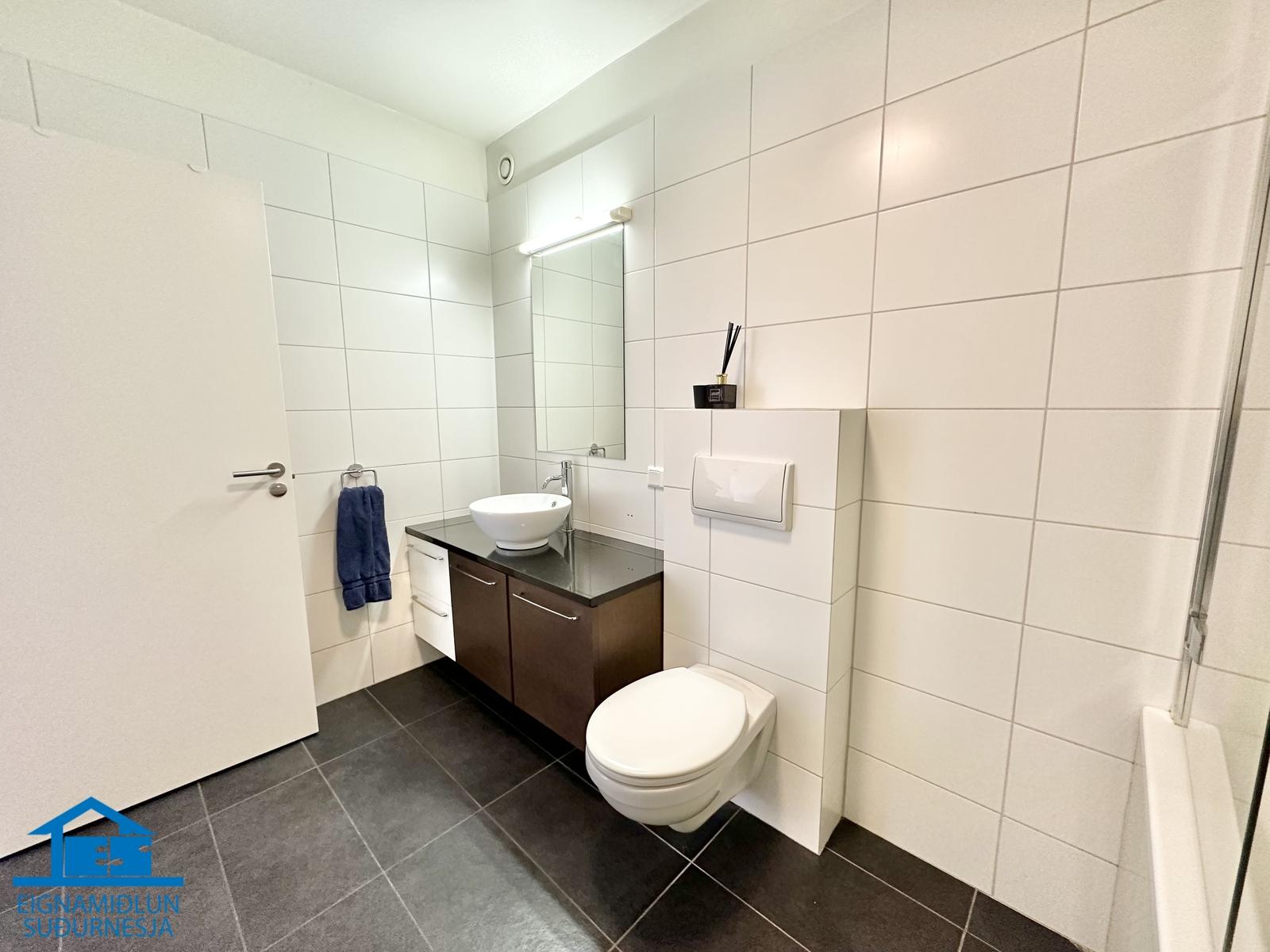 Baðherbergið er með flísum á gólfi og veggjum, snyrtileg innrétting, upphengt salerni, handklæðaofn og baðkar með sturtuhaus.