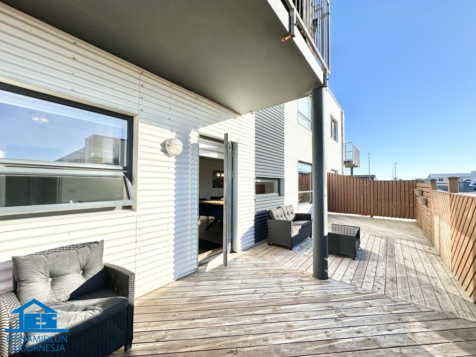 Stofa, borðstofa og eldhús eru í opnu björtu rými með parketi á gólfi. Þar er útgengt út á afgirtan sólpall.