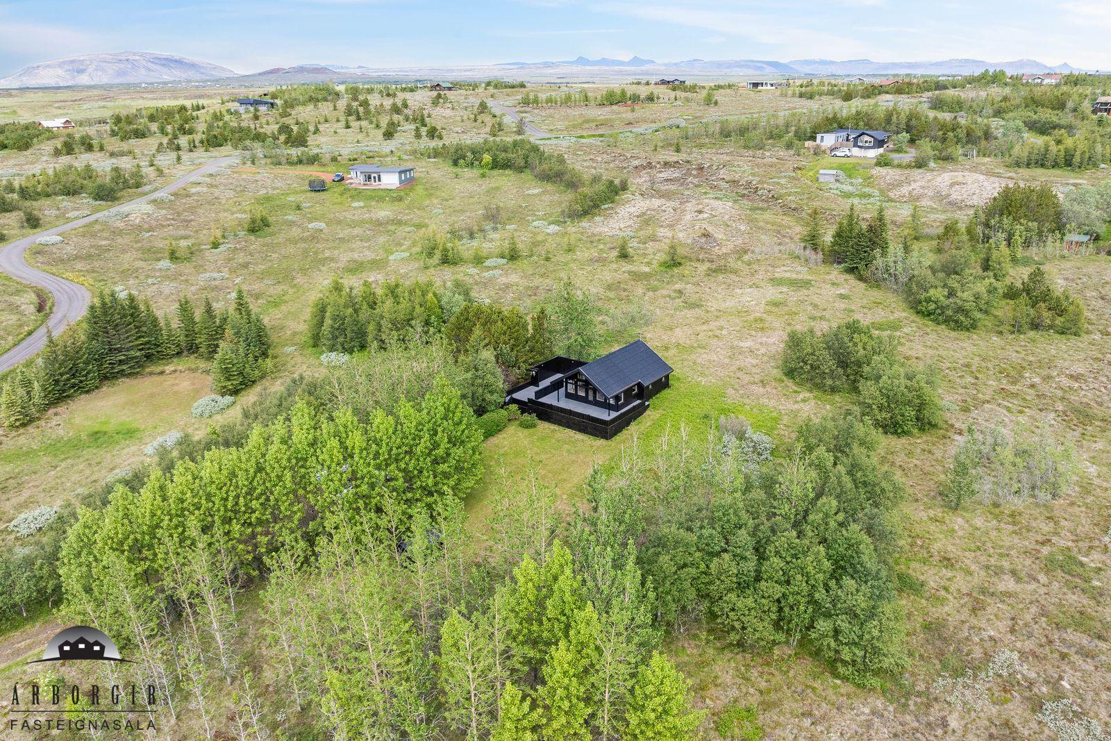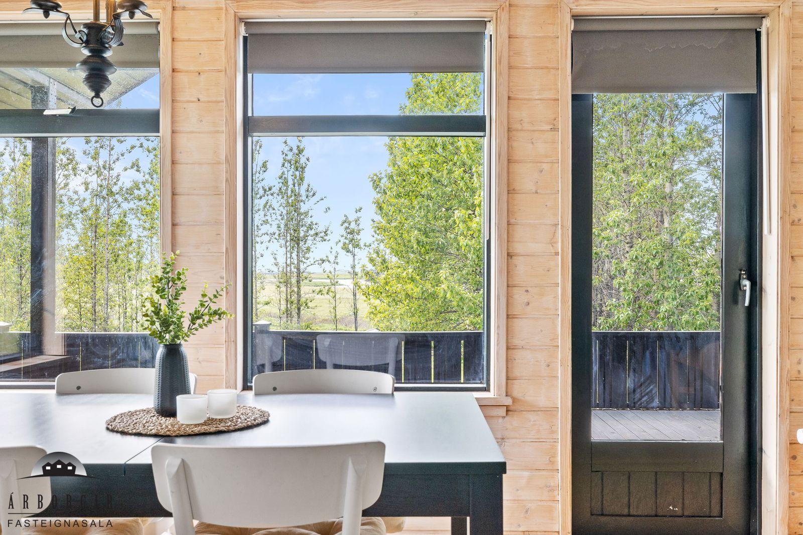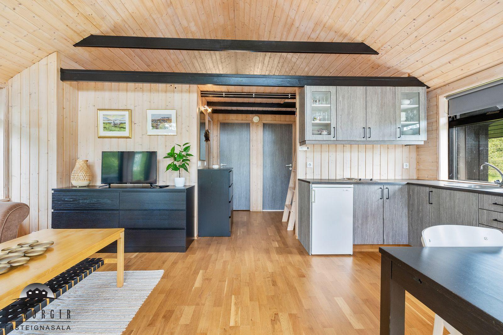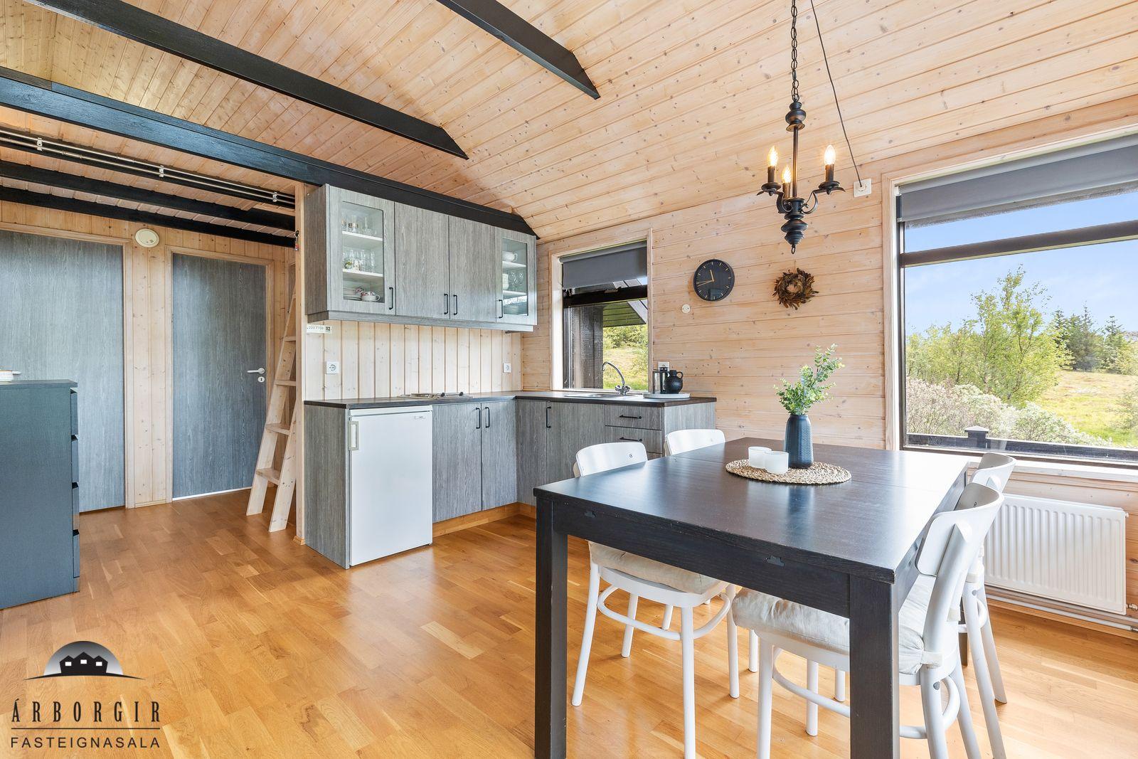ÁRBORGIR SELFOSSI S 482 4800 kynna: Fallegt sumarhús sem stendur á stórri eignarlóð á góðum stað í Kiðjabergi. Húsið er skráð 54,7m2 að stærð timburhús klætt með málaðri timburklæðningu, stallað járn er á þaki. Eignin er byggð 1991 og hefur fengið gott viðhald í gegnum árin. Hitaveita var tekin inn í húsið 2017. Að innan skiptist húsið í forstofu, baðherbergi, 2 svefnherbergi, stofu og eldhús auk svefnlofts sem er yfir hluta hússins. Nánari lýsing: Herbergin eru bæði parketlögð. Forstofa er með dúk á gólfi. Baðherbergi er með dúk á gólfi en þar er innrétting og sturta. Stofa og eldhús eru í opnu rými, parket er á gólfi og í eldhúsi er snyrtileg innrétting. Loft er upptekið og hurð er út á sólpall í stofu. Geymsla er við aðalinngang. Stór sólpallur með skjólveggjum er við húsið, lóðin er stór 11.000m2 og er hún öll gróin og falleg. Skjólgóðar lautir eru á lóðinni og búið er að útbúa litla púttflöt í einni lautinni. Heimilt er að byggja við húsið. Fallegt útsýni niður að Hvítá er frá húsinu og stutt er í golfvöllinn að Kiðjabergi. Nánari upplýsingar og bókið skoðun á skrifstofu Árborga.