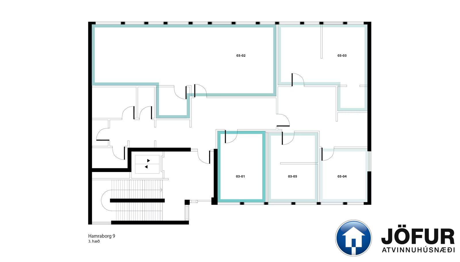 Húsnæðið skiptist í opið vinnurými með kaffikrók og geymslu innan rýmis. Salerni er í sameign. Rýmið er merkt nr. 03-02 á grunnmynd. Ekki vsk húsnæði. Lyfta er í húsinu.