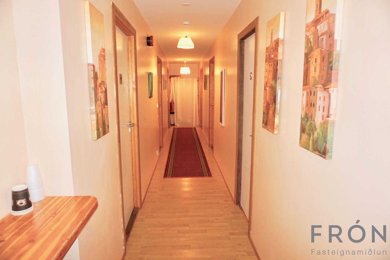 Á annarri hæðinni eru sjö herbergi, með baði. Eitt af þeim er 3ja manna og hin eru 2ja manna. Viðarparket á gangi og viðarstigi upp.