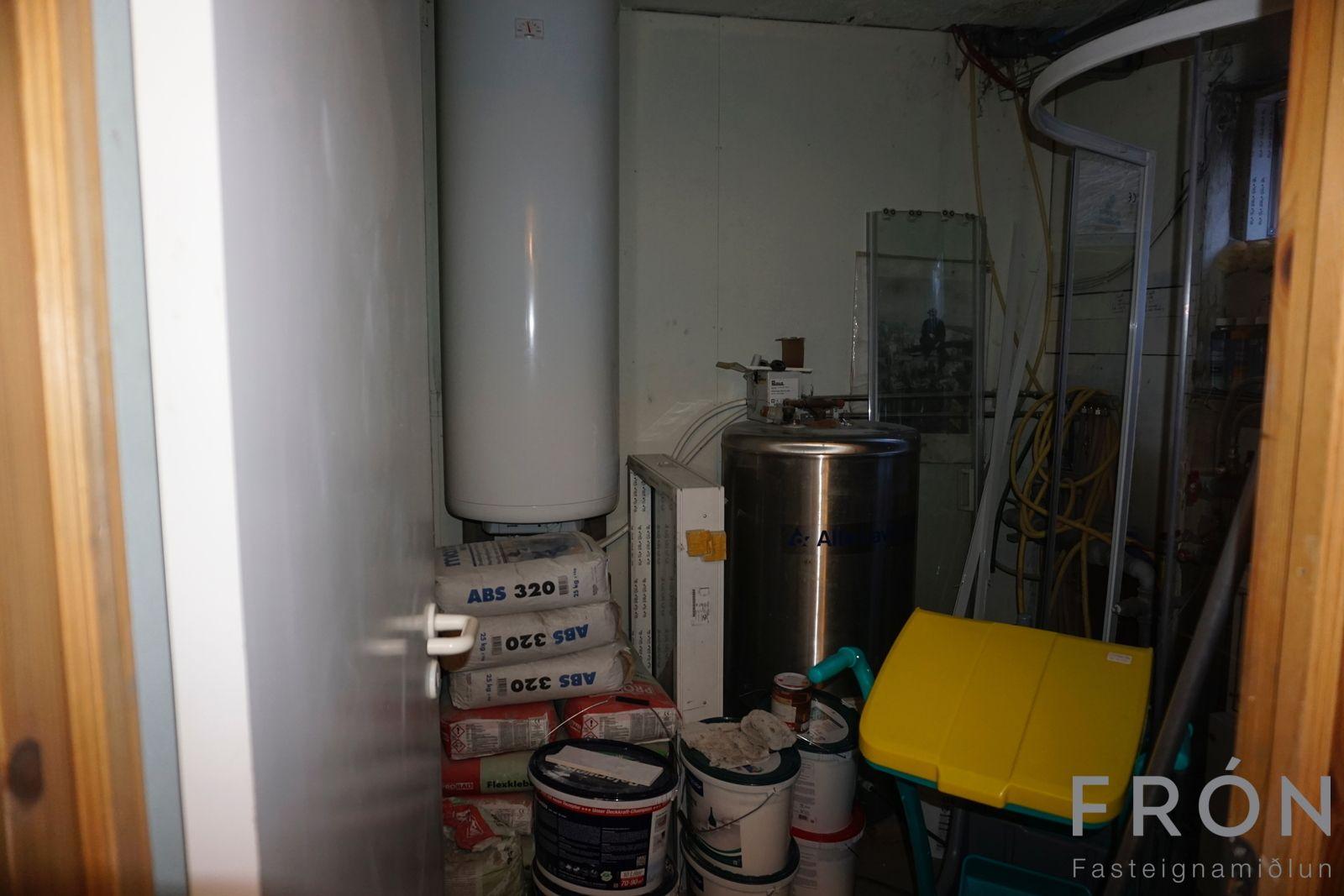 Um er að ræða 6 herbergi á neðri hæð. Þar eru tvenn böð ásamt snyrtingu, margt endurnýjað með góðum frágangi. Þar er einnig kyndiklefi.