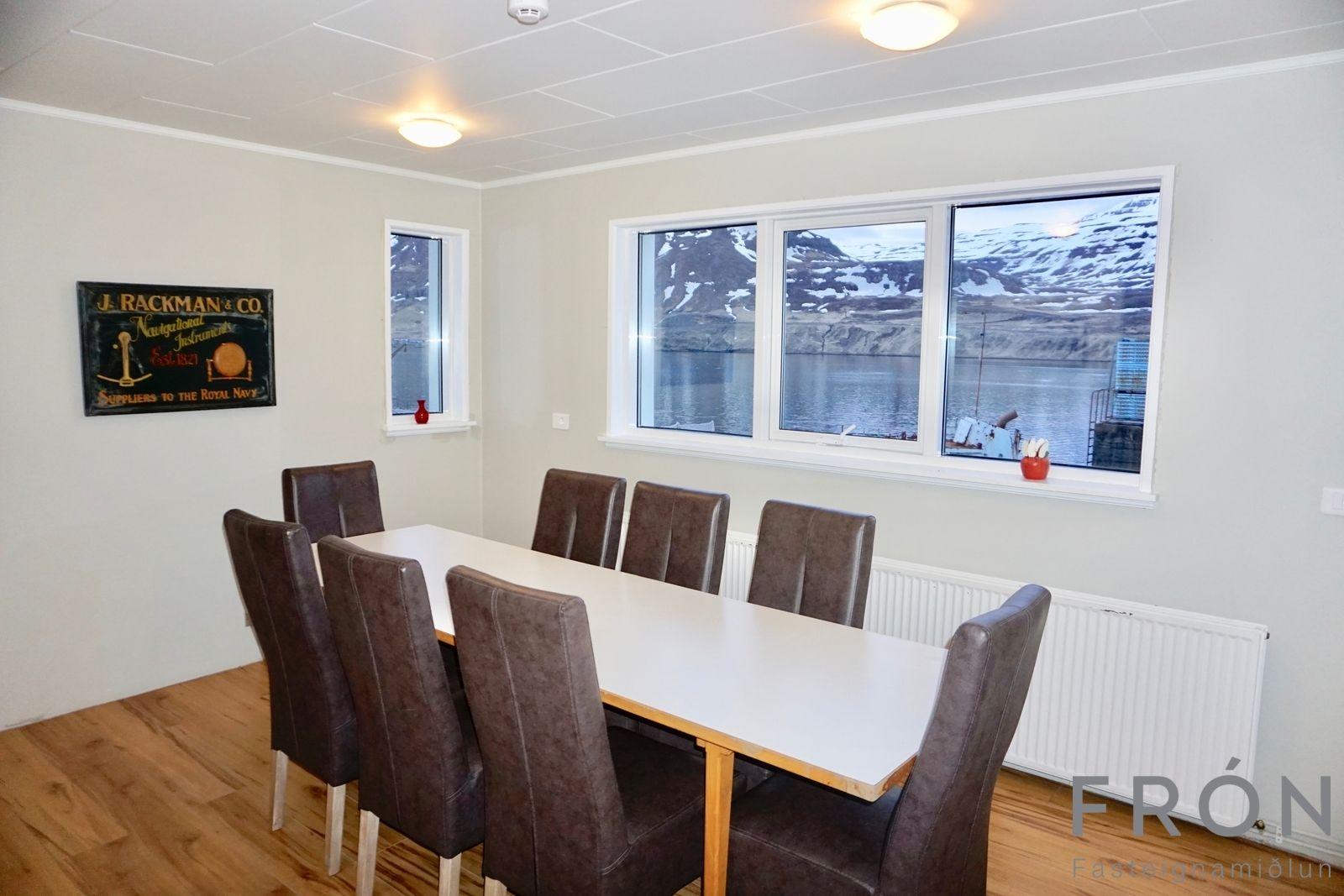 Um er að ræða tvö hús með gistingu, á tveimur hæðum með meiru. Samkvæmt FMR er aðal húsið 288,0 fm nettó og hitt er 215,0 fm, bæði byggð árið1962. Helmikil athafnalóð og bryggja fyrir hafskip fylgir með. Heildar nettó fm eru þá 553,4 fm.