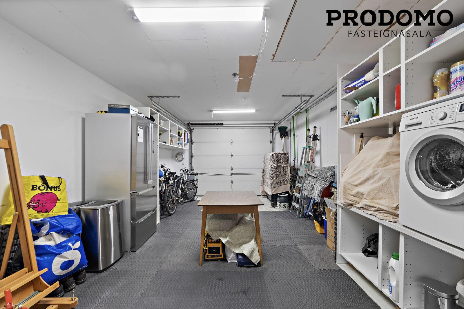 Þvottahús / bílskúr - Þvottahús var áður inn af bílskúr en búið er að opna á milli. Flísar á hluta gólfs og rest málað. Innréttingar í skúr eru nýlegar en fronta vantar. Gott geymsluloft er yfir góðum hluta hússins. Innangengt er í þessi rými.