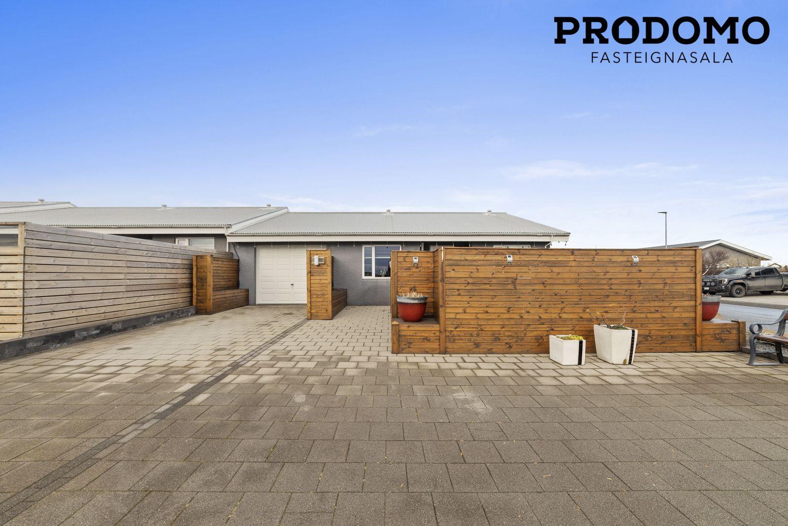 Lóð er frágengin á snyrtilegan hátt. Stór hellulögð innkeyrsla. Beggja megin við húsið er góð hellulögð aðstaða með skjólveggjum. Á baklóð er lítill geymsluskúr.