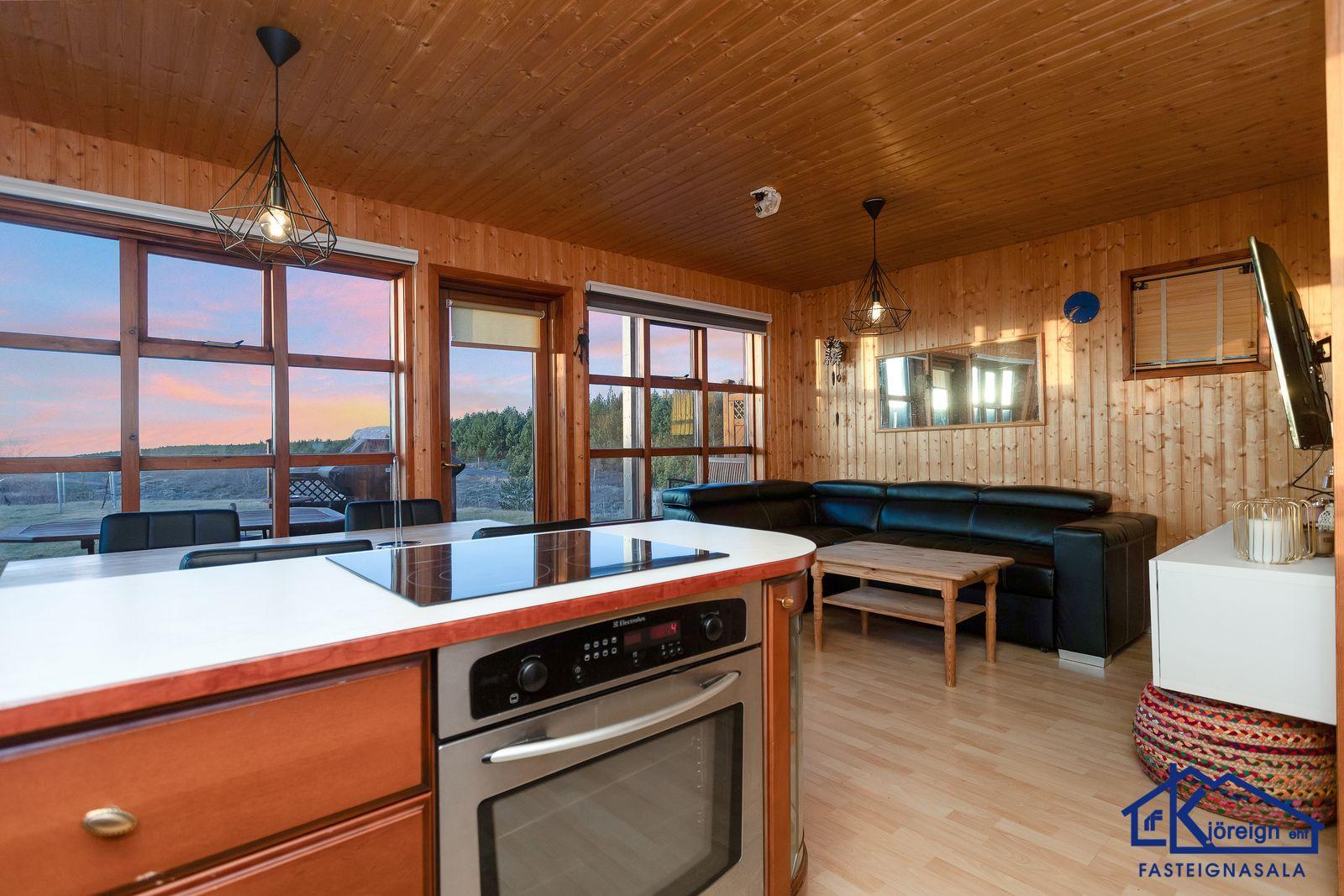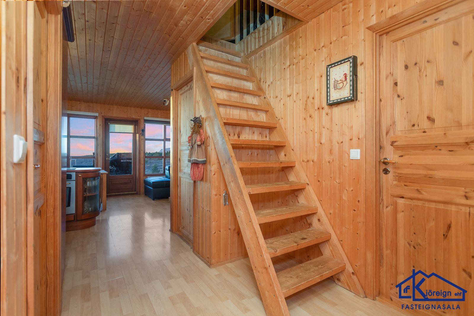 Kjöreign fasteignasala: kynnir glæsilegt 79,2 fm sumarhús í Vaðnesi við Efri-Markarbraut 16, Grímsnes og Grafningshreppi. Lýsing, neðri hæðin. Forstofa, tvö svefnherbergi, baðherbergi, geymsla og eldhús og stofa í sama rými. Lýsing, efri hæðin. Tvö rúmgóð svefnherbergi og opið rými. Góð lofthæð. Nýtanlegt gólfrými meira en birt stærð segir til um. Sólpallur og heitur pottur. Landið er 7.513,0 fm og er eignalóð. Mikill gróður. Einstaklega góð staðsetning.