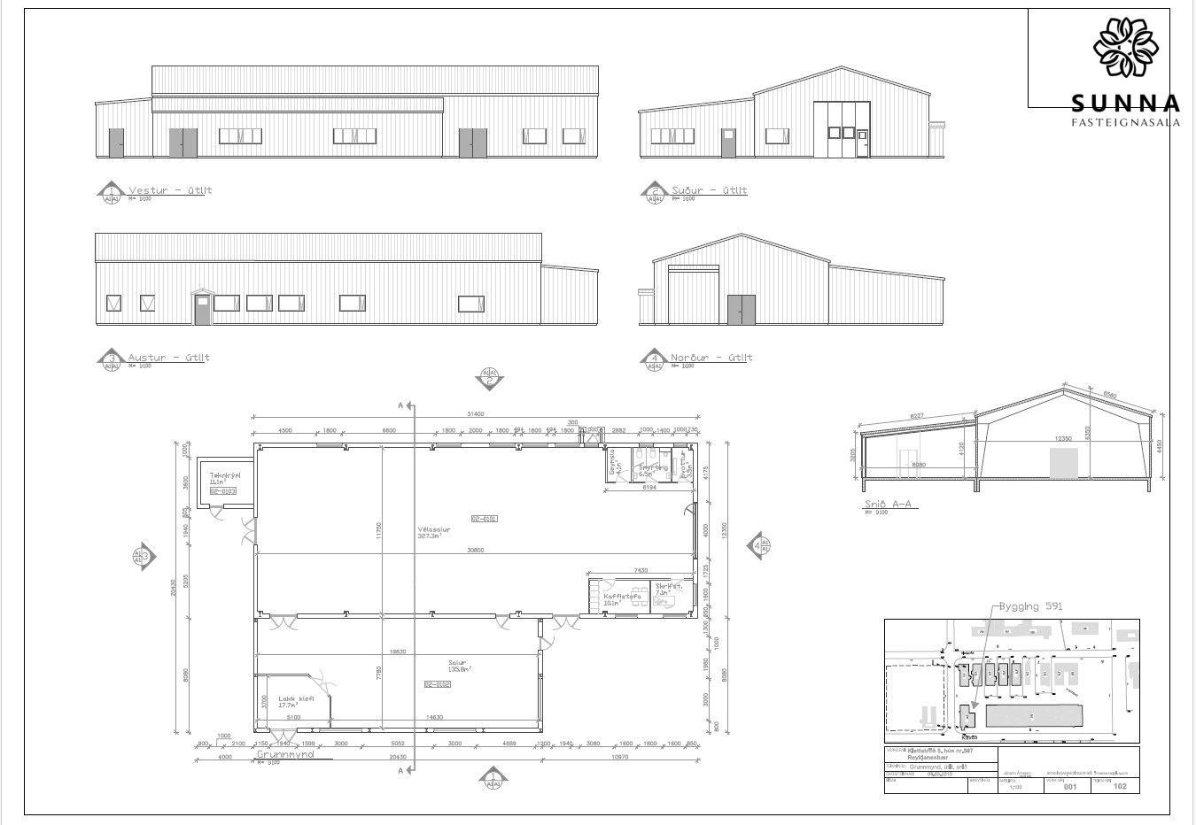 Um er að ræða 567,2 fm atvinnuhúsnæði á Ásbrú. Eignin skiptist í tvo sali; annar er 387,8 fm og hinn er 165 fm. Þá er tæknirými alls 14,4 fm. Geymsluloft er yfir stærri hlutanum og er óskráð en telur um 160 fm. Lofthæð í stærri salnum er ca. 6,35 m, og innkeyrsluhurð er 3,65 m á breidd og 3,8m á hæð. Lofthæð í minni salnum er ca. 3,50 m, og innkeyrsluhurð er 3,60 m á breidd og 3m á hæð.