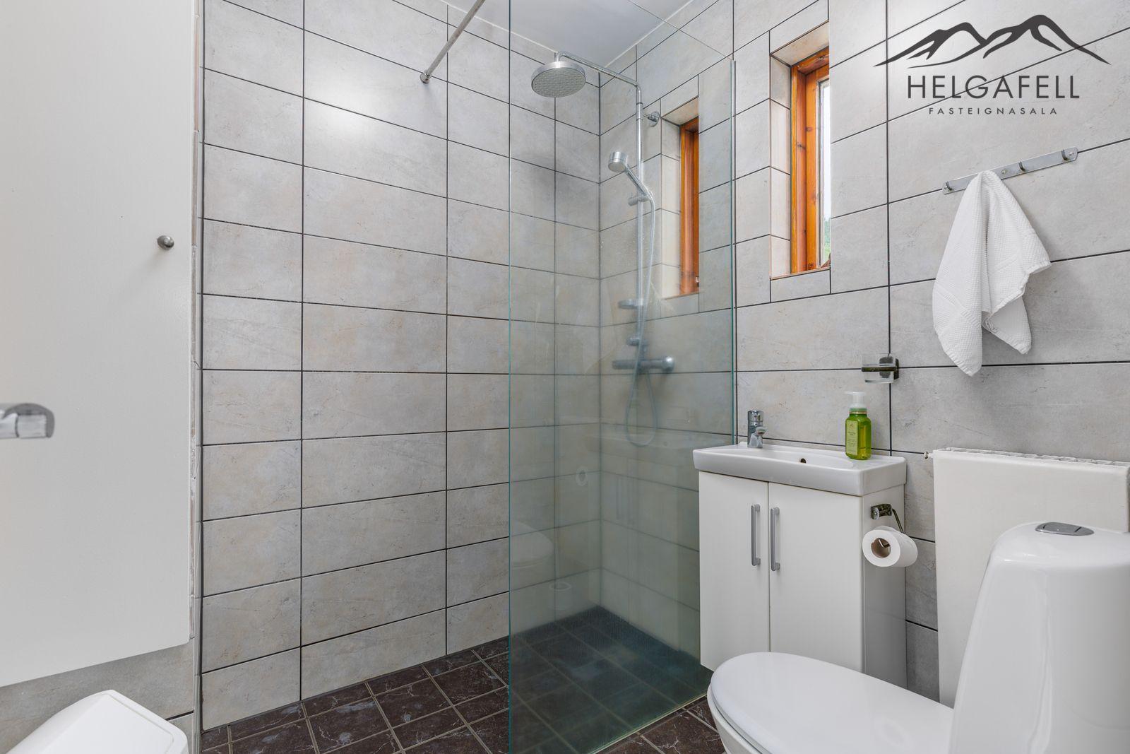 Þvottahús: Stórt flísalagt þvottahús með nýlegri sturtu í kjallara.