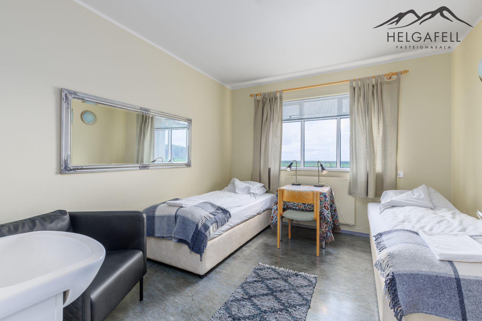 SMELLIÐ HÉR TIL AÐ FÁ SENT SÖLUYFIRLITSkipulag eignar: Húsnæðið skiptist í tvær íbúðir og í miðju hússins er gistiálma.Minni íbúð: Forstofa, eldhús, stofa/borðstofu, 3 - 4 svefnherbergi, baðherbergi, hol/gangur.