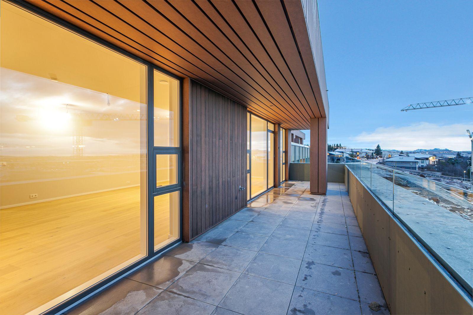 Fyrir utan kjallara sem er með sjónsteypu að utan og einangraður að innan. Þak er viðsnúið, steypt með halla, tvöfalt lag er af eldsoðnum tjörupappa, einangrað ofan á plötu og ferging. Svalir eru með steyptu yfirborði eða flísalagðar með flísahellum. Svalahandrið eru úr álprófílum og klæddir með öryggisgleri. Útiljós og rafmagnstengill eru á svölum. Gluggakerfi íbúða er frá Húsasmiðjunni og er ál-tré. Inngangshurðir í stigaganga eru álhurðir. Sameiginleg lóð verður frágengin skv. teikningum lóðahönnuða. Snjóbræðsla er í helstu göngustígum á lóð.