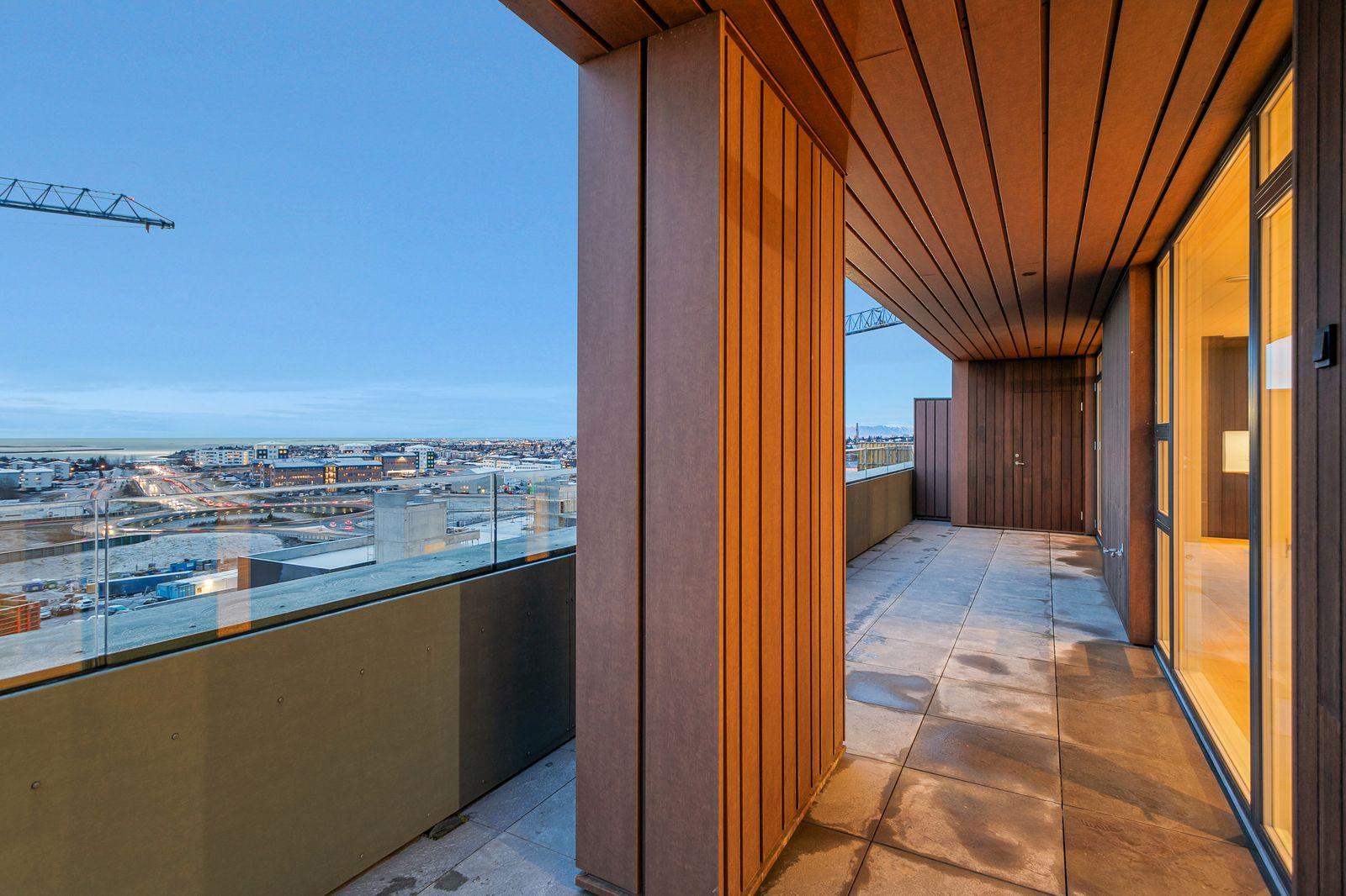 Birt heildarstærð séreignar er 142,8 fm. Íbúðinni fylgir sér stæði í bílakjallara merkt 01 B10.