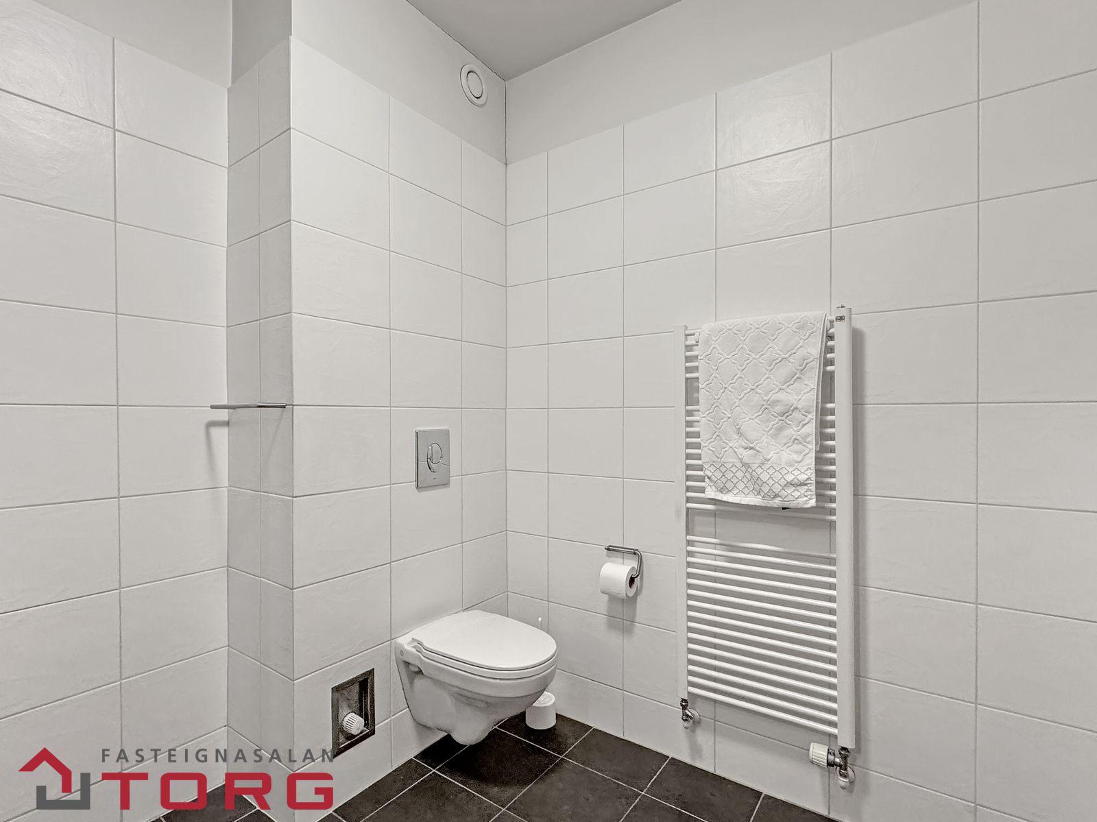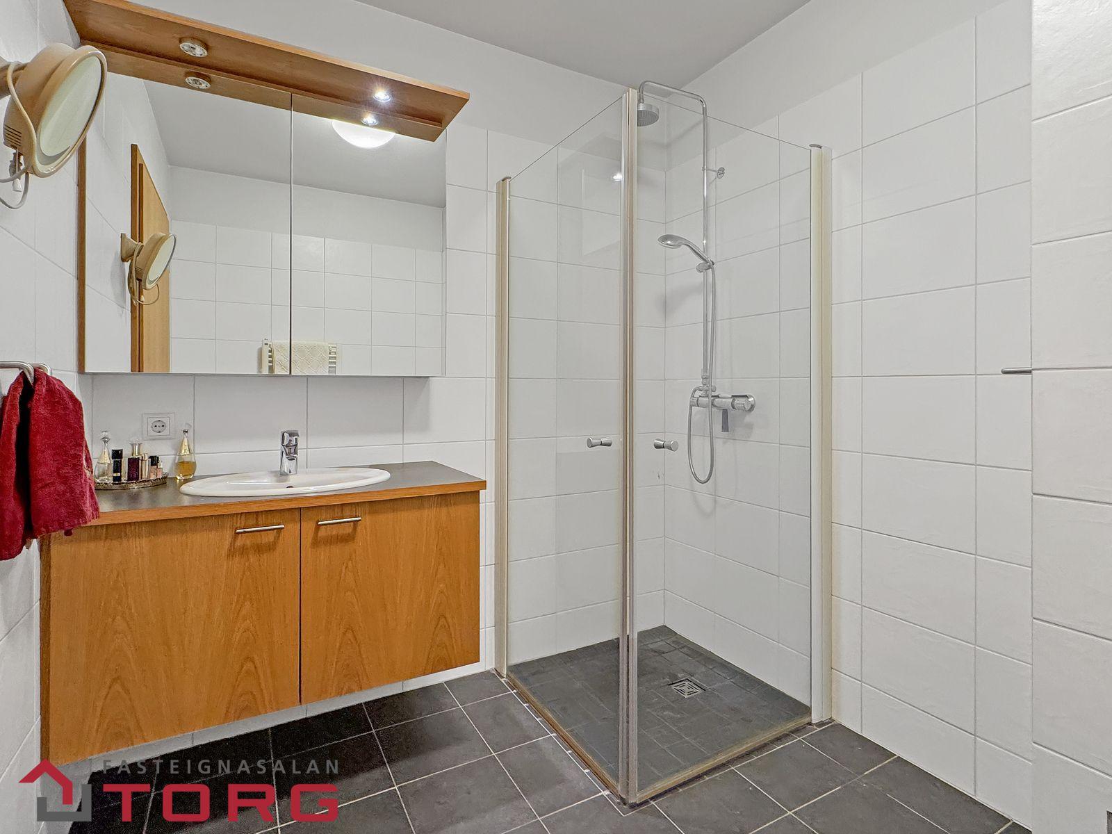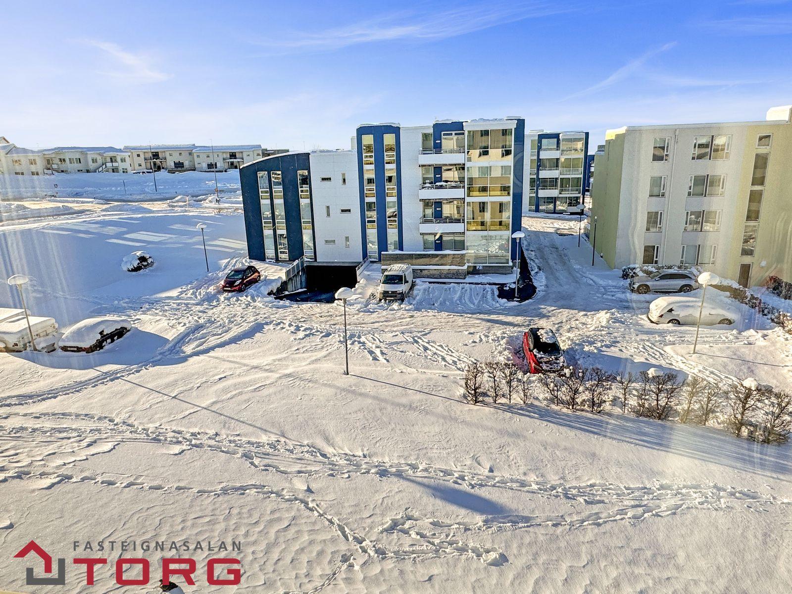 Nánari lýsing: Gengið er inn í rúmgóða forstofu með fataskáp sem nær alveg upp í loft. Frá forstofu er svo gengið inn í sjónvarpshol og þaðan inn í rúmgóða setustofu og borðstofu. Stofan er mjög björt og með fallegu útsýni. Gengið er inn í eldhúsið frá stofunni. Eldhúsið er með fallegri ljósri viðarinnréttingu sem nær alveg upp í loft. Helluborð, bakaraofn, ísskápur og uppþvottavél fylgja. Góður útsýnisgluggi er frá eldhúsi að svölum en gengið er út á svalir frá stofu. Svefnherbergið er nokkuð rúmgott og með fataskáp sem nær alveg upp í loft. Baðherbergið er flísalagt í hólf og gólf, með ljósri viðarinnréttingu með handlaug spegla skápum. Sturtan er með góðu aðgengi en hún er stúkuð af með hertu gleri sem opnast vel. Þvottaherbergi er innan íbúðar með flísum á gólfi og veggfestum hillum. Í kjallara er 11 fm sérgeymsla íbúðar ásamt sameiginlegri vagna- og hjólageymslu. Bílastæði íbúðar er í lokuðum bílakjallara, merkt B044.