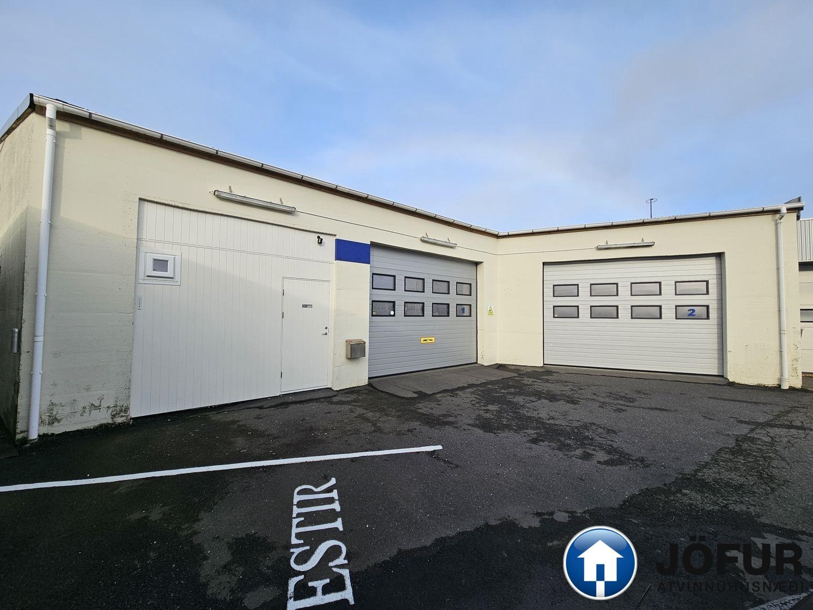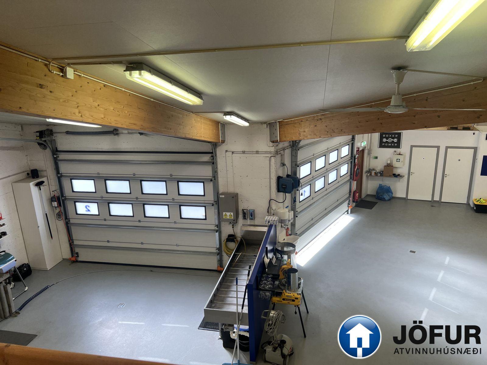 Neðri hæð: Góður vinnusalur, góð lofthæð yfir hluta salarins, um 2,7 m. undir millipalli, epoxy gólfefni, tvær innkeyrsluhurðir (H 3,0m. x B 4,0 Br.), tvær snyrtingar til staðar, herbergi/geymsla (ca.18 m²) sem er sprengjuheld.