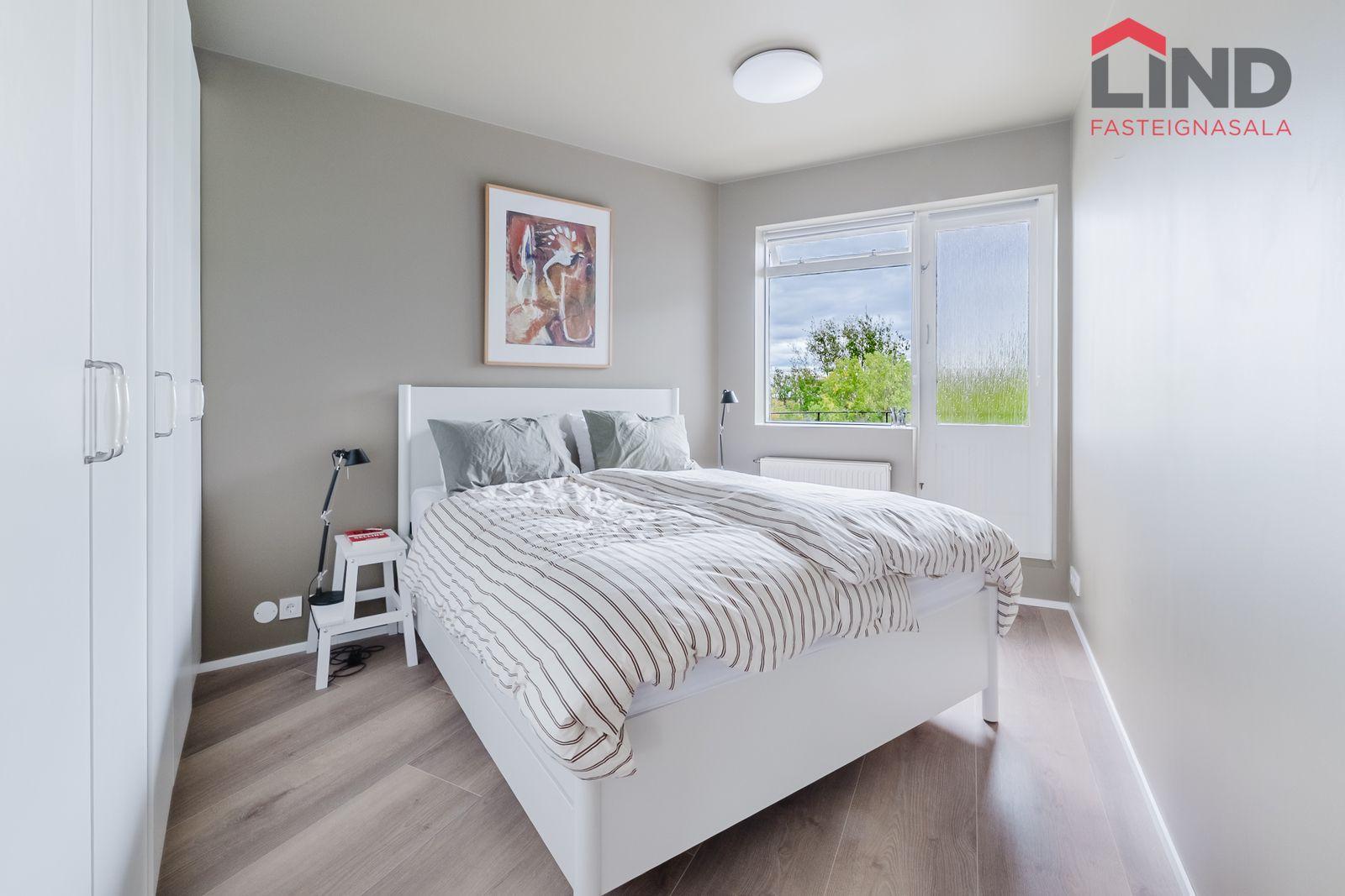 Svefnherbergi I er með parket á gólfi, fataskápum og útgengt á svalir til norðurs.