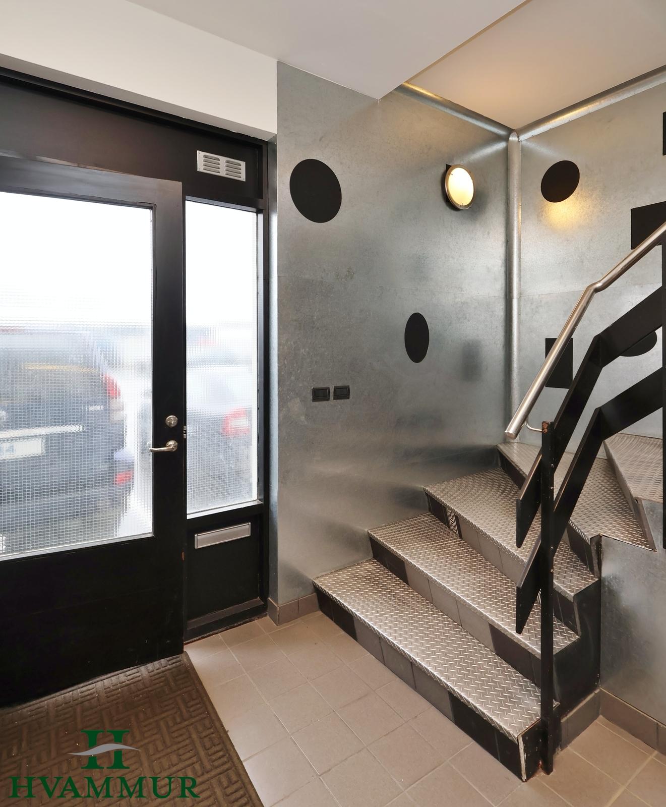 Anddyri er með flísum á gólfum og fatahengi. Þaðan er gengið upp stiga upp í aðal rými eignarinnar Holið er með flísum á gólfi og þaðan er gengið inn í öll rými. Skrifstofan er rúmgóð með flísum á gólfi. Innaf skrifstofu er lítil geymsla sem gæti nýst sem skjalageymsla. Salerni er með flísum á gólfum og viðarlitaðri innréttingu með flísum á milli skápa. Eldhúsið er með flísum á gólfi og lakkaðri innréttingu, inn af eldhúsinu er lítil ræstikompa. Salurinn er mjög rúmgóður með nýju harðparketi á gólfi. Stokkur með tölvutengjum fyrir margar starfsstöðvar ef rýmið er notað sem skrifstofurými.
