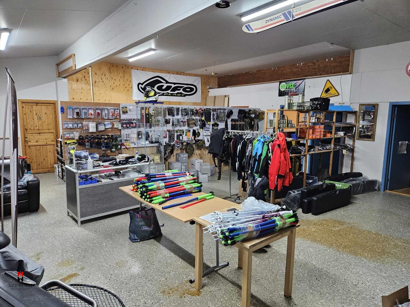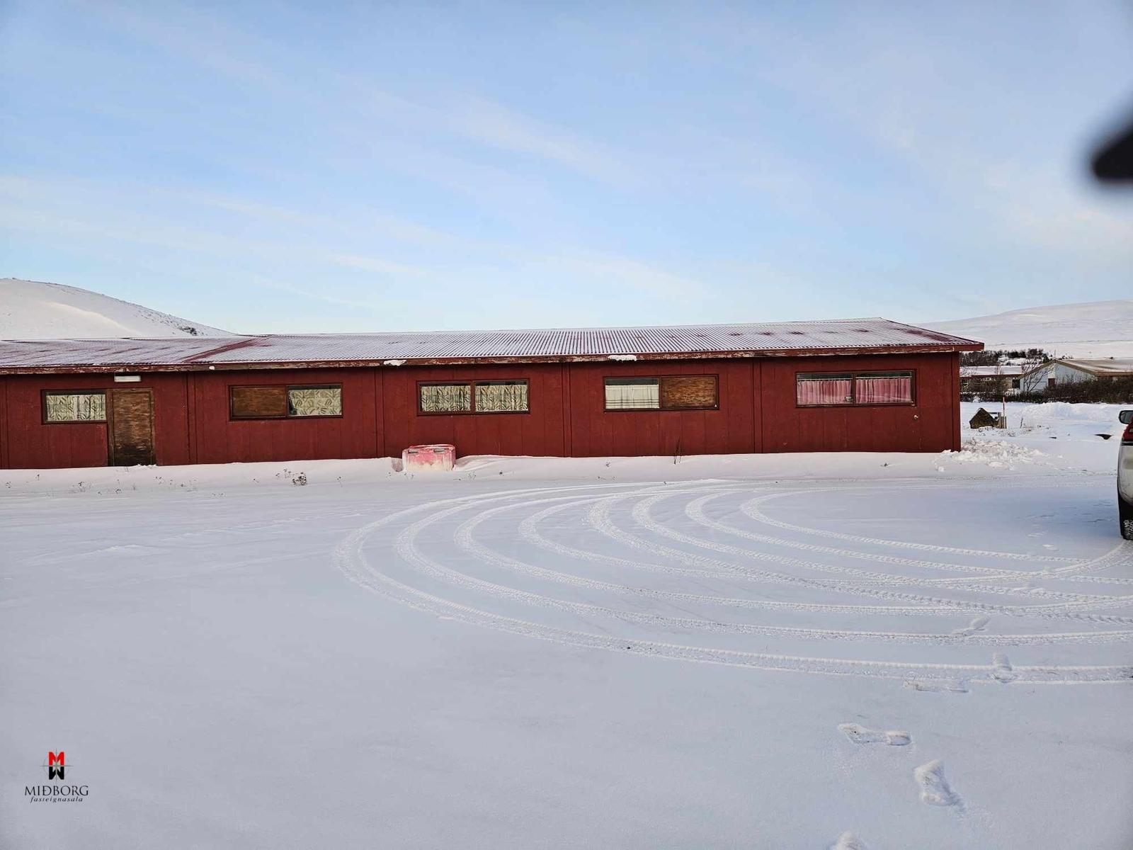 Nánari lýsing: Í dag er rekin verslun í ca. 120-130 fm. hluta í suðurenda hússins. Þar er salur með góðri lýsingu, skrifstofa, eldhúsaðstaða, snyrting, hitakompa, geymsla og herbergi. Epoxy á gólfi í sal, en stoðrými ýmist dúklögð eða með plastparketi. Léttur veggur í geymslusal/verkstæðishluta, sem í dag er nýttur til geymslu á hjólhýsum og ferðavögnum. Gönguhurð er í þann hluta, en auðvelt að koma þar fyrir innaksturshurð, ef húsinu yrði skipt upp í fleiri einingar. Opið er á milli í nýrri hluta hússins (301,1 fm.) , en þar er stór innaksturshurð og gönguhurð. Pússuð gólf með niðurföllum og góð lýsing.