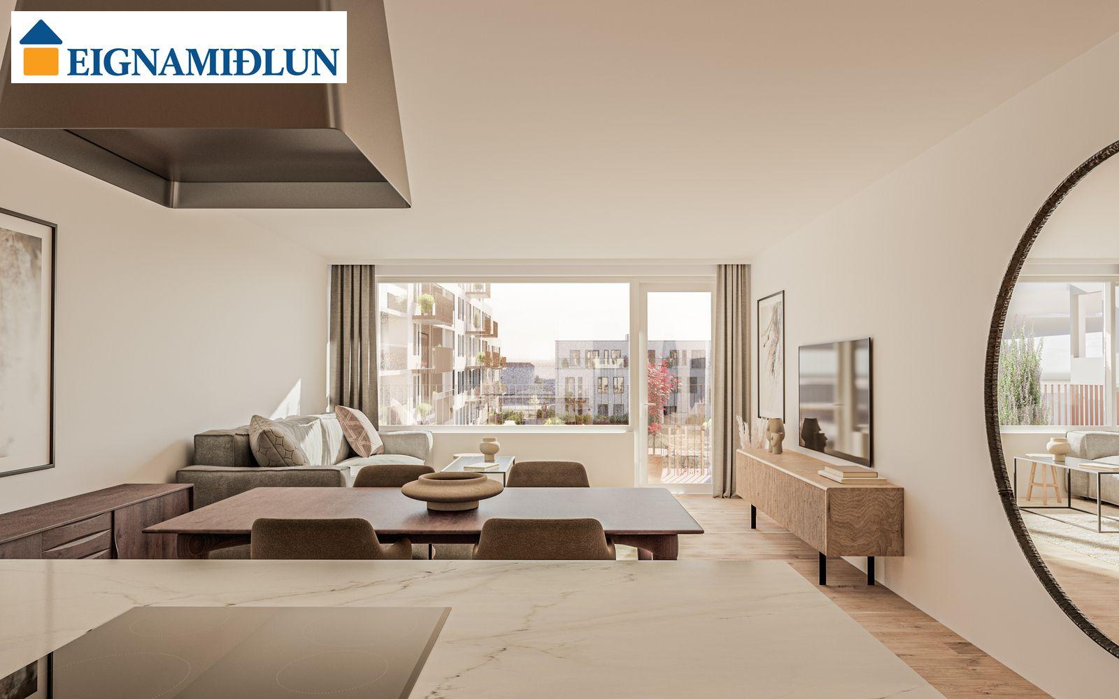 INNRÉTTINGAR: Eldhúsinnréttingar eru sérsmíðaðar frá Selós. Skápar eru úr vönduðu stitsterku melamin efni. Vönduð heimilistæki eru í íbúðum sem eru frá AEG. Kæli-/frystiskápur og uppþvottavél eru innbyggð í innréttinguna og spanhelluborð. Dekton – Rem steinborðplötur eru í öllum eldhúsum og Silestone – Nolita steinborðplötur eru á böðum. Gólfhiti er í gólfi baðherbergis auk handklæðaofns. Bílastæði í kjallara fylgja öllum íbúðum og möguleiki er á að kaupa viðbótarstæði.