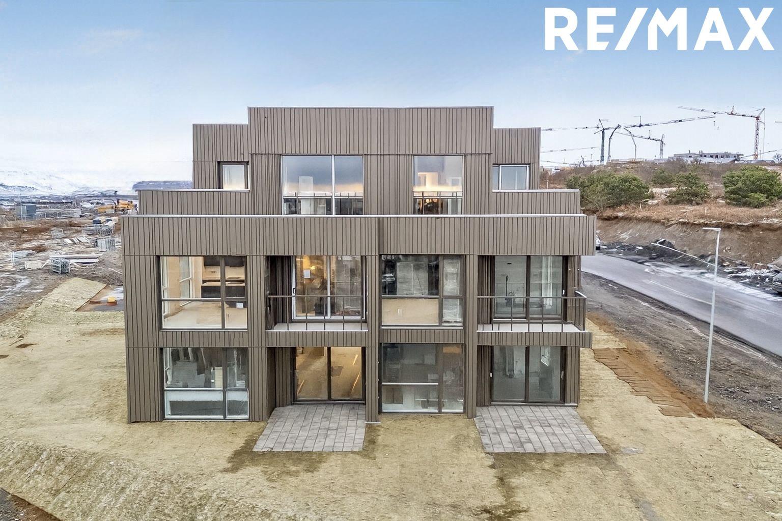 Húsið:Arkitektar og aðalhönnuðir hússins eru Sen&Son arkitektar ehf. Húsið er steinsteypt þriggja hæða fjölbýlishús með 7 íbúðum í einum stigagangi með lyftu. Á 1. hæð er anddyri, geymslur íbúða, tæknirými og tveir innbyggðir bílskúrar. Á 1. hæð eru einnig tvær glæsilegar íbúðir með beinu aðgengi út í garð. Á 2. hæð hússins eru þrjár virkilega flottar íbúðir og á 3. hæð hússins eru svo tvær stórglæsilegar íbúðir, en með þeim fylgja bílskúrarnir. Á lóðinni er bílageymsla með 7 bílastæðum. Bílageymslan er opin að hluta með lokuðum hliðum og upphituðu gólfi. Gert er ráð fyrir lagnaleið að hverju stæði fyrir möguleika á rafhleðslustöð.