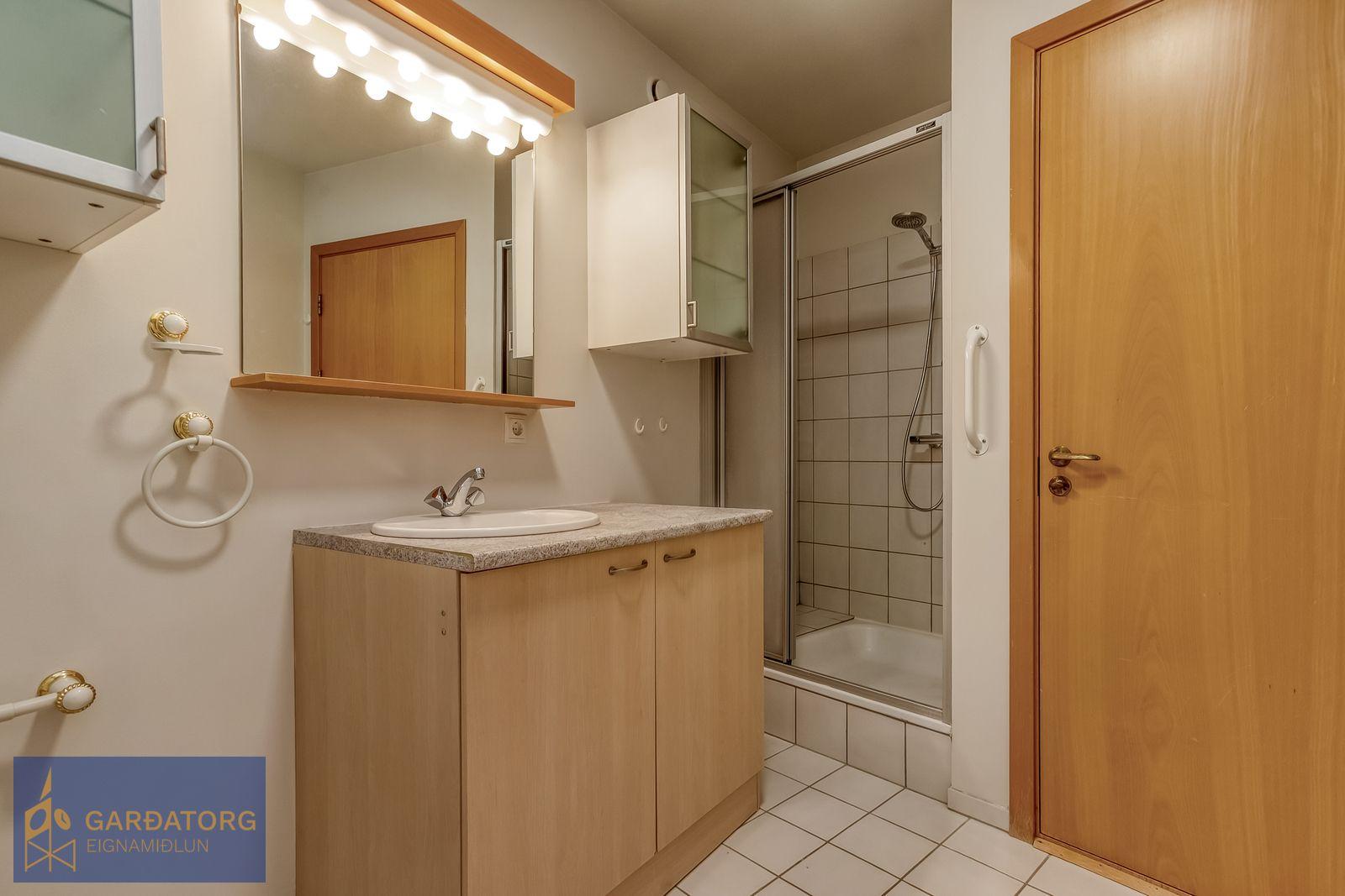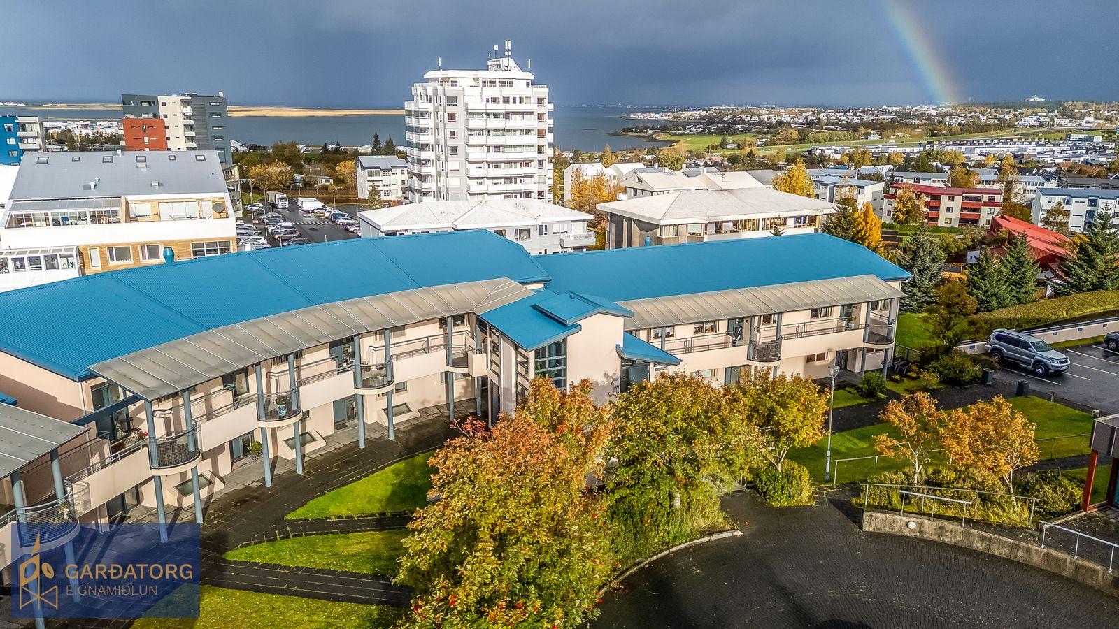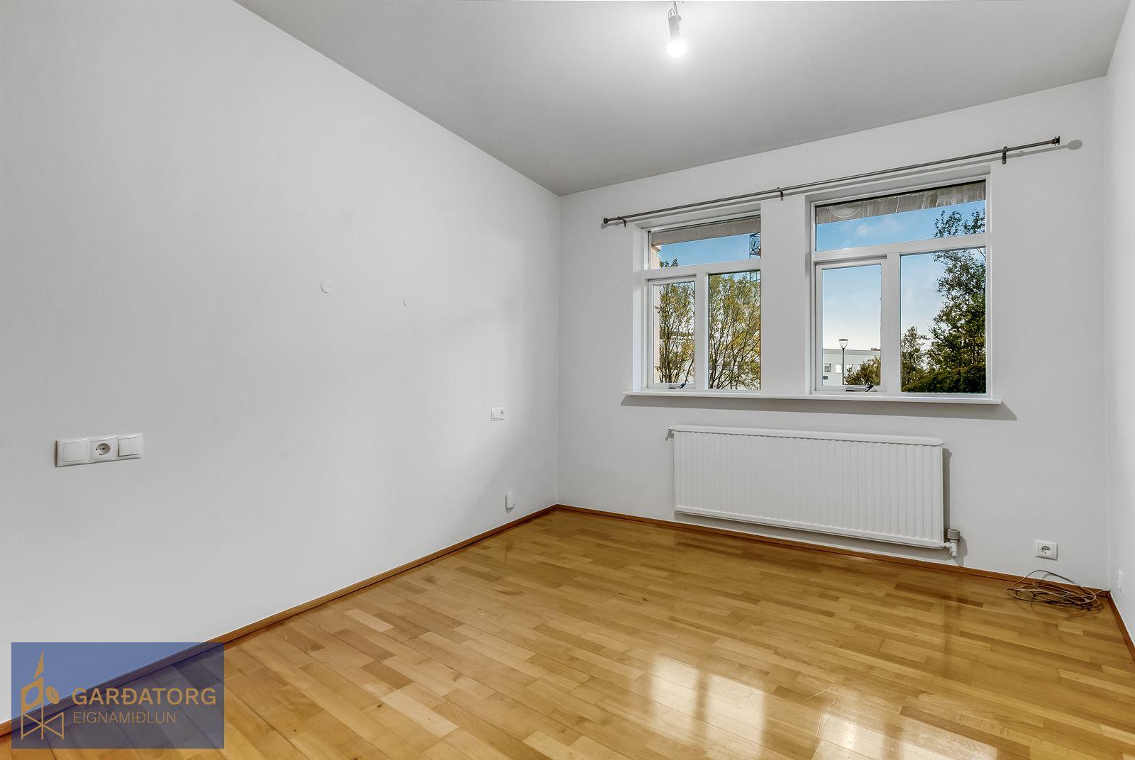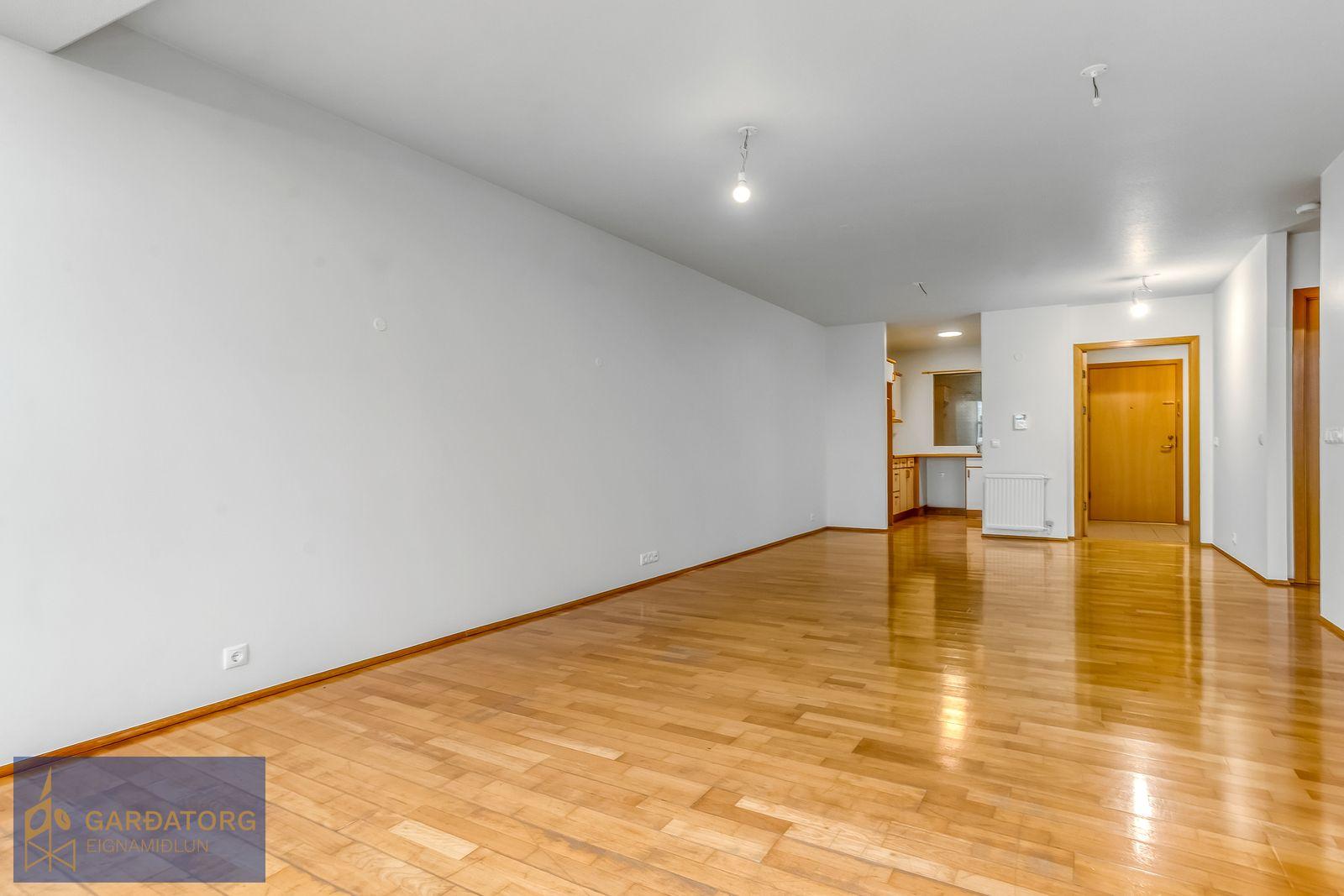 Nánari lýsing: Komið er inn í rúmgóða forstofu með stórum fataskápum og flísum á gólfi. Stofa er björt, með stórum fallegum gluggum og parketi á gólfi. Úr stofu er gengið út á hellulagða verönd. Opið er úr stofu inn í eldhús. Í eldhúsier ljós innrétting með góðu skápaplássi. Í svefnherbergi eru fataskápar og parket á gólfi. Á baðherbegi eru flísar á gólfi, sturta og tengi fyrir þvottavél og þurkara. Sér geymsla er í sameign. Íbúðin er alls skráð 72,6fm að stærð.