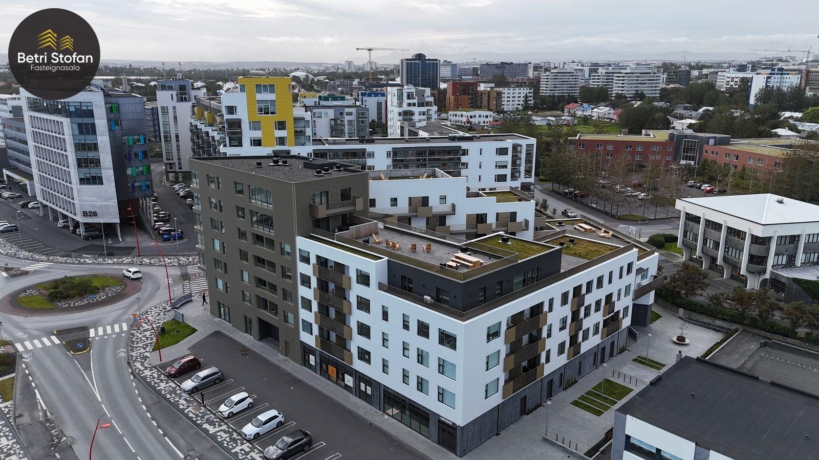 Frágangur utanhúss: Húsið er staðsteypt, einangrað að utan og klætt með viðhaldsléttri álklæðningu eða sambærilegu efni. Timbur/ál gluggar. Lóð og bílastæði: Sameiginlegur inngarður er á 2. hæð og sameiginlegar þaksvalir eru á 4. hæð. Í bílakjallara eru 39 bílastæði, þar af 4 fyrir hreyfihamlaða, og 30 bílastæði eru á lóð. Bílastæði fyrir hreyfihamlaða er einnig á plani við aðalinngang. Hiti og rafmagn: Hiti er sameiginlegur og reiknast samkvæmt hlutfallstölu en rafmagn er á sérmæli fyrir hverja íbúð.