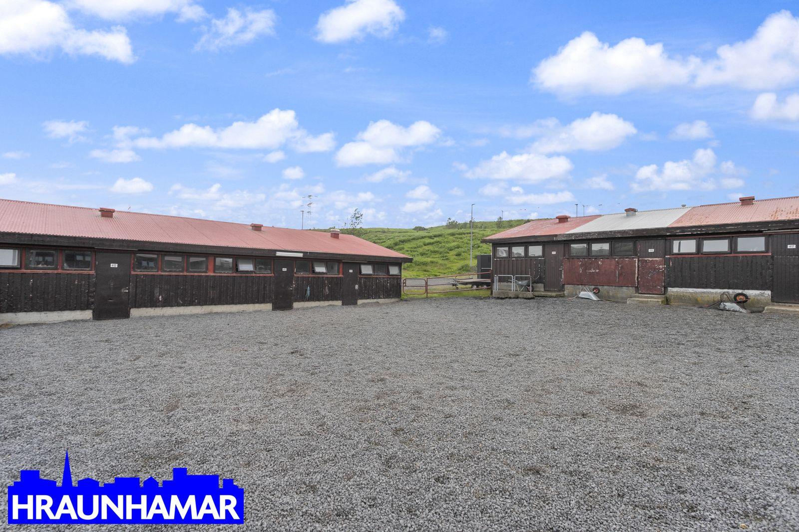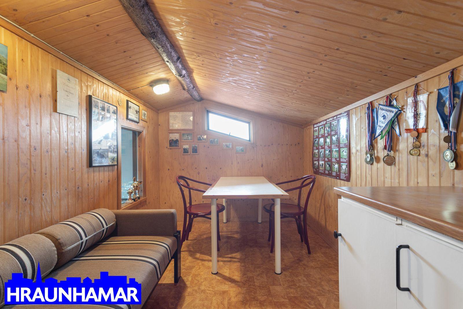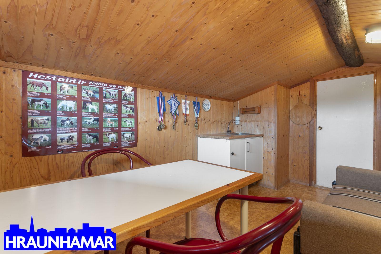 Húsið er innréttað fyrir 10 hesta (gamla reglugerðin) Fimm 2ja hesta stíur, hlaða, kaffistofa á efri hæð (ekki í fm tölu eignar) snyrting, ofl. Milligerði eru úr galvinseruðu efni og plasti og því viðhaldslétt. Gerði er og taðþró er sameigninlegt.
