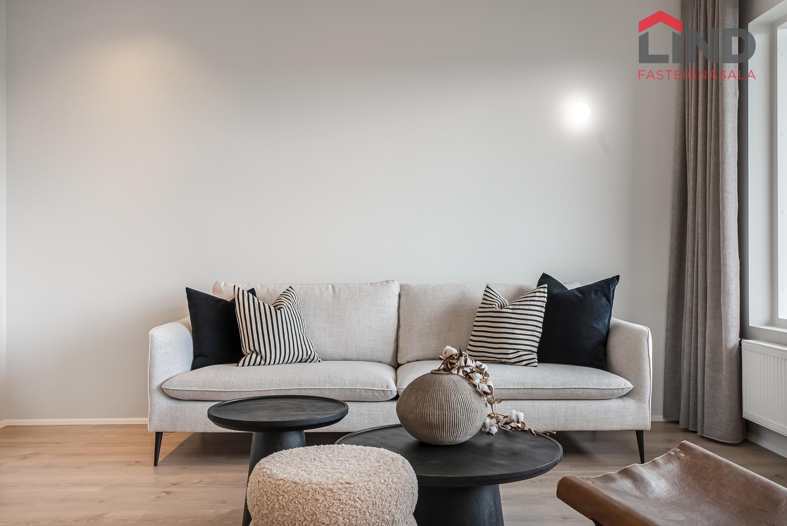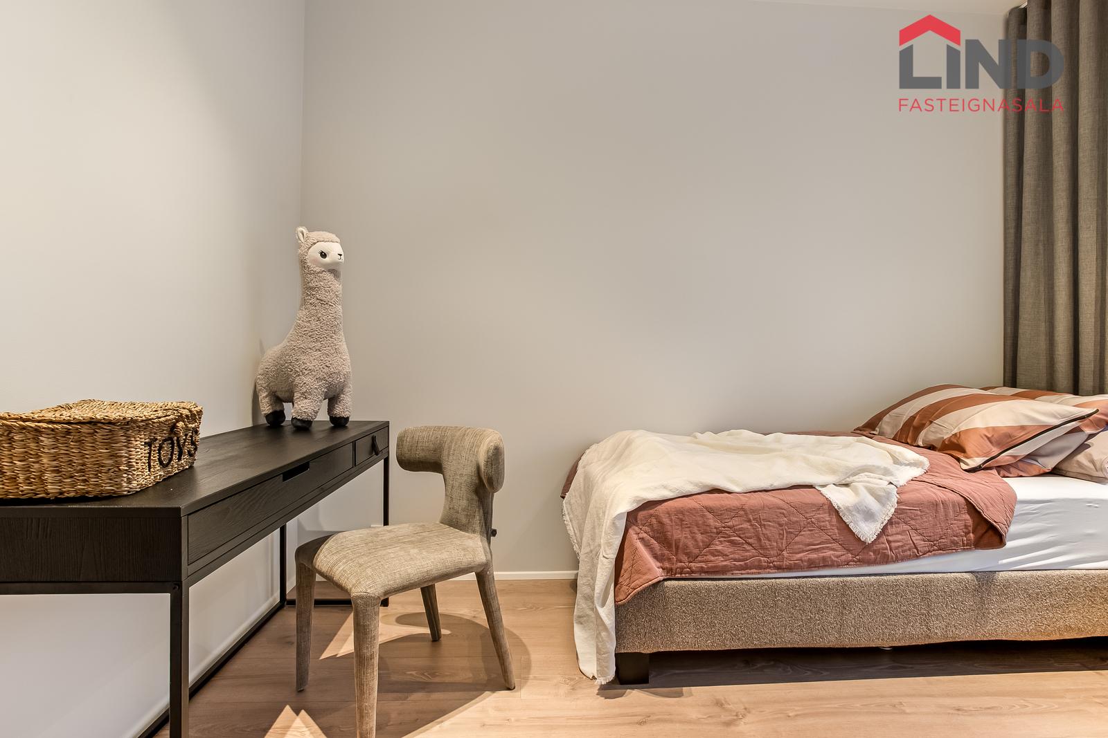Eldhús: Parket á gólfi, gott skápa- og borðpláss. Innréttingin er frá Selós, með matt beige og grábrúnar framhliðar. Borðplötur eru úr 20 mm Quartz-steini með undirlímdum vaski úr stáli. Eldhústæki eru frá AEG. Innbyggður ísskápur, frystir og uppþvottavél fylgja. Skúffur eru með mjúklokunarbúnaði og LED-lýsing er undir efri skápum. Höldur eru svartar griphöldur frá Selós.