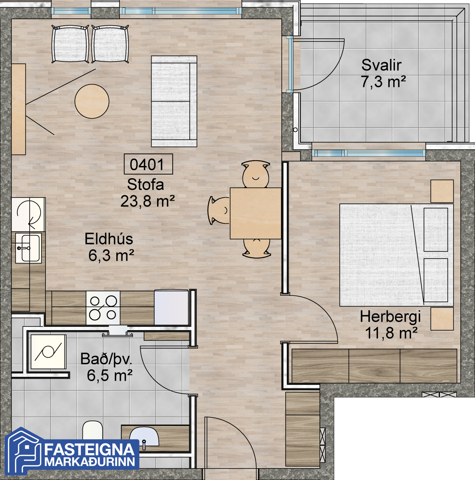 Fasteignamarkaðurinn ehf. sími 570-4500 kynnir til sölu glæsilega og vel skipulagða 2ja herbergja íbúð á 4. hæð, íbúð 0401, í 6. hæða nýbyggðu lyftuhúsi á frábærum stað við Bolholt 7-9 Reykjavík. Íbúðin er 60,9 fermetrar þar af er geymsla 4,4 fermetrar. Bílastæði í bílakjallara fylgir ekki íbúðinni.