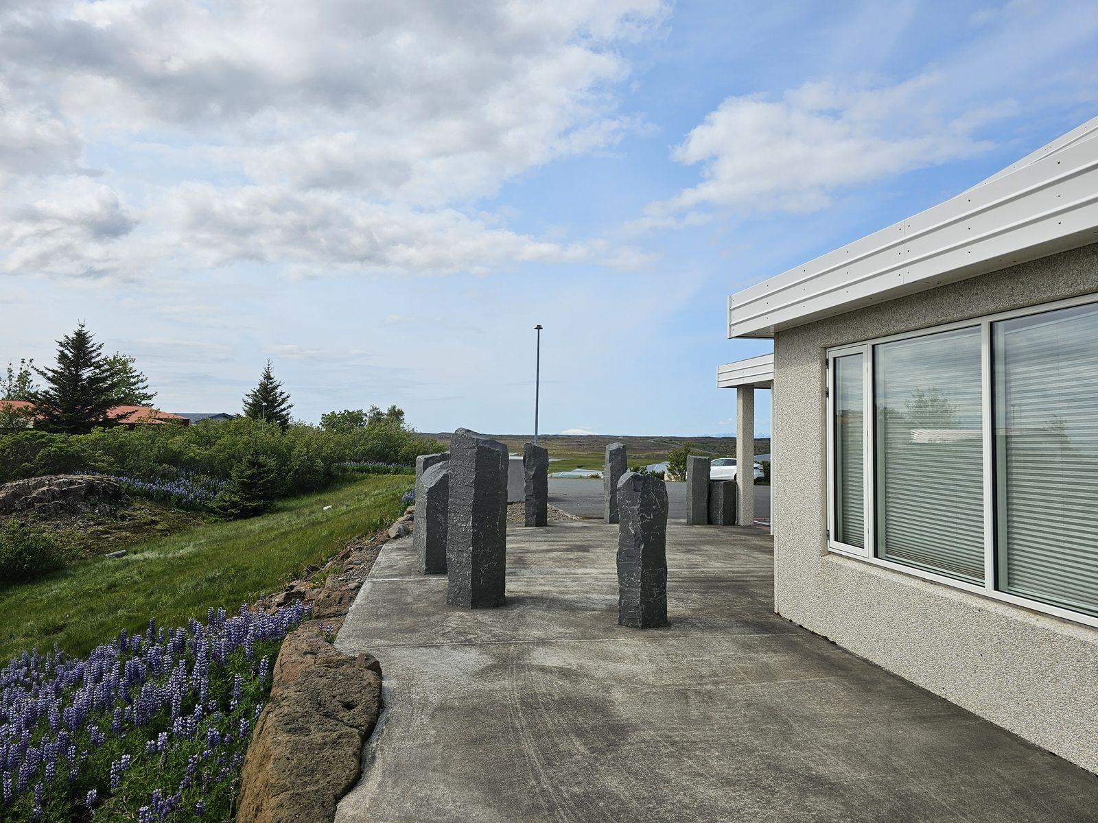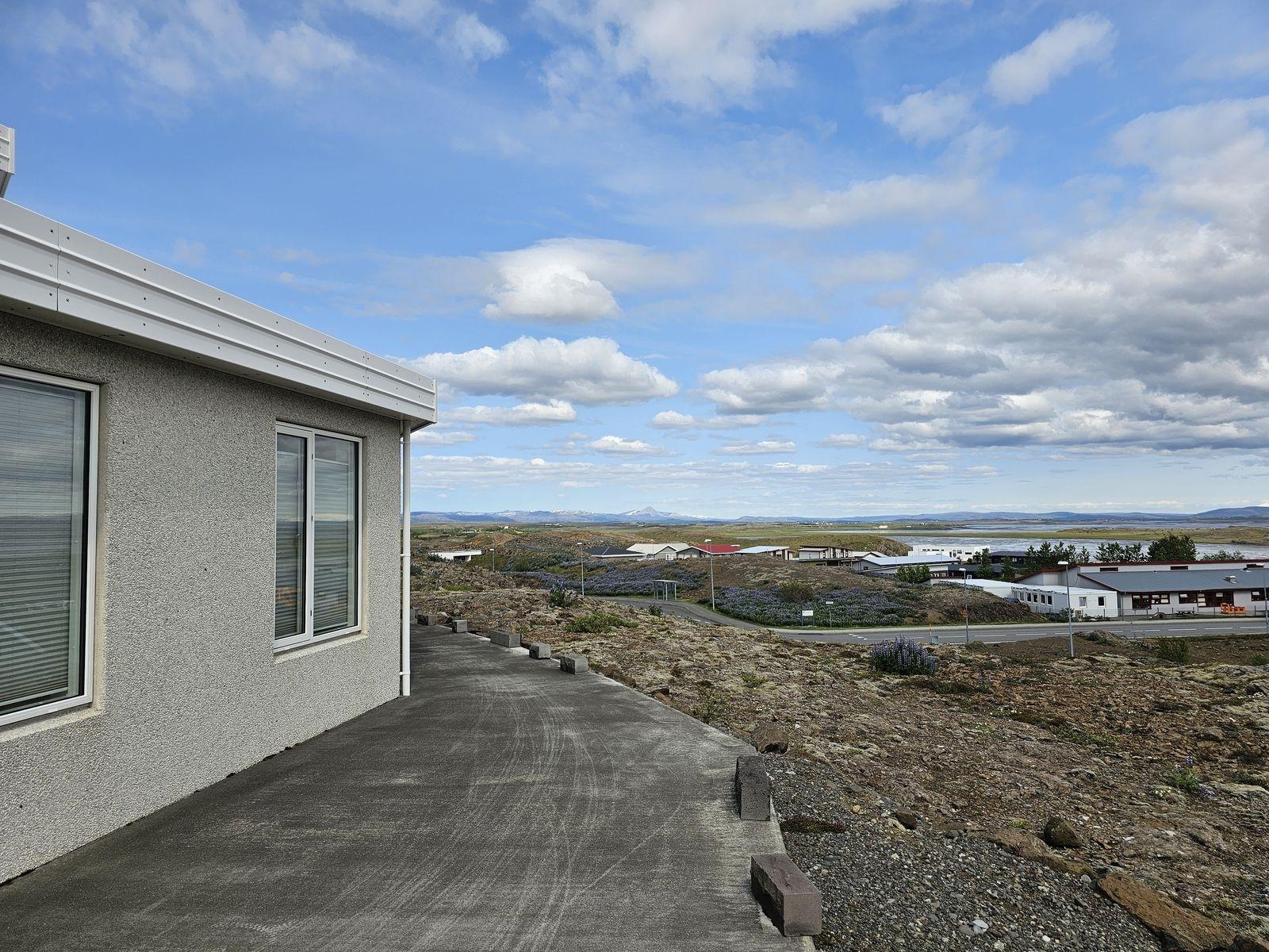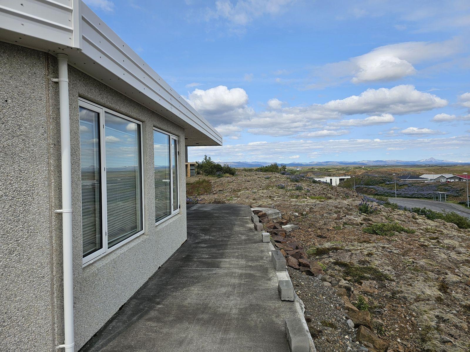 Bílskúrinn: Er 38,1 fm. Góðar innkeyrsludyr b 3,20 og h 2,40. Gólf er laggt epoxy Gengt er úr bílskúrnum út á bílastæði. Umhverfi hússins er allt frágengið. Bílaplan er malbikað og hellulögð stétt við útidýr. Steypt stétt og verönd er með öðrum hliðum hússins. Lagt er fyrir heitum potti á veröndinni. Húsið stendur hátt og er lóðin mjög sérstök þar sem klappir og holtagrjót er í bland.