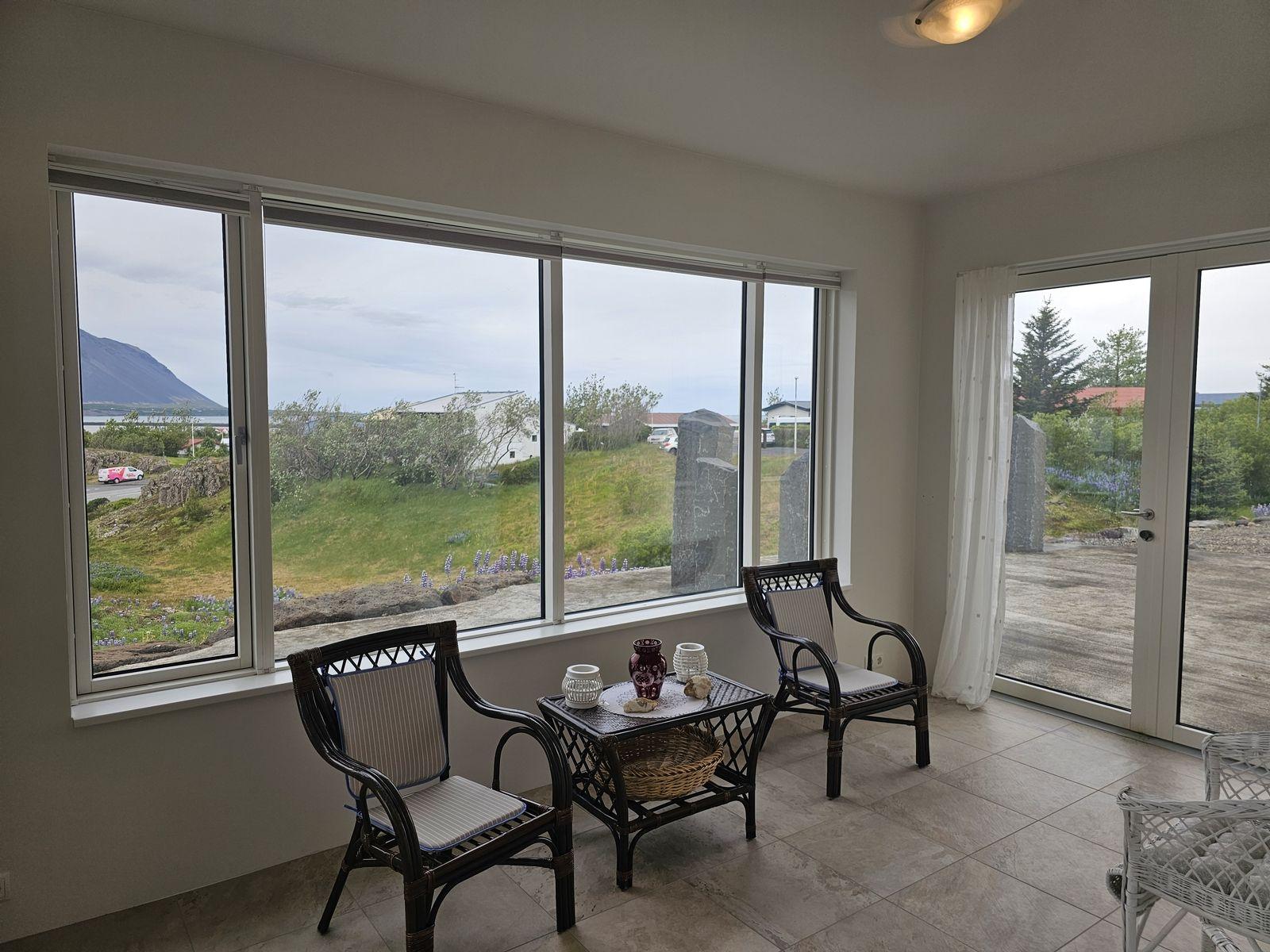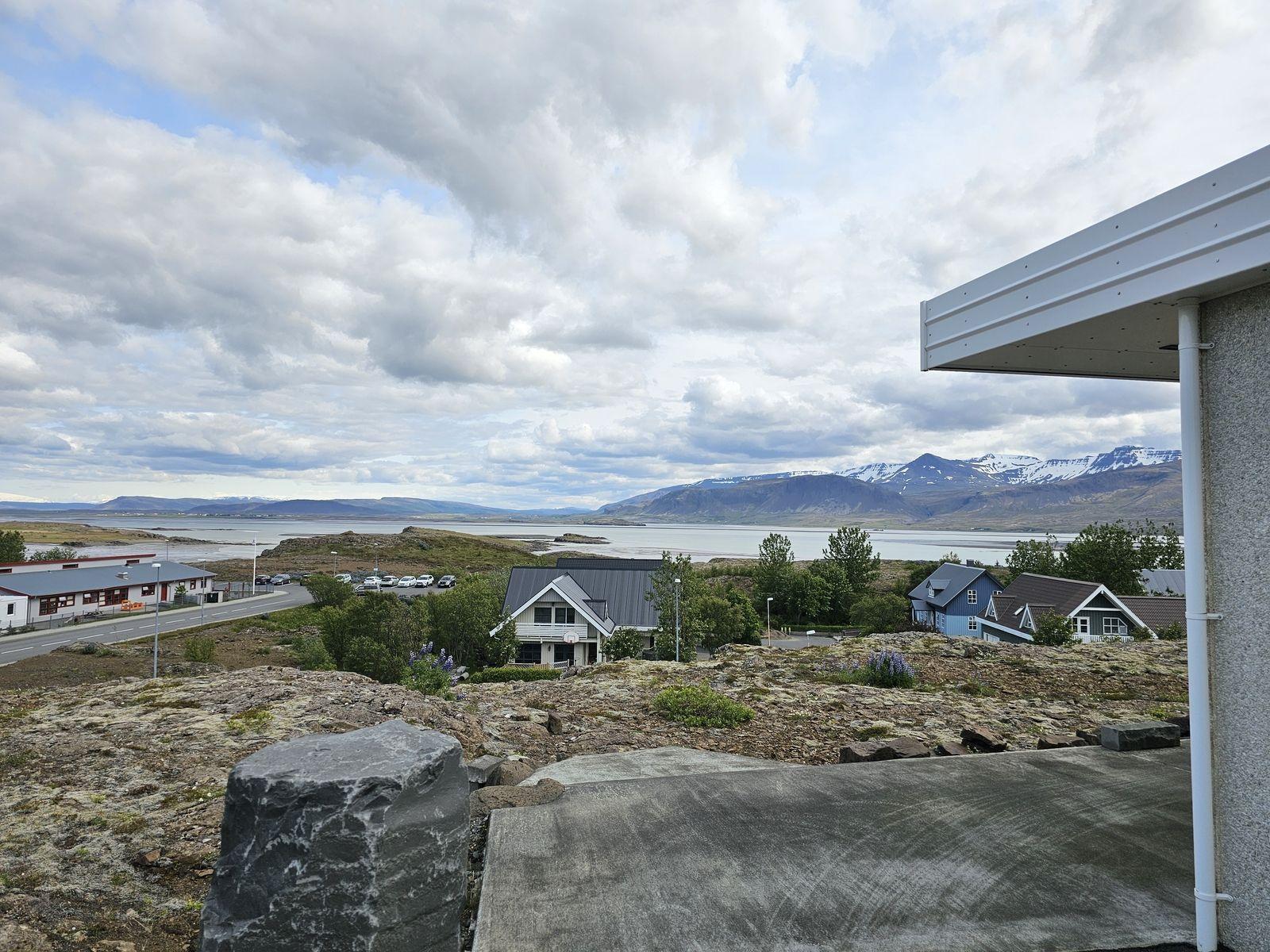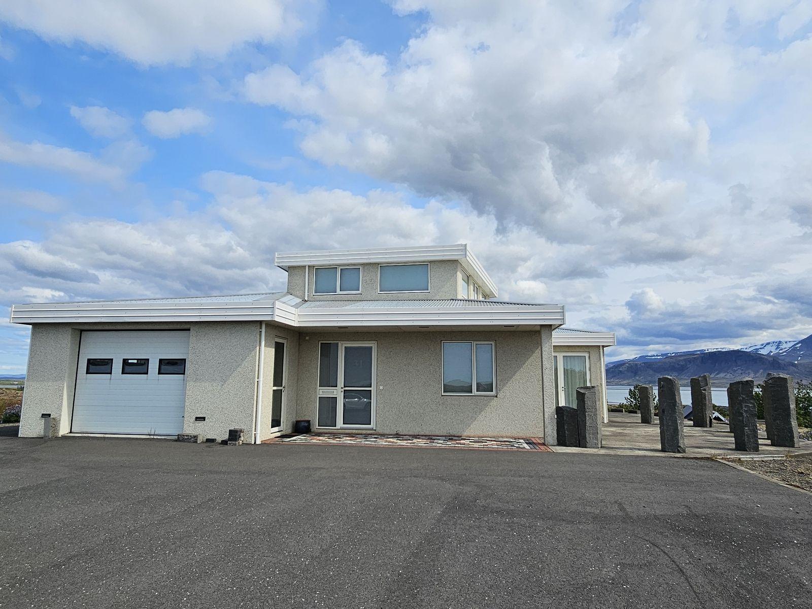 Nánari lýsing 1. hæð: Anddyri: Mjög rúmgóður fataskápur. Gestasnyrting: Er inn af anddyri. Spegill yfir vaski, flísar á veggjum og vegghengt salerni. Hol: Þaðan er gengið upp flísalagðar tröppur á efri hæðina og í herbergi, baðherbergi og alrými og þvottahús. Svefnherbergi: Eru 2, mjög rúmgóð og bæði með fataskápum. Baðherbergi: Er flísalagt í hólf og gólf með fallegri innréttingu . Vegghengt salerni, tvær handlaugar, speglaskápur og walk-in flísalagður sturtuklefi. Gengt er úr baðherbergi í sólstofu. Sólstofa: Mikið útsýni og þaðan er gengt út á steypta verönd. Einnig innangengt um veglega rennihurð með frönskum gluggum í stofuna. Stofur: Eru bjartar og rúmgóðar með miklu útsýni yfir Borgarfjörð. Úr borðstofunni er gengið út á steypta veröndina. Eldhús: Vönduð og rúmgóð innrétting (eik). Eyja með skápum og borði til að matast við. Bakarofn og örbylguofn í vegg og helluboð í borðplötu. Þvottahús: Er flísalagt í hólf og gólf með góðri innréttingu. Úr þvottahúsi er innangengt í bílskúrinn og einnig út á baklóðina. Stigi: Upp á efri hæð er flísalagður, handrið úr ryðfríu stáli og harðviður.