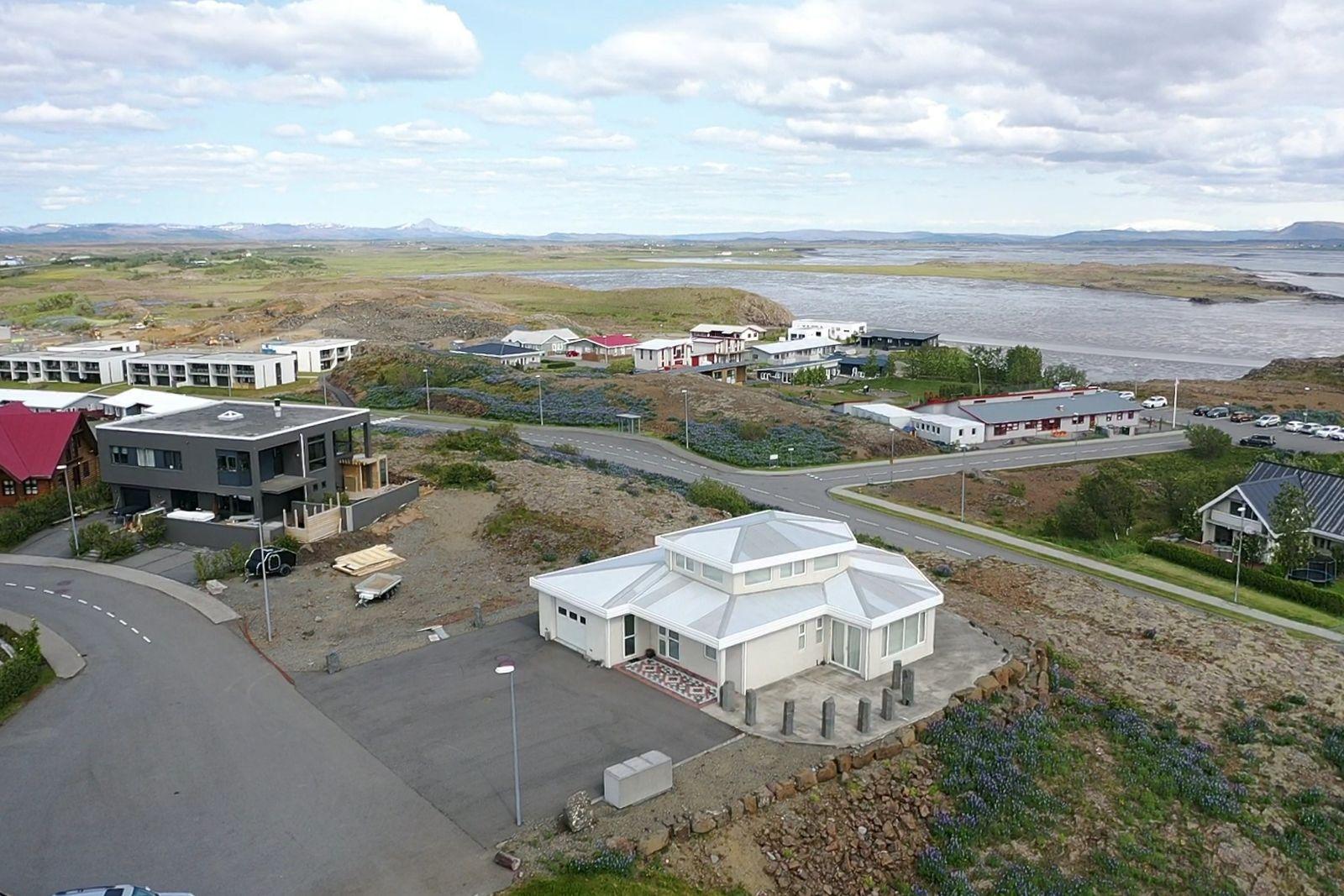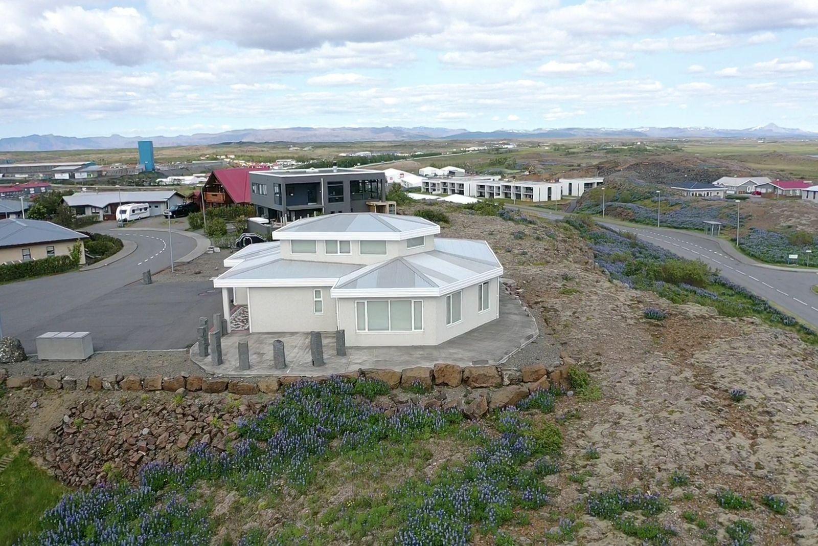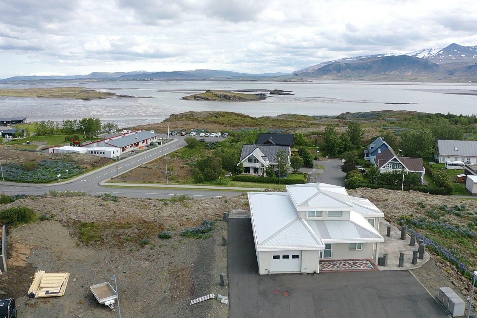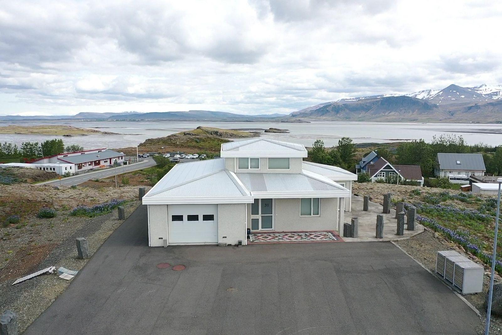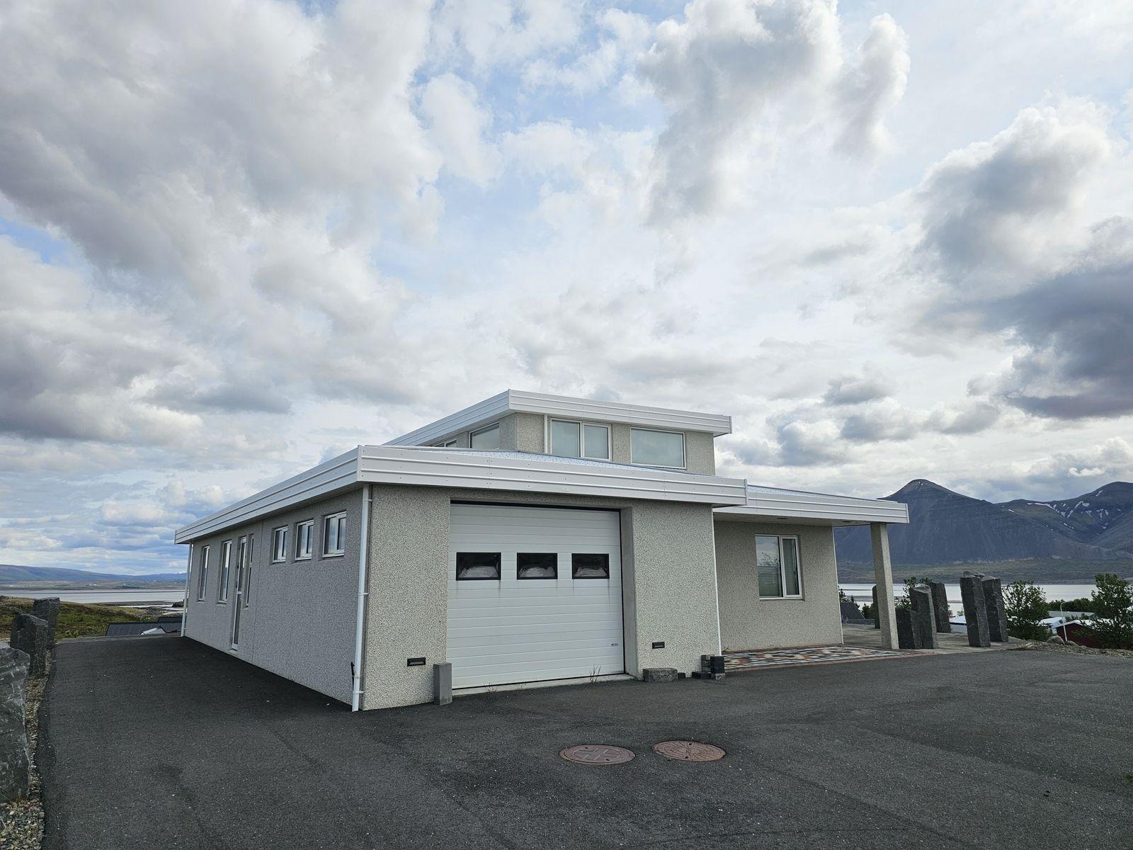 Húsið er byggt úr forsteyptum einingum og sömuleiðis er allir milliveggir í húsinu forsteyptir. Húsið skiptist í anddyri, hol, gestasnyrtingu, stofa og eldhús mynda alrými, tvö svefnherbergi, sólstofu, baðherbergi, þvottahús og bílskúr. Á efri hæðinni er 46,6 fm alrými með 360° útsýni. Öll gólf í íbúðinni eru flísalögð með gólfhita. Varmaskiptir er á neysluvatni. Allar innréttingar eru sérsmíðaðar með vönduðum hætti. Vönduð gluggatjöld fylgja frá Zeta Brautum. Næturlýsing er bæði innan húss og utan.