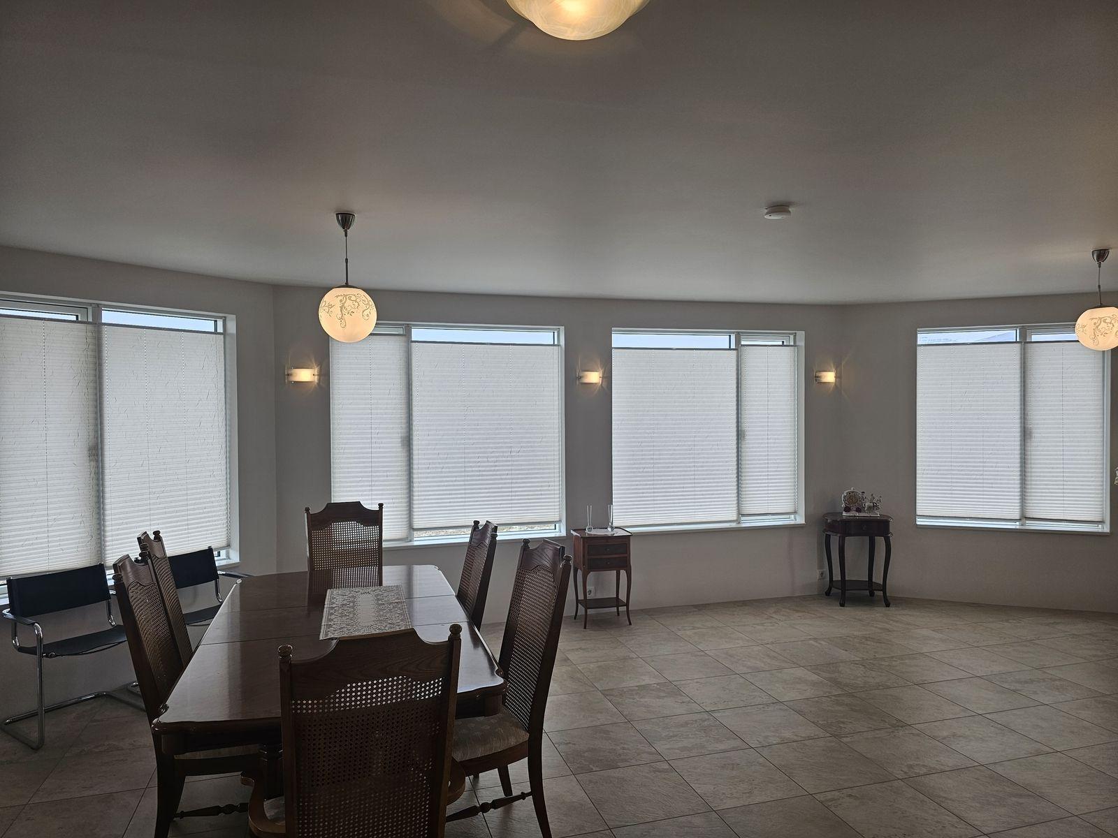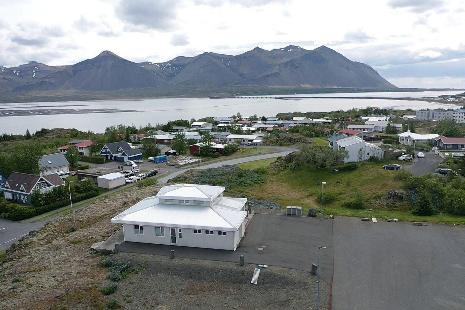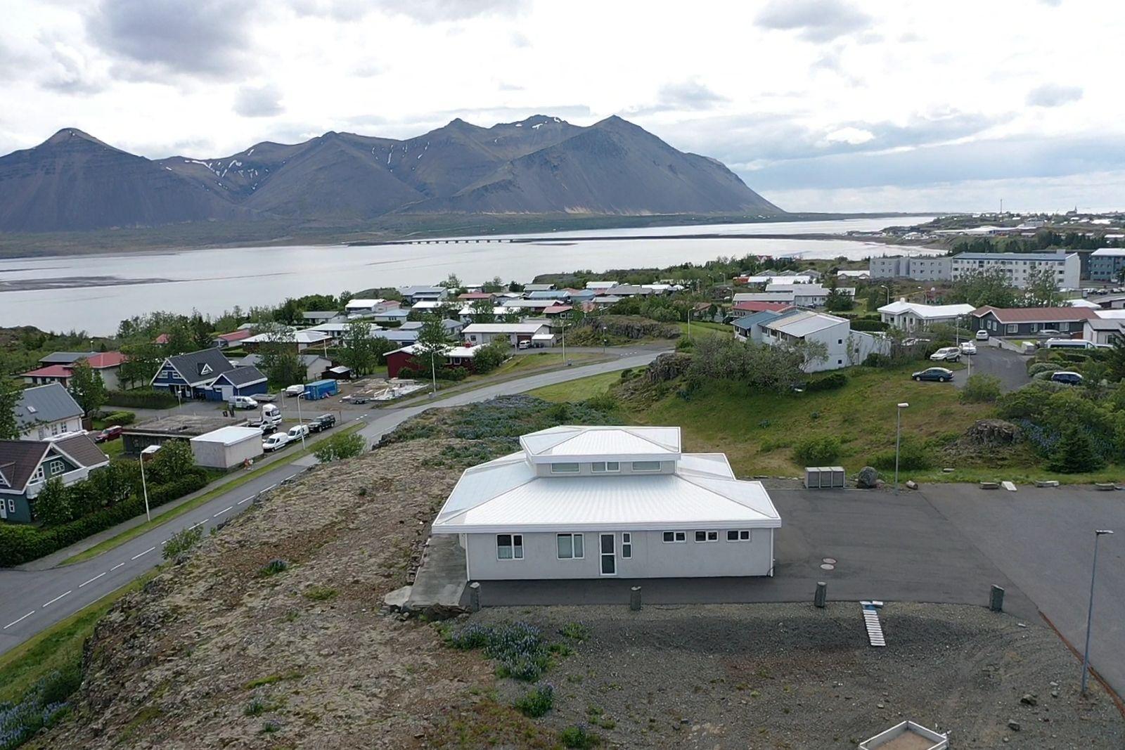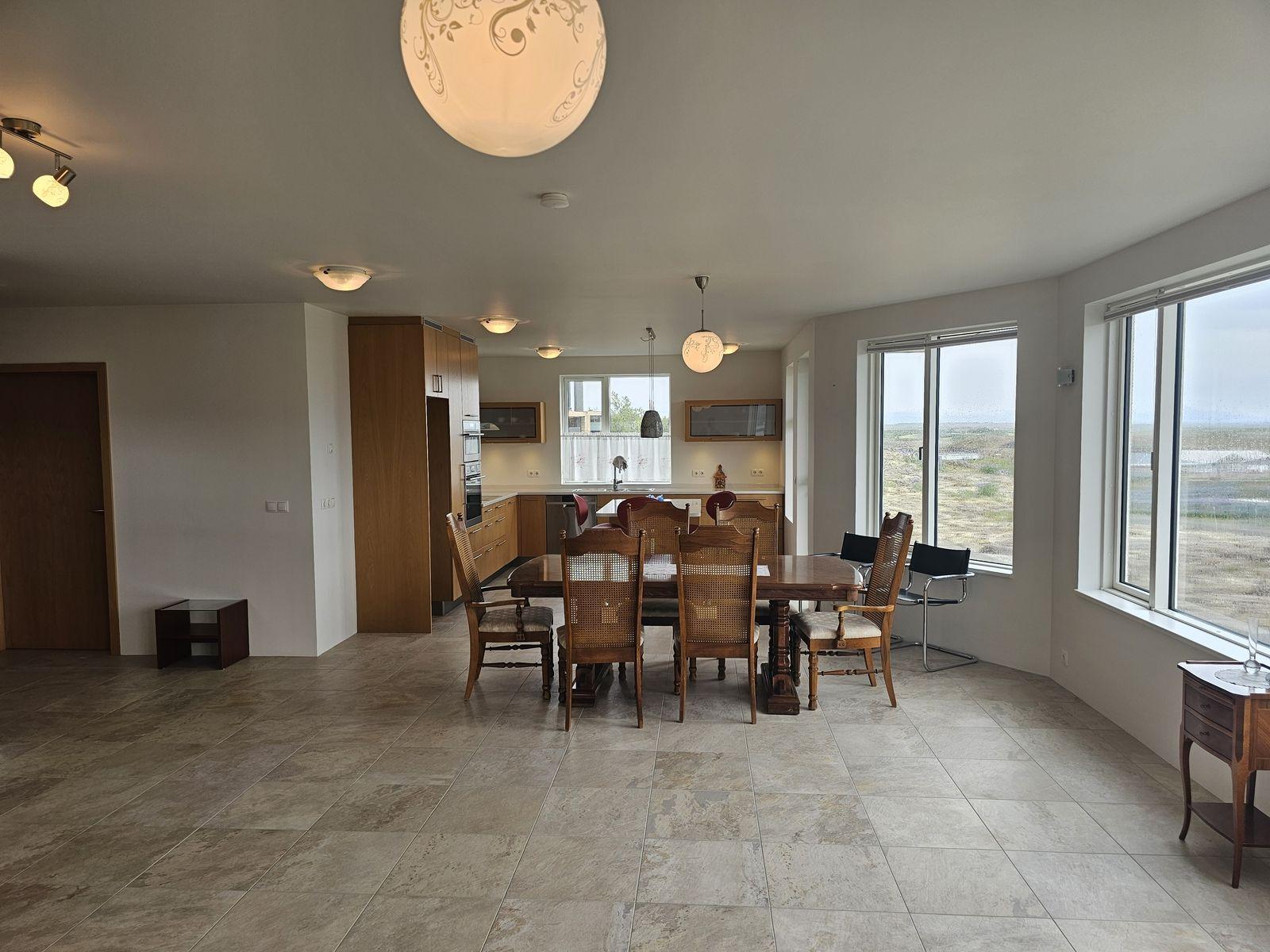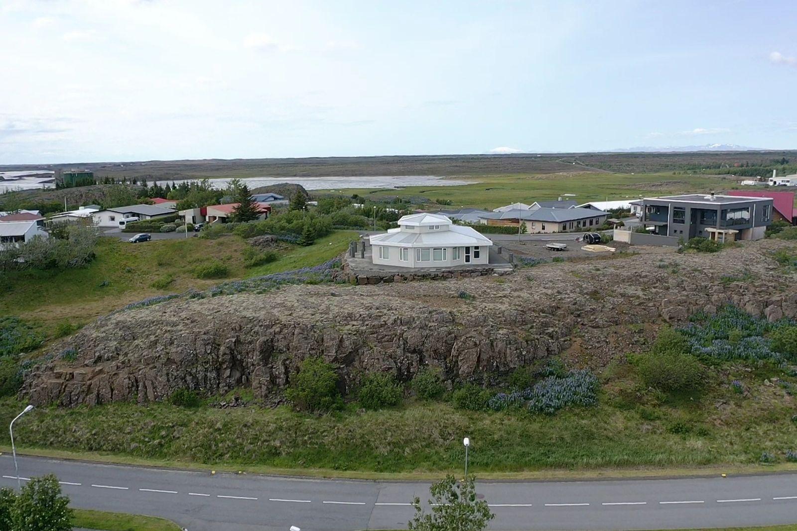 Húsið er byggt úr forsteyptum einingum og sömuleiðis er allir milliveggir í húsinu forsteyptir. Húsið skiptist í anddyri, hol, gestasnyrtingu, stofa og eldhús mynda alrými, tvö svefnherbergi, sólstofu, baðherbergi, þvottahús og bílskúr. Á efri hæðinni er 46,6 fm alrými með 360° útsýni. Öll gólf í íbúðinni eru flísalögð með gólfhita. Varmaskiptir er á neysluvatni. Allar innréttingar eru sérsmíðaðar með vönduðum hætti. Vönduð gluggatjöld fylgja frá Zeta Brautum. Næturlýsing er bæði innan húss og utan.