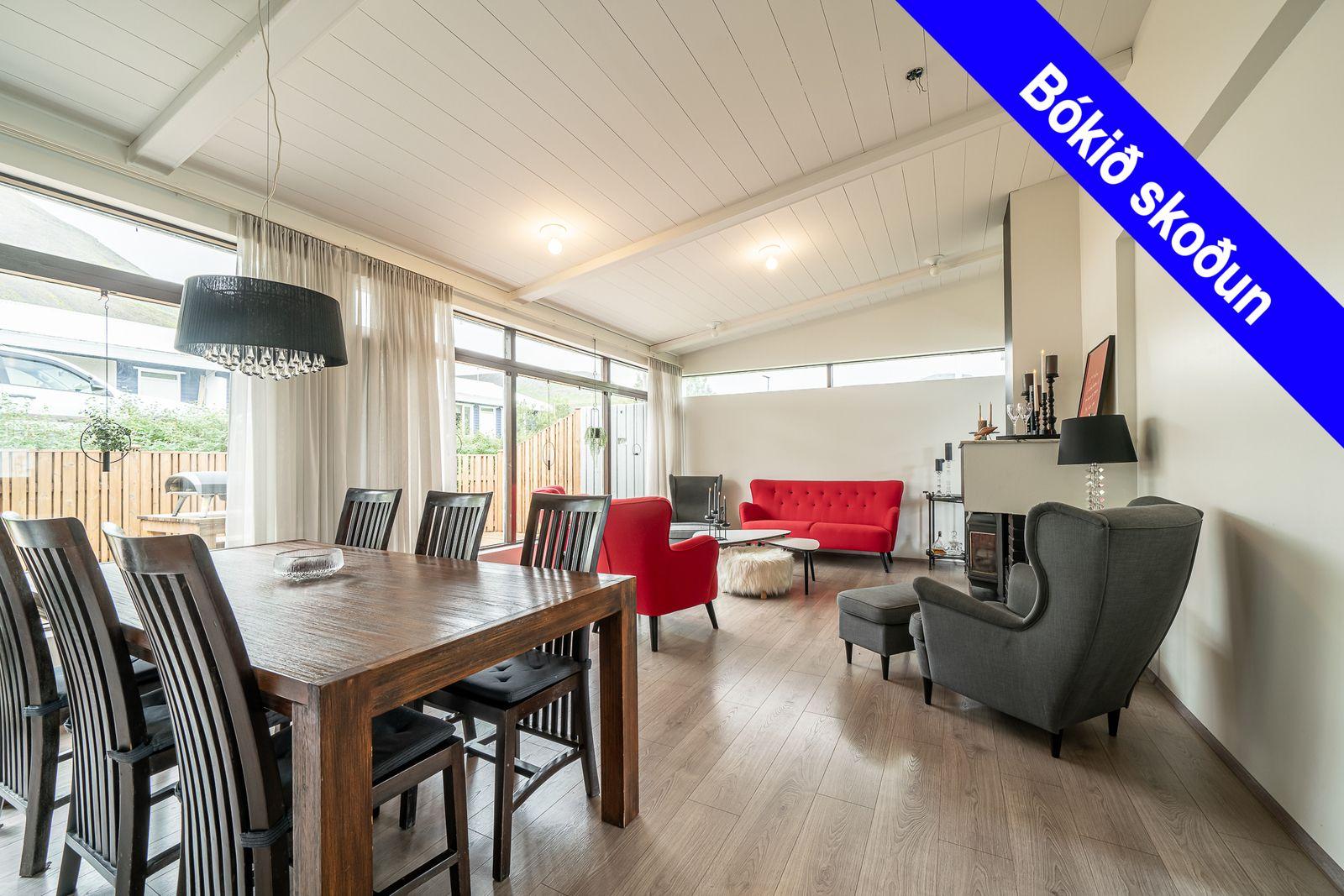 Rúmgóð, björt og opin stofa og borðstofa með harðparketi á gólfi, arinn með viðarkamínu, útgengt á góðan sólpall.