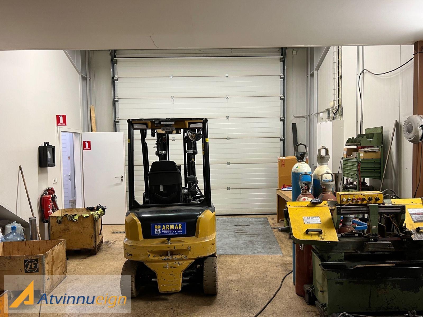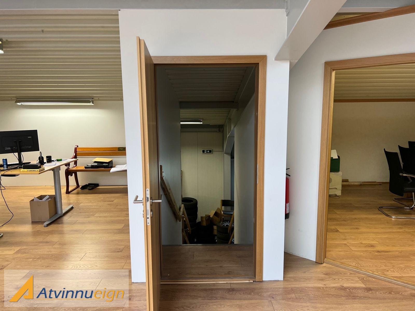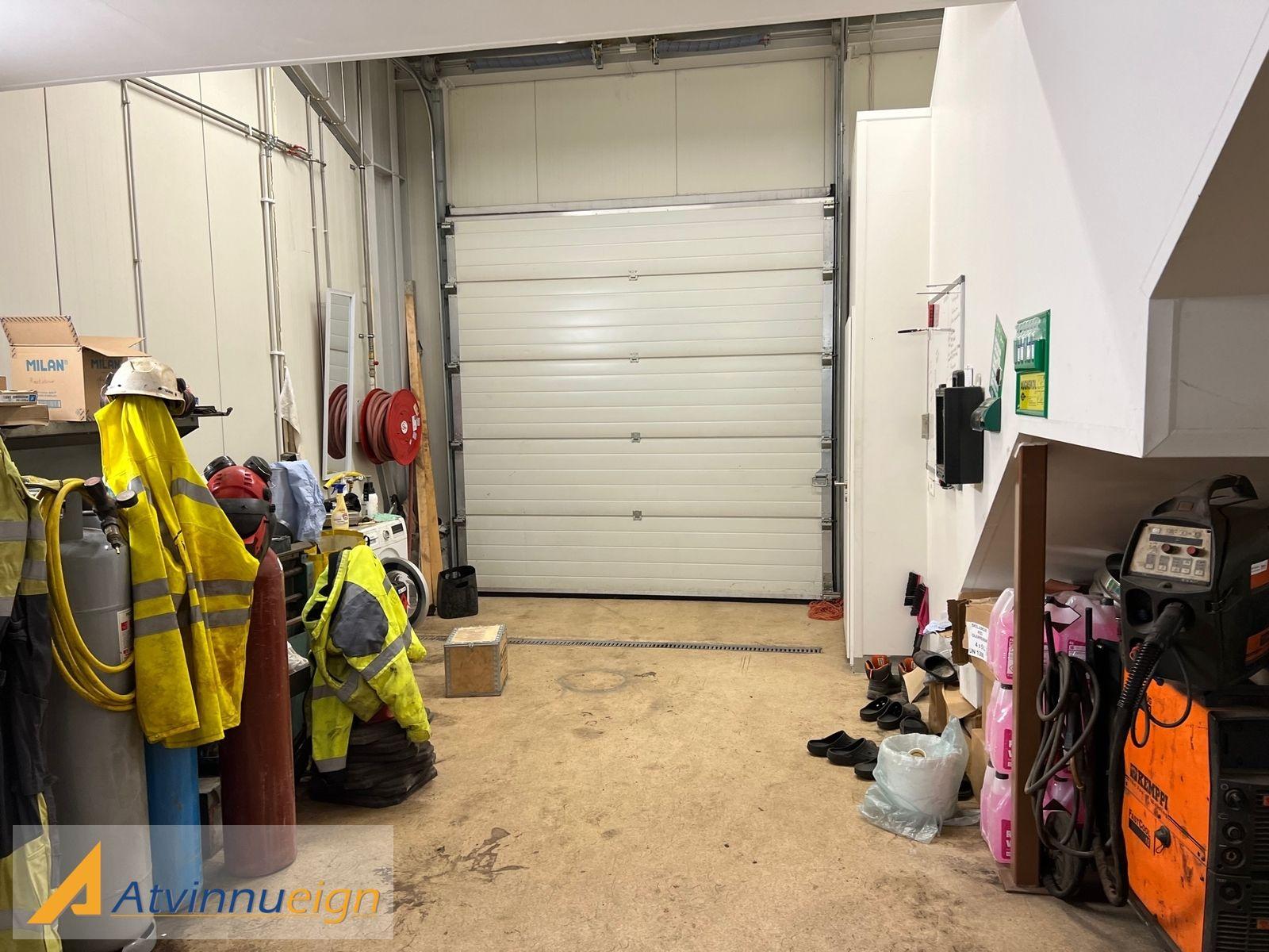 Fjórar iðnaðarhurðar eru inn í rýmið, þrjár þeirra eru ca. 3m. á hæð og ein hurðin er 3,8m. á hæð. Það eru tvær hurðar á báðum endum og hægt að keyra í gegnum húsnæðið. Jarðhæðin er 266m2 með epoxy gólfi.
