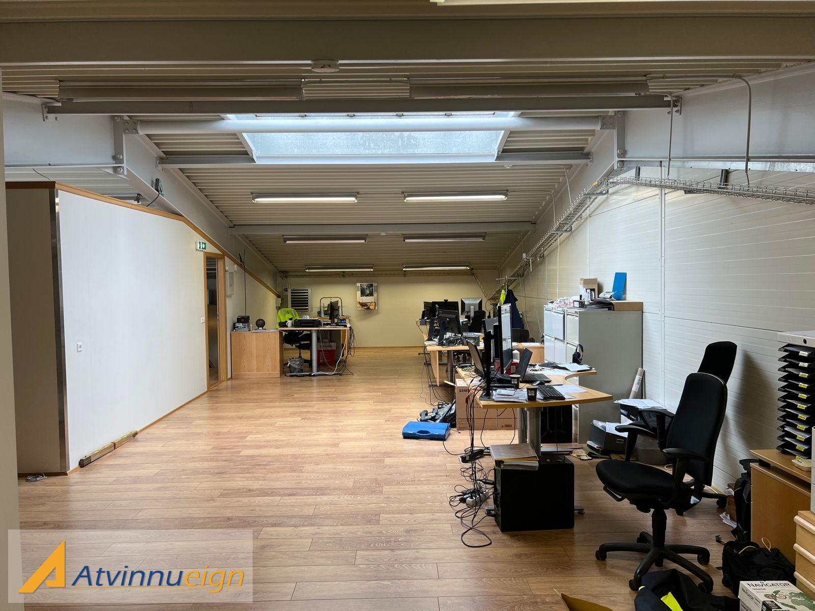 Lofthæð undir millilofti er 2,8m en frá útvegg og að millilofti er lofthæðin minnst 4,3m og hækkar þangað til að milliloft byrjar 4,14m frá útvegg, (sjá sniðmynd). Jarðhæðin nýtist vel sem lager eða vinnusalur. 2.hæð er 178m2. Flott parketlagt skrifstofuloft með WC, eldhúsi, sal og einu herbergi.
