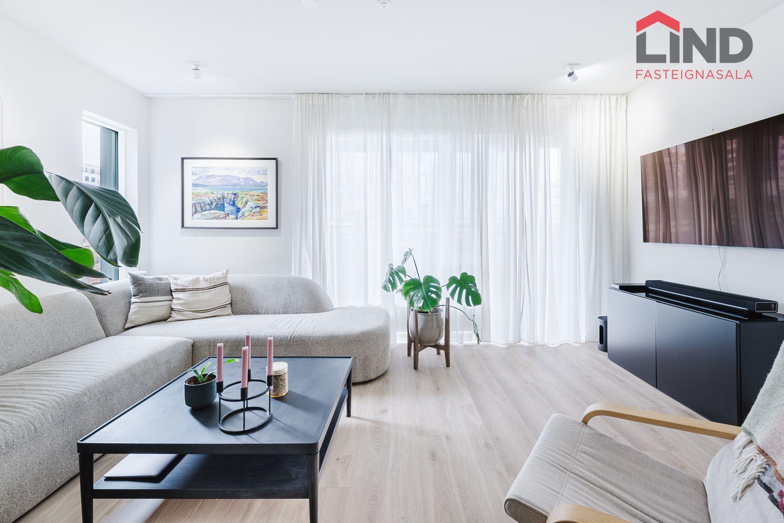 Nánari lýsing eignar: Forstofa með góðu skápaplássi og parketi á gólfi. Stofa og borðstofa í opnu og björtu alrými. Eldhúsið er með eyju og innréttingum frá Nobilia/GKS, steinn á borðum og undirlímdur stálvaskur. Innbyggð uppþvottavél, tvöfaldir ofnar (hefðbundinn og combi) og helluborð með innbyggðu sogkerfi. Þvottahús innan gengið úr eldhúsi, með hvítri innréttingu, góðum skápum, vaski og flísum á gólfi. Hjónaherbergi er rúmgott með góðu skápaplássi og parketi á gólfi. Svefnherbergi ll bjart með fataskáp og parketi á gólfi. Baðherbergi er flísalagt með walk-in sturtu, fallegum innréttingum og gólfhita. Sérgeymsla fylgir eigninni, 7,3 fm að stærð. Stæði í bílageymslu (með hleðslustöð) fylgir eigninni.