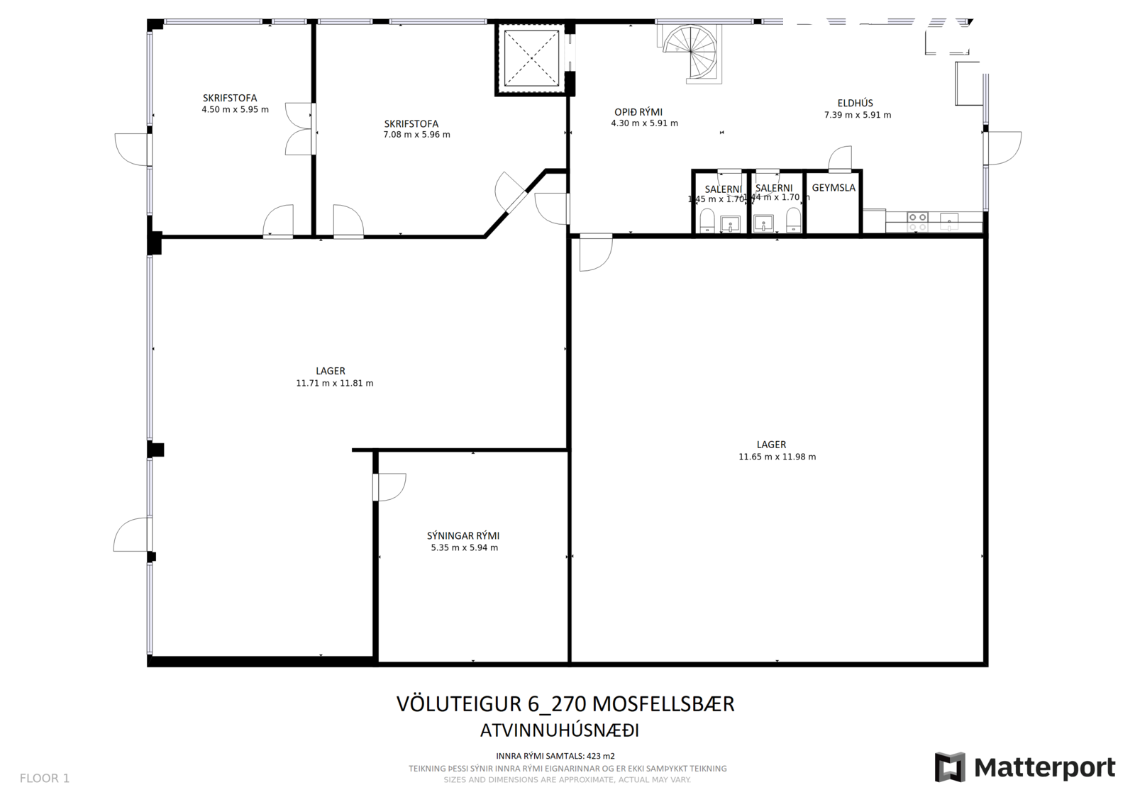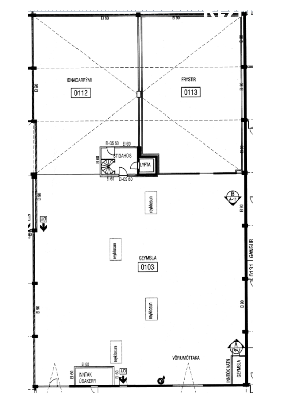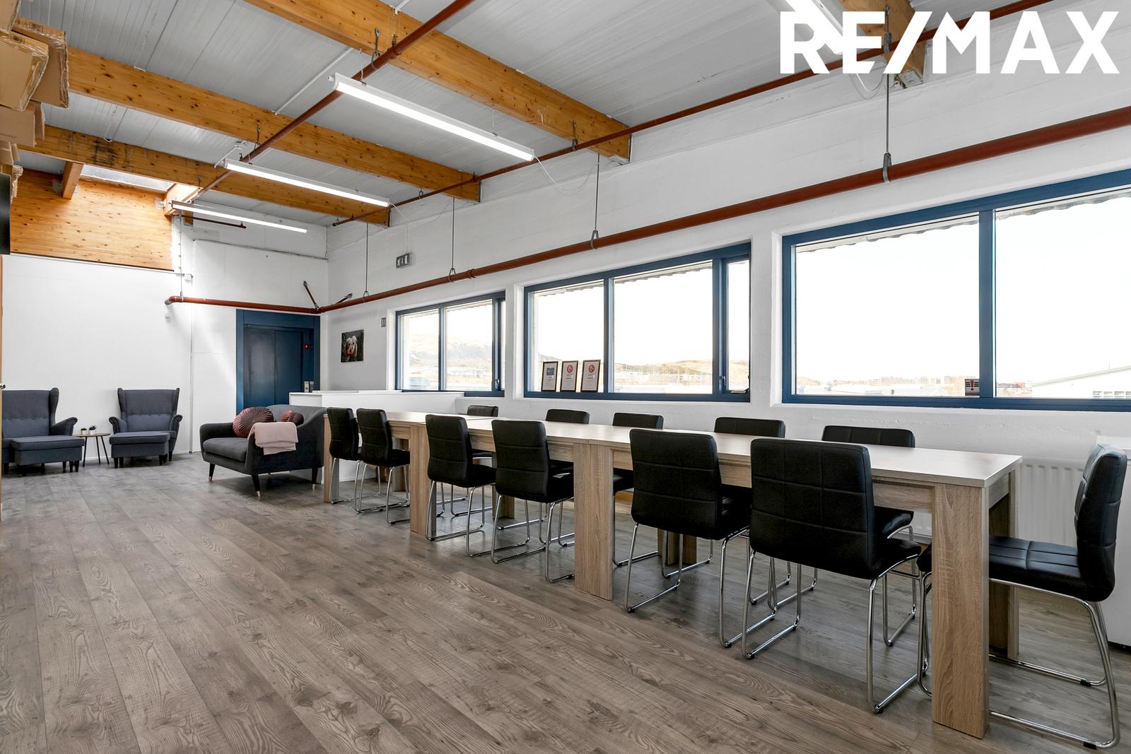 Eignin skiptist þannig jarðhæðin er 1008,7 m2 og önnur hæð er 478,6 fm. Jarðhæðin er með 2 stórum innkeyrsludyrum og er lofthæðin 5,7 metrar en 4,3 metrar undir burðarbita. Lyfta er upp á aðra hæð þar sem eru skrifstofur, eldhús, starfsmannaaðstaða og smávörulager á þeirri hæð.