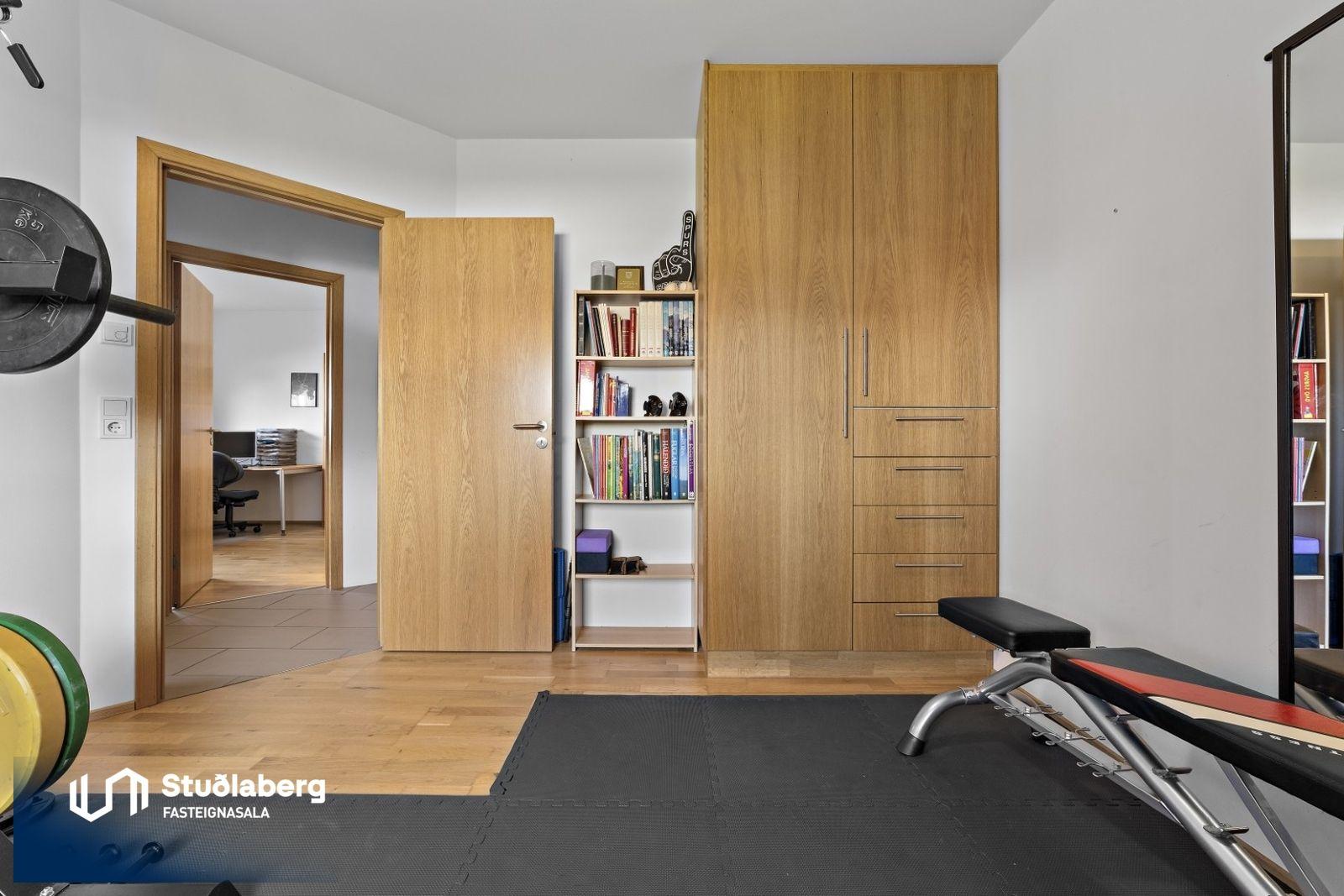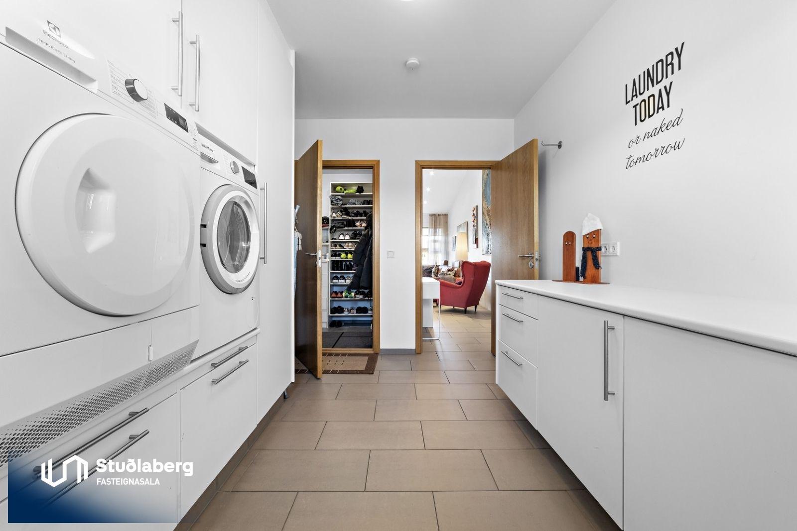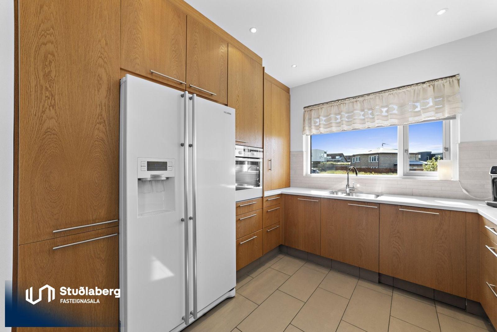 Forstofa er flísalögð og þar er góður skápur. Hol er flísalagt. Stofa er flísalögð og hurð er út á afgirta verönd frá stofu. Í eldhúsi eru flísar á gólfi, þar er vegleg eikar-innrétting með flísum á milli skápa, ofn, helluborð og vifta. Á baðherbergi eru flísar bæði á gólfi og á veggjum, þar er góð eikar-innrétting, upphengt salerni, baðkar og flísalögð sturtuaðstaða stúkuð af með gleri. Svefnherbergin eru fjögur og eru þau öll mjög rúmgóð, parket er á gólfum og skápar eru í öllum herbergjum. Baðherbergi er inn af hjónaherbergi. Í þvottahúsi eru flísar á gólfi, þar er góð hvít innrétting með góðu skápaplássi og aðstöðu fyrir þvottavél og þurrkara í vinnuhæð, skolvaskur í borði og hurð út á lóð.