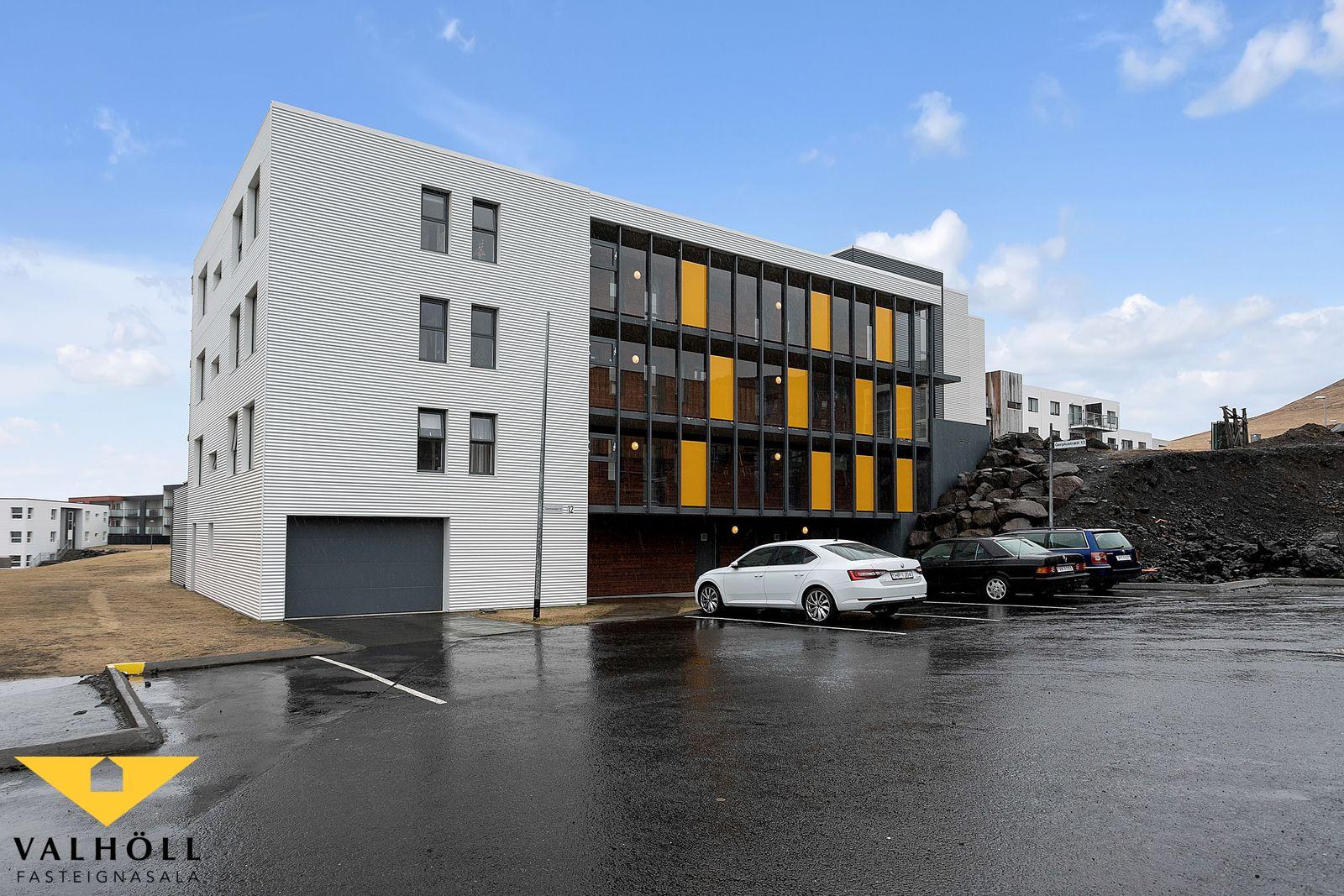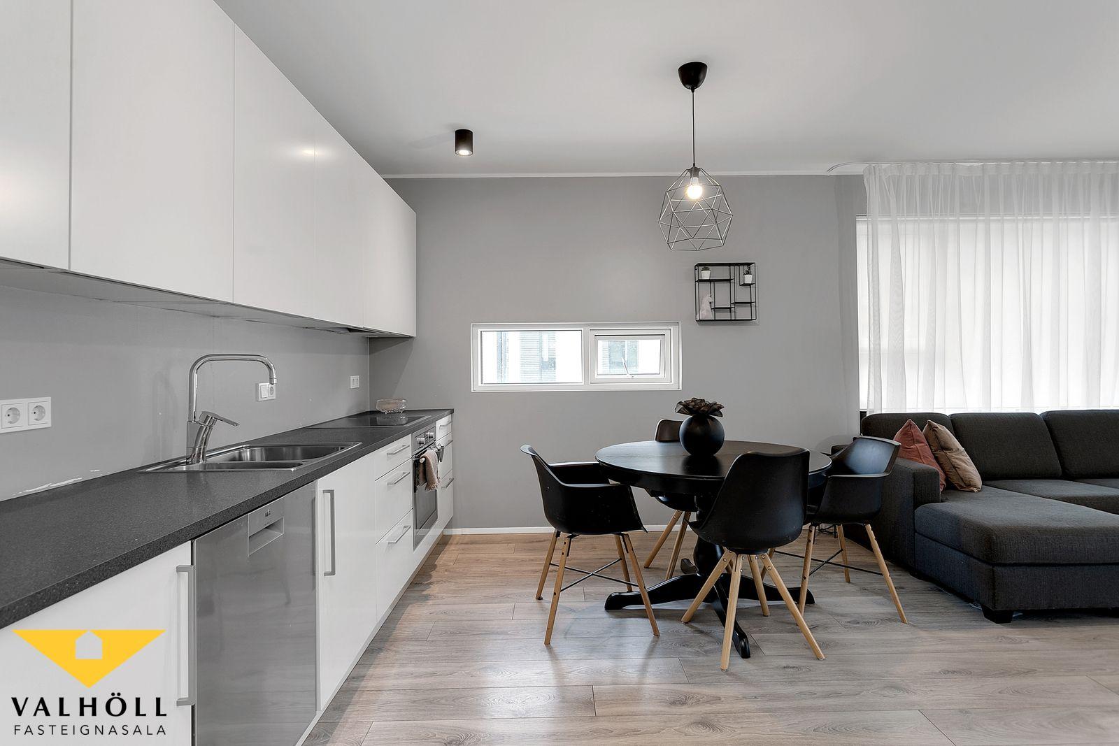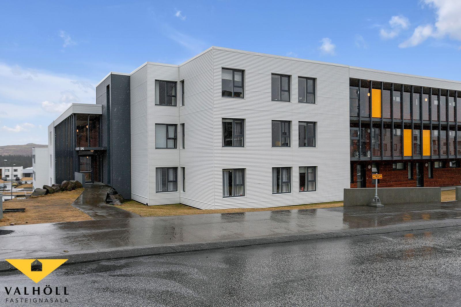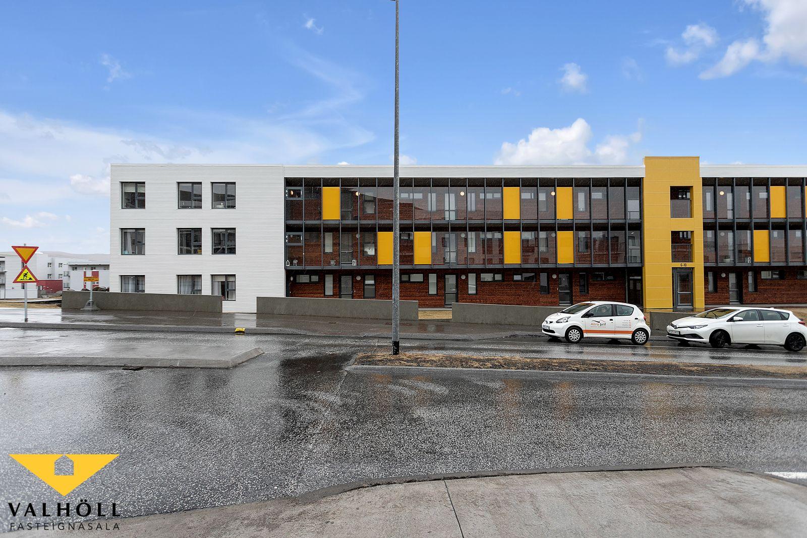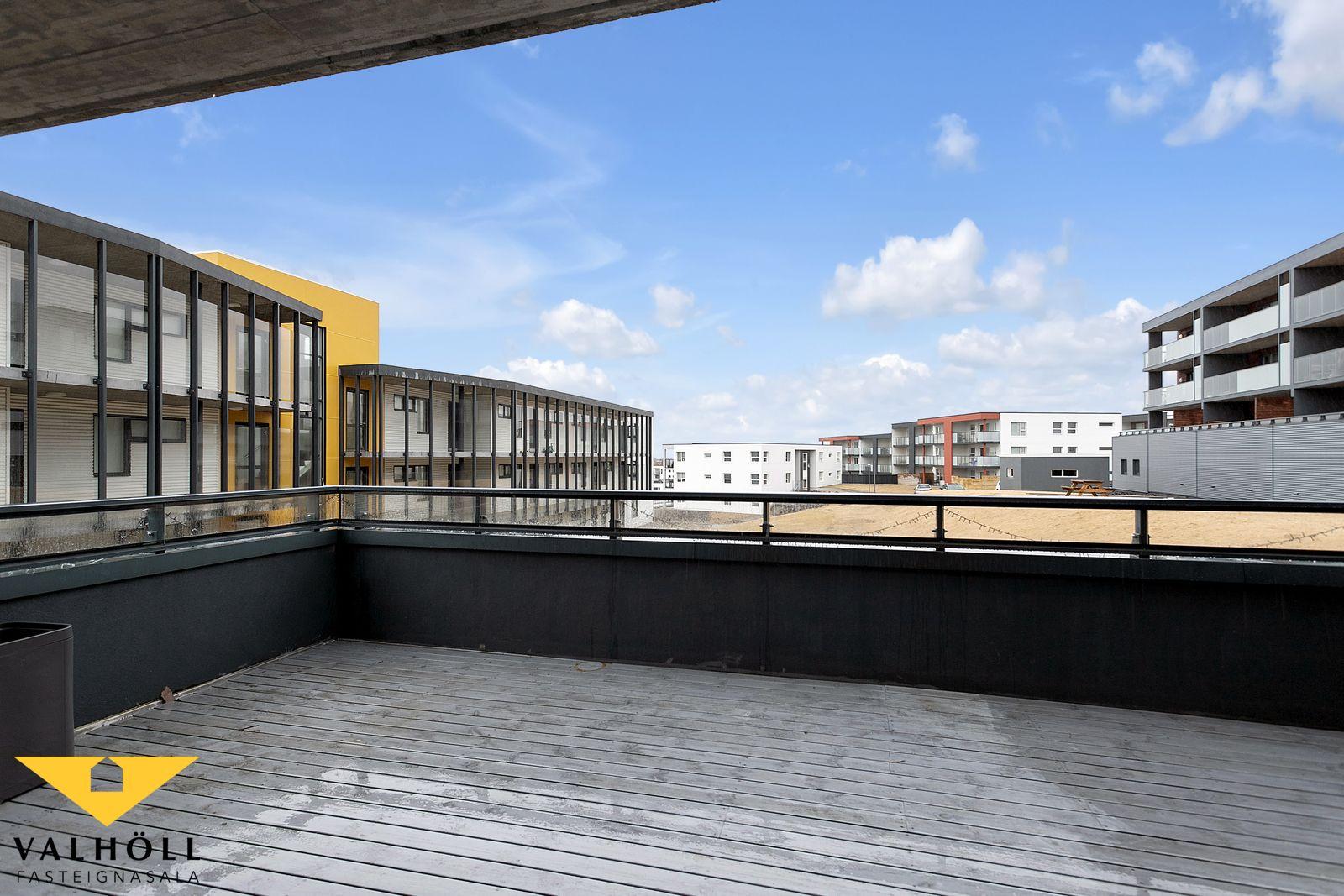 NÁNARI LÝSING: Forstofa með flísum og fataskápum. Gangur með parketi. Herbergi tvö mjög rúmgóð barnaherbergi með parketi og skápum. Baðherbergið flísalagt í hólf og gólf, innrétting og walk in sturta. Þvottaaðstaða innan baðherbergis, skápar fyrir þvottavél og þurrkara. Hjónaherbergið er rúmgott og er parket á gólfi og fataskápar. Stofan er björt með gluggum á tvo vegu og útgengt út á glæsilegar 32,9 fm suðvestur svalir/verönd sem er mikil viðbót við íbúðina og auðvelt að koma þar fyrir heitum potti og fl. Eldhúsið er við hlið stofu, opið á milli, með hvítri innréttingu, borðkrókur og góð tæki. Geymsla er 12,8 m2. Á jarðhæð er stæði í bílageymslu og er þar gert ráð fyrir rafbílahleðslu í hverju stæði.