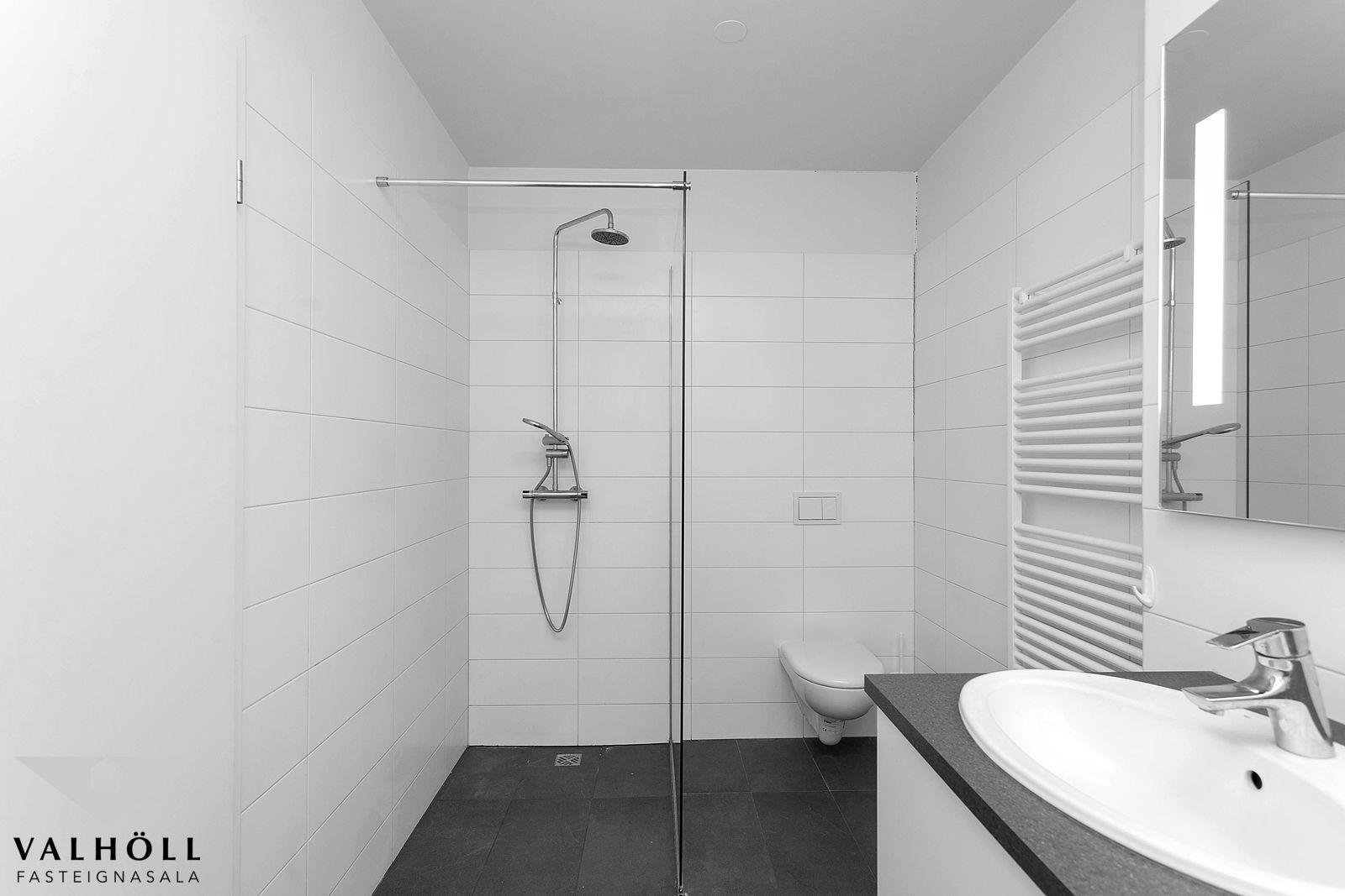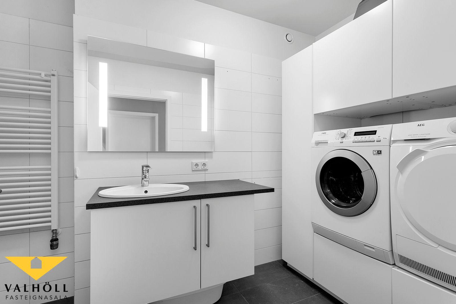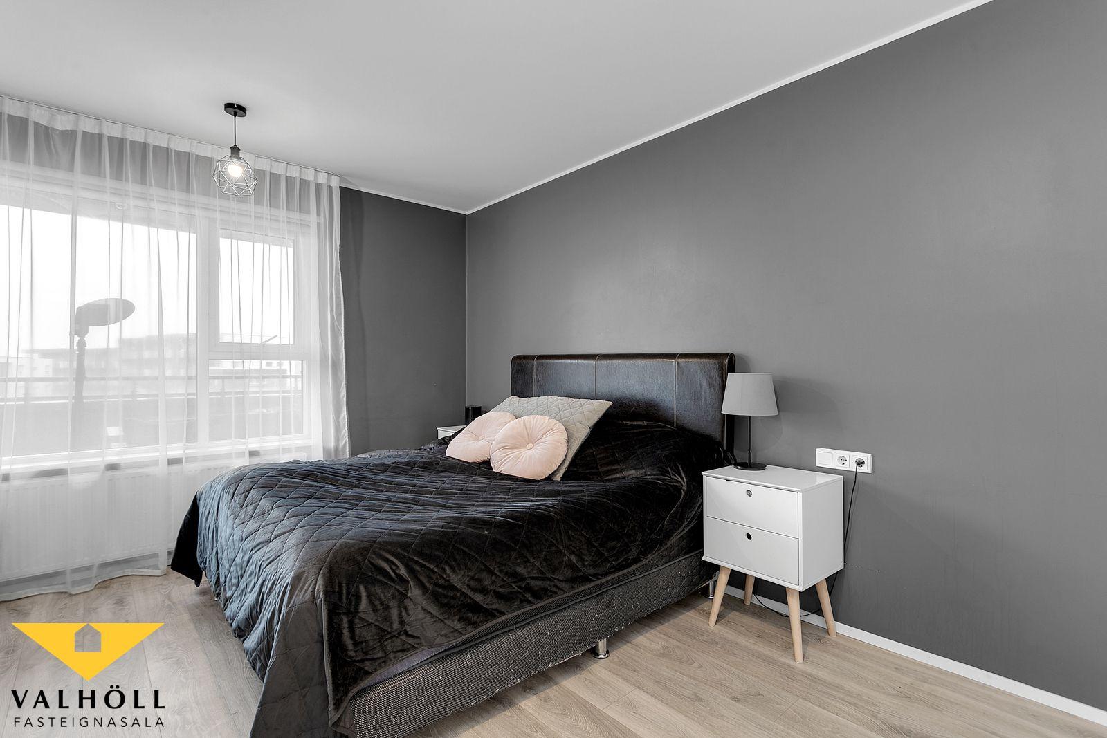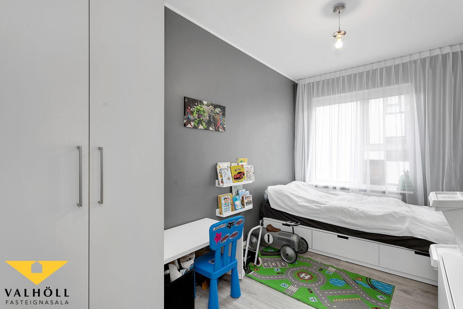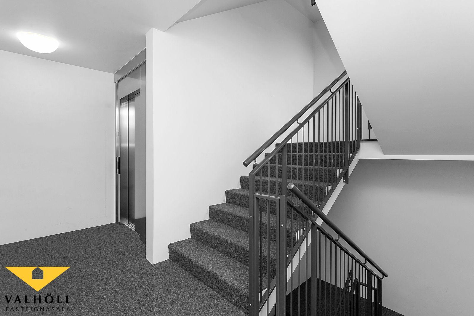 NÁNARI LÝSING: Forstofa með flísum og fataskápum. Gangur með parketi. Herbergi tvö mjög rúmgóð barnaherbergi með parketi og skápum. Baðherbergið flísalagt í hólf og gólf, innrétting og walk in sturta. Þvottaaðstaða innan baðherbergis, skápar fyrir þvottavél og þurrkara. Hjónaherbergið er rúmgott og er parket á gólfi og fataskápar. Stofan er björt með gluggum á tvo vegu og útgengt út á glæsilegar 32,9 fm suðvestur svalir/verönd sem er mikil viðbót við íbúðina og auðvelt að koma þar fyrir heitum potti og fl. Eldhúsið er við hlið stofu, opið á milli, með hvítri innréttingu, borðkrókur og góð tæki. Geymsla er 12,8 m2. Á jarðhæð er stæði í bílageymslu og er þar gert ráð fyrir rafbílahleðslu í hverju stæði.
