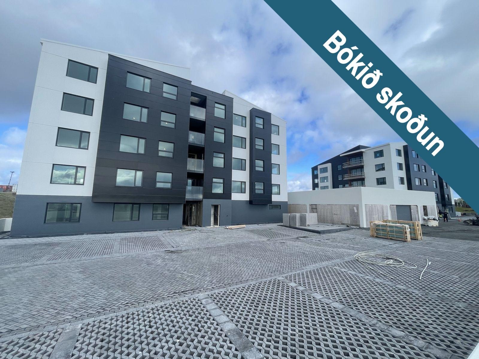 * Eignin skilast fullkláruð að utan og innan að undanskyldum gólfefnum í alrými og herbergjum. Flísar eru á votrýmum. * Eldhúsinnrétting, klæðaskápar og innihurðar eru vandaðar frá GKS í hnotulit eða í dökk gráum lit. Klæðaskápar eru í forstofu og svefnherbergjum. * Í eldhúsi er ofn með blæstri og örbylgjuofn. Helluborð með innbyggðum gufugleypi, kæliskápur með frystihólfi og uppþvottavél fylgja frá Siemnes. * Baðherbergin skilast flísalögð á gólfum og veggjum. Dökkar innréttingar frá GKS, speglaskápur, handlaug frá Tengi ehf. Handklæðaofn frá Vatnsvirkjanum, upphengt salerni með hæglokandi setu frá Ísleifi Jónssyni. * Hurðir eru yfirfelldar hvítlakkaðar frá Birgison * Lyfta er í húsinu * Bílageymsla er í opnu býlskýli á mill húsa. Veggir og loft eru steypt en ekki meðhöndlað frekar. * Bílskúrar fylgja ákveðnum íbúðum. Veggir og loft eru slípuð, grunnuð og máluð með tveimur yfirferðum af grárri votrýmismálningu. Epoxy verður á gólfum. Skolvaksur fylgir hverri íbúð. * Lóð verður fullfrágengin * Bílastæði verða malbikuð og eða hellulögð.