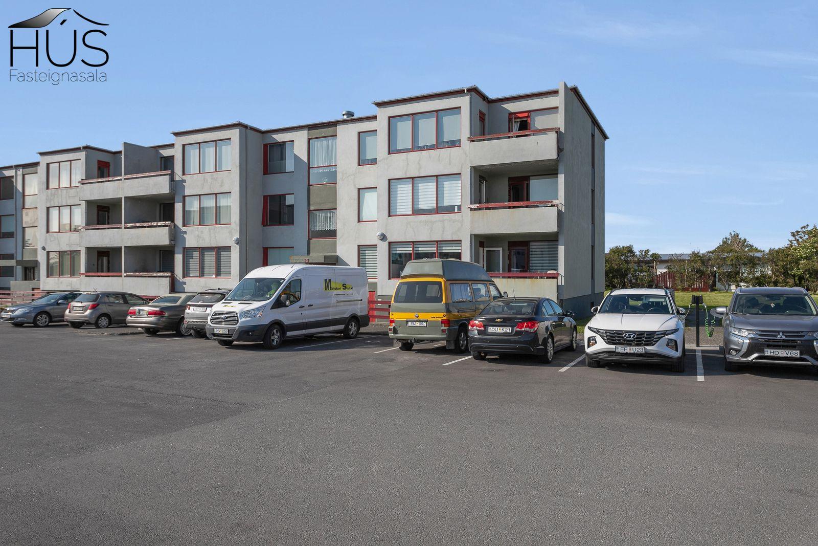 Rúmgott bílaplan og merkt bílastæði fyrir hverja íbúð. Sameiginlegar hleðslustöðvar á bílaplani.