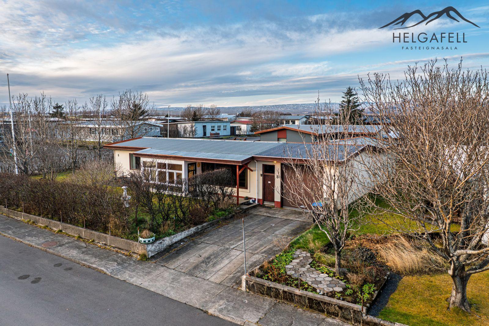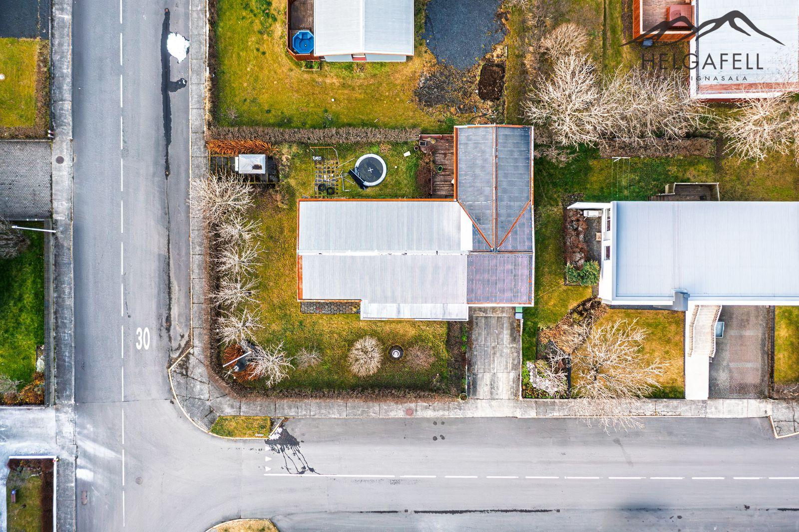Lóð: Fallegur einstaklega skjólsæll og gróinn garður. Framan við húsið er steypt innkeyrsla, stétt að og umhverfis húsið er hellulögð. Aftan við húsið er sólpallur til suður, þvottasnúrur.