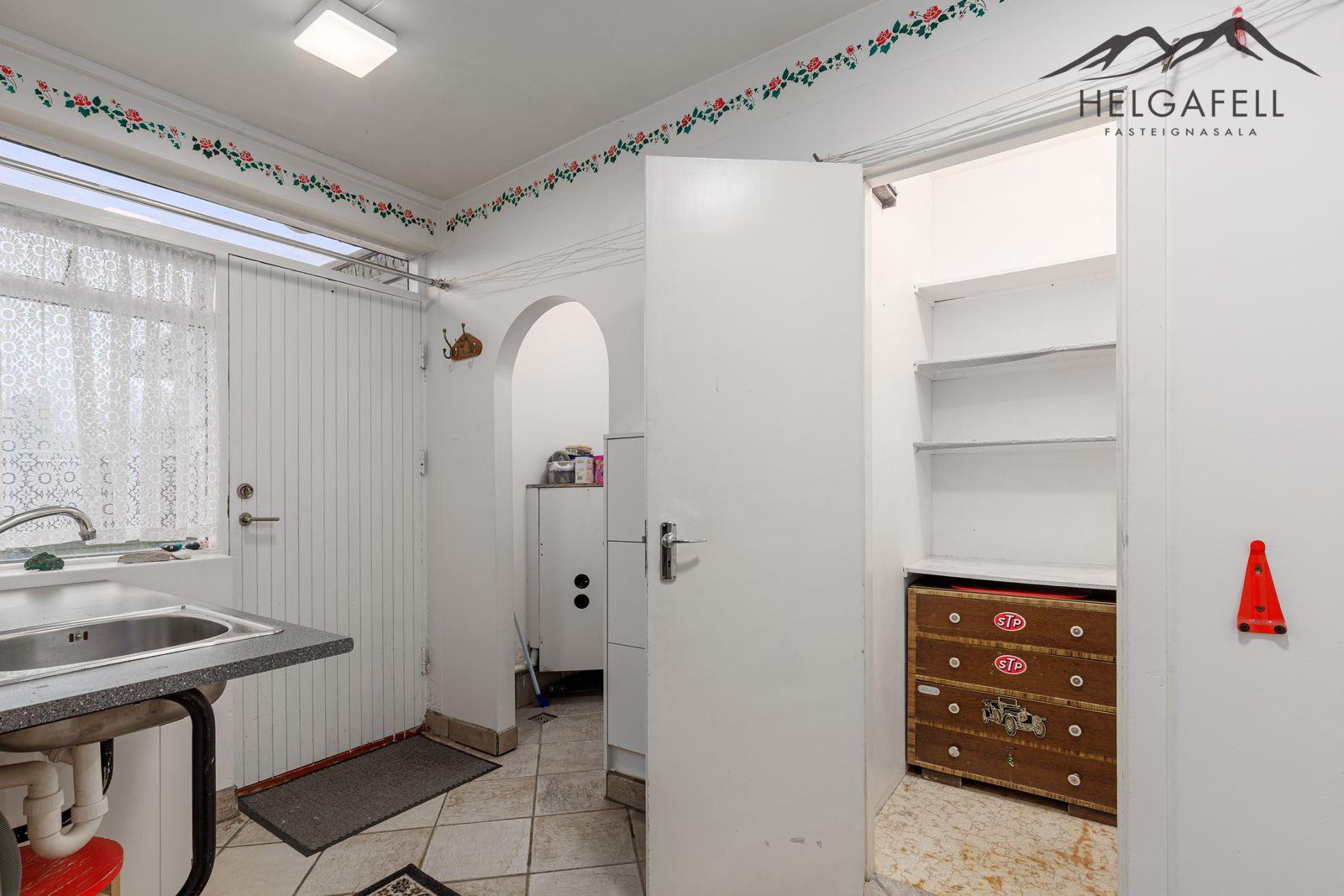 Þvottahús: Inn af eldhúsi, tengi fyrir þvottavél og þurrkara, útgengi út í garð, vaskur, gott skápa pláss, flísar á gólfi.
