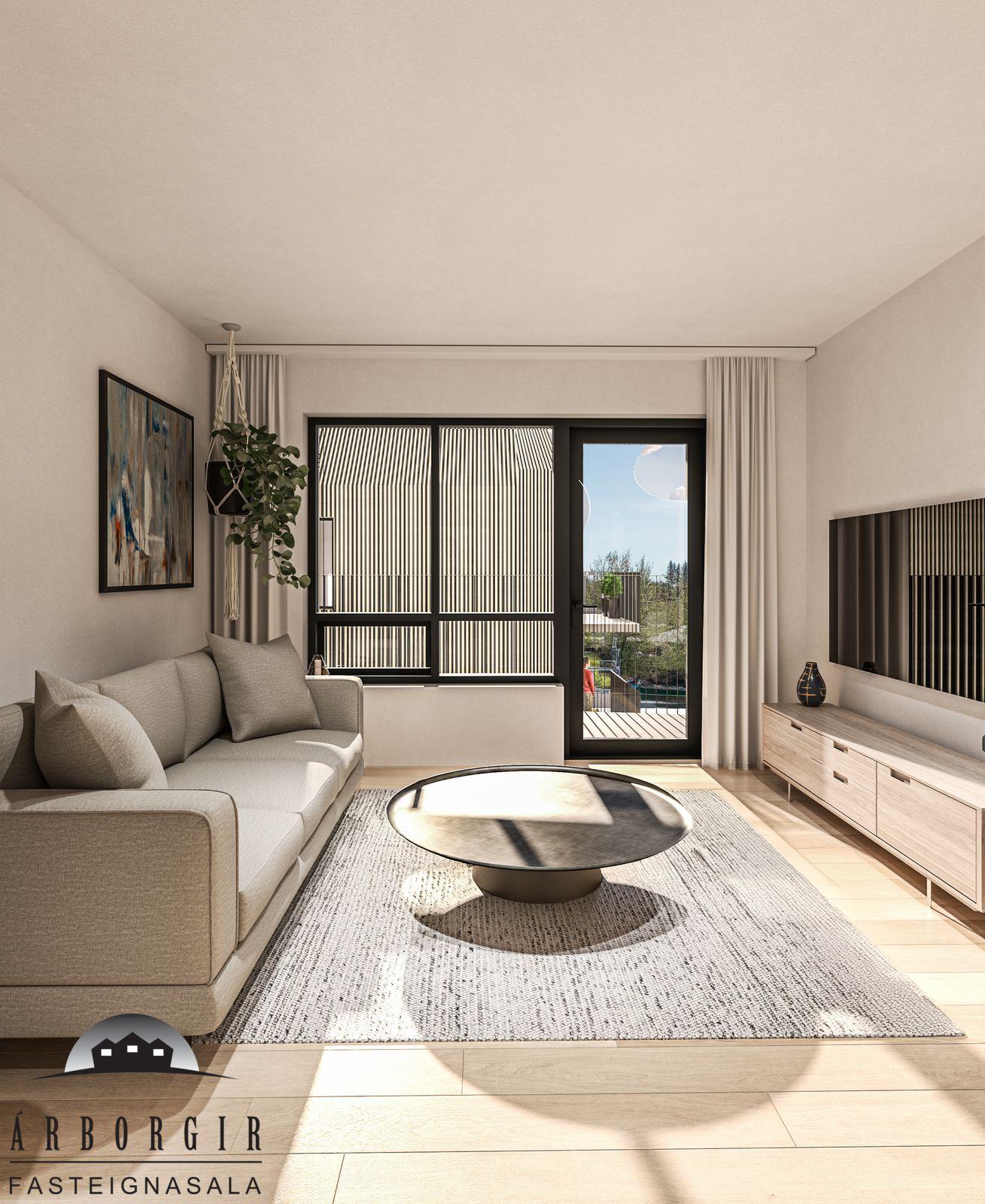 Íbúðin skiptist í forstofu, baðherbergi/þvottahús, 2 svefnherbergi, eldhús, stofu og borðstofu í opnu rými. Útgengt er á svalir úr alrými. Íbúðinni fylgir 8.5 m2 geymsla og sérmerkt bílastæði í kjallara.