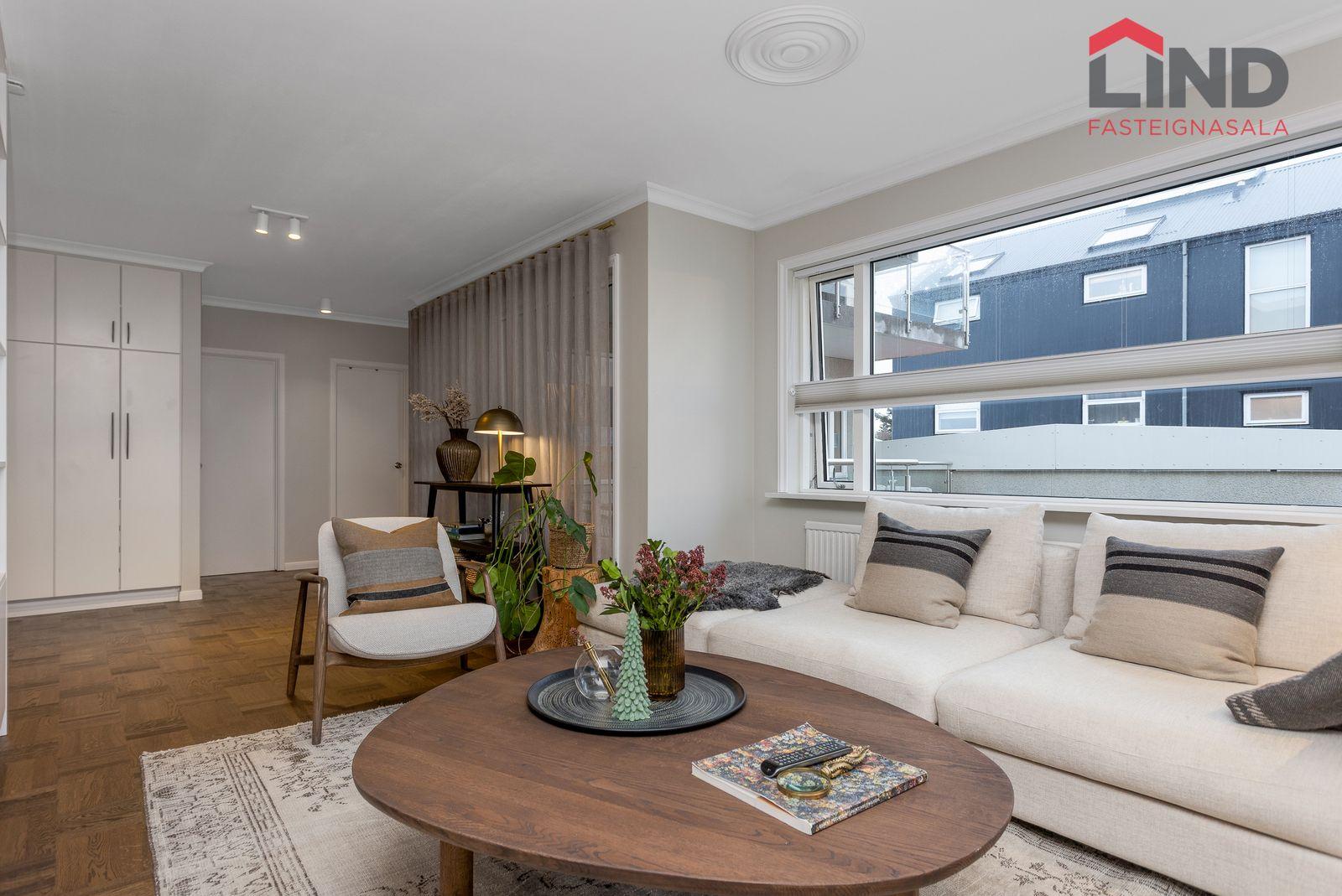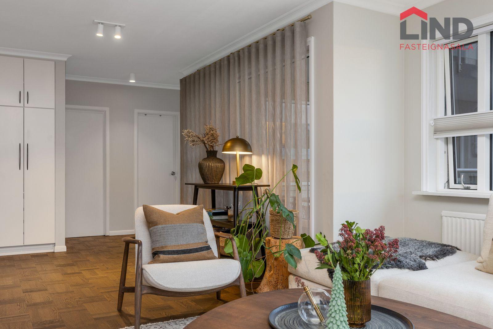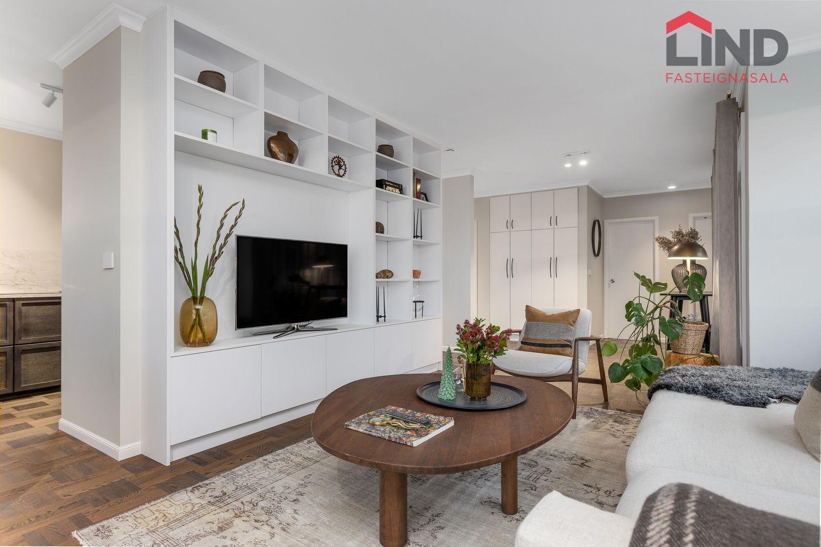 Árið 2021: Íbúðin var mikið endurnýjuð um sumarið og má nefna að HAF STUDIO var fengið til að hanna eldhús, stofu og forstofu. Rafmagn endurnýjað (tafla, lagnir, tenglar og rofar). Home snjallkerfi sett á flesta ljósarofa. Eldhústæki endurnýjuð með tvískiptum vínkæli, stóru helluborði, og tækjaskáp með ljósi. Flestar rósettur, glugga-, gólf og loftlistar voru endurnýjaðir og lakkaðir í HAF hvítu, lagt var glæsilegt olíuborið viðarparket á gólf íbúðar og flísar á forstofu. HAF STUDIO hannaði sérsmíðaða sjónvarpshillu í stofurými og settar voru upp sérsniðnar gardínur frá Casalisa í alla íbúðina.