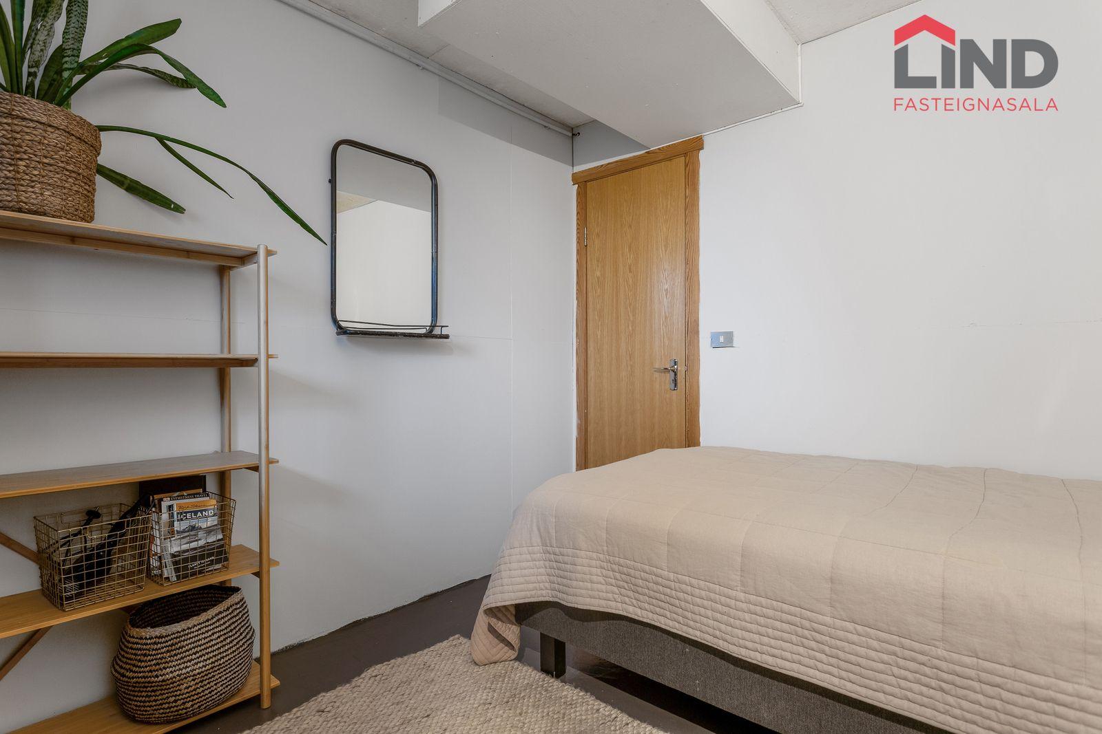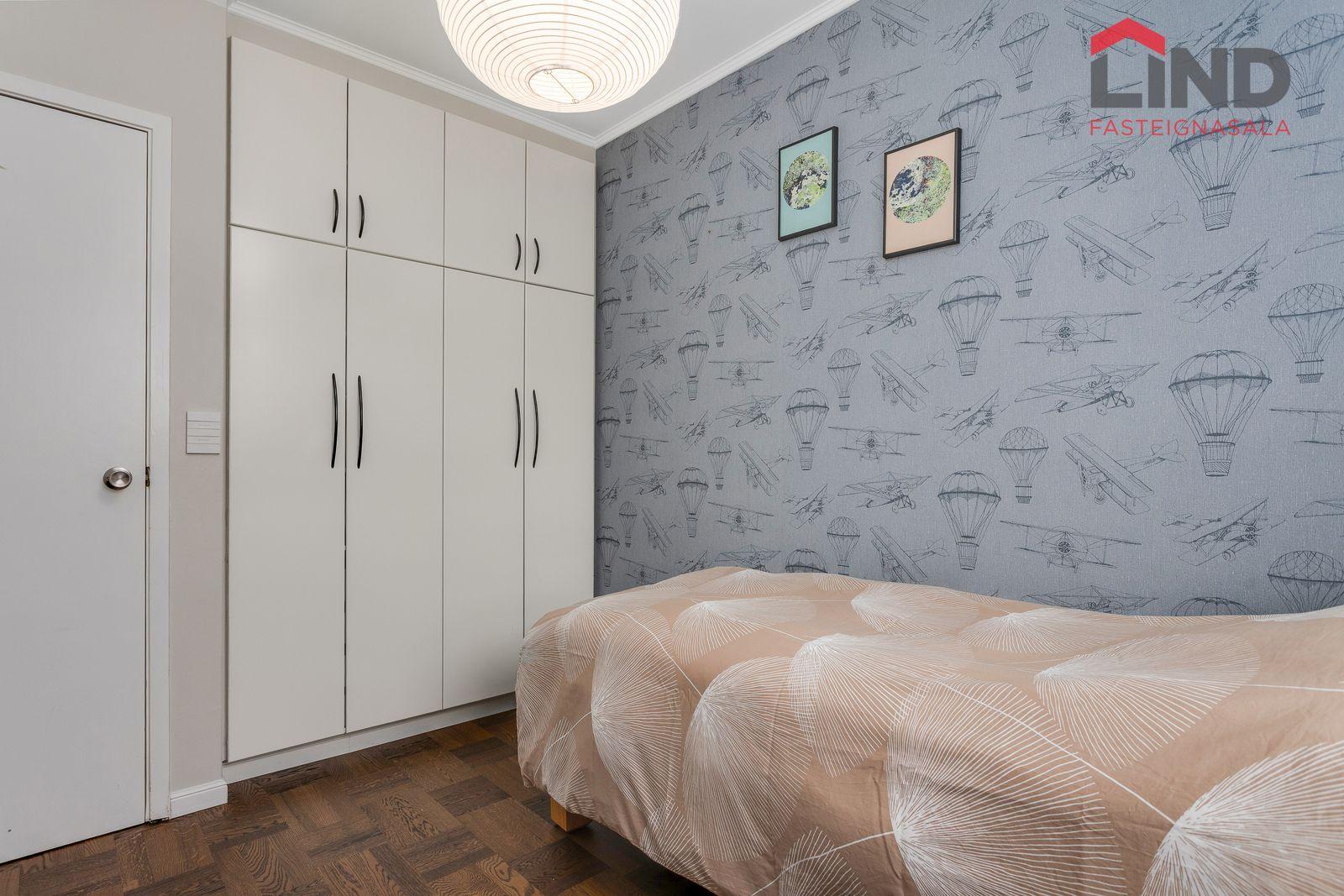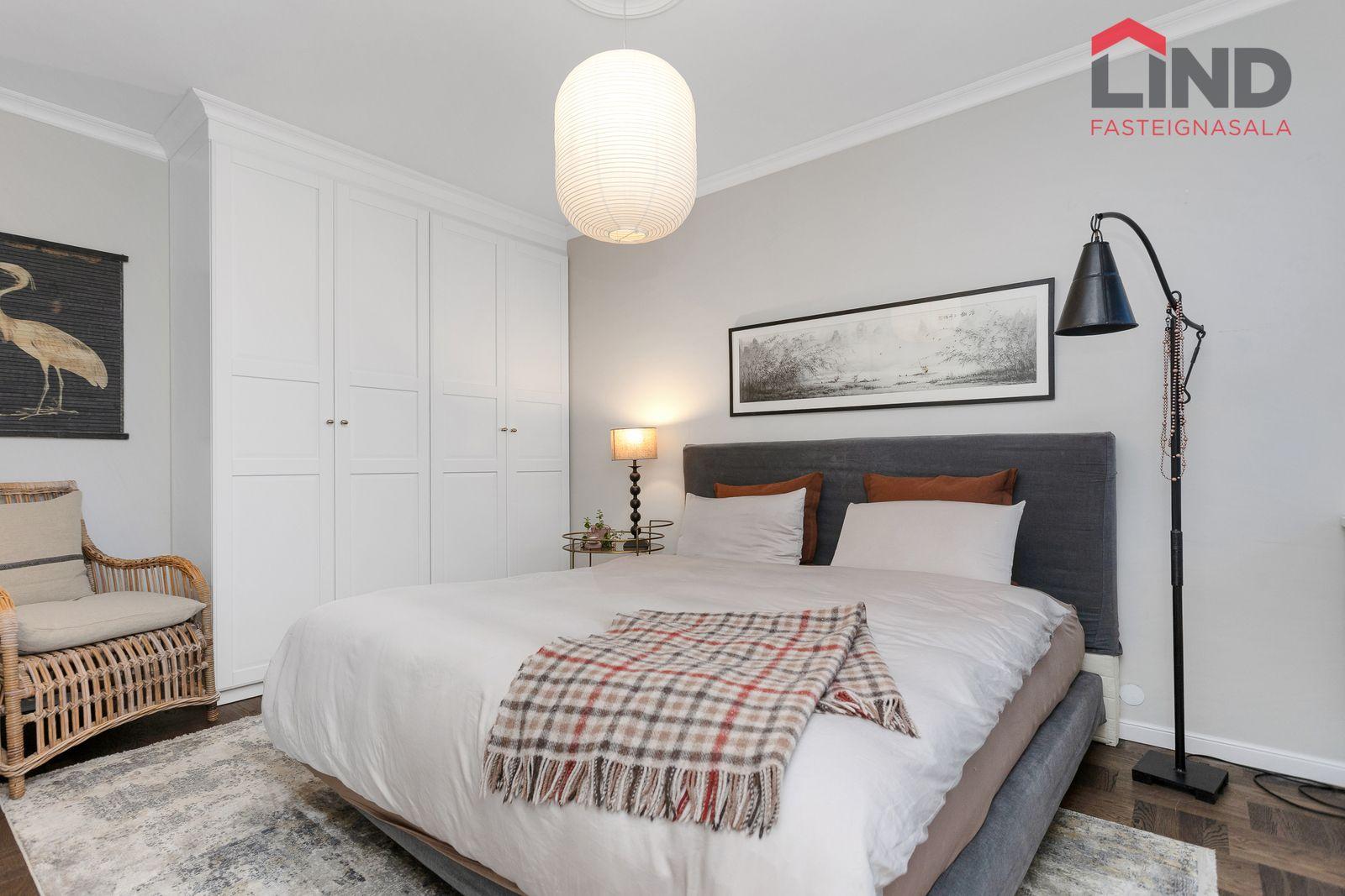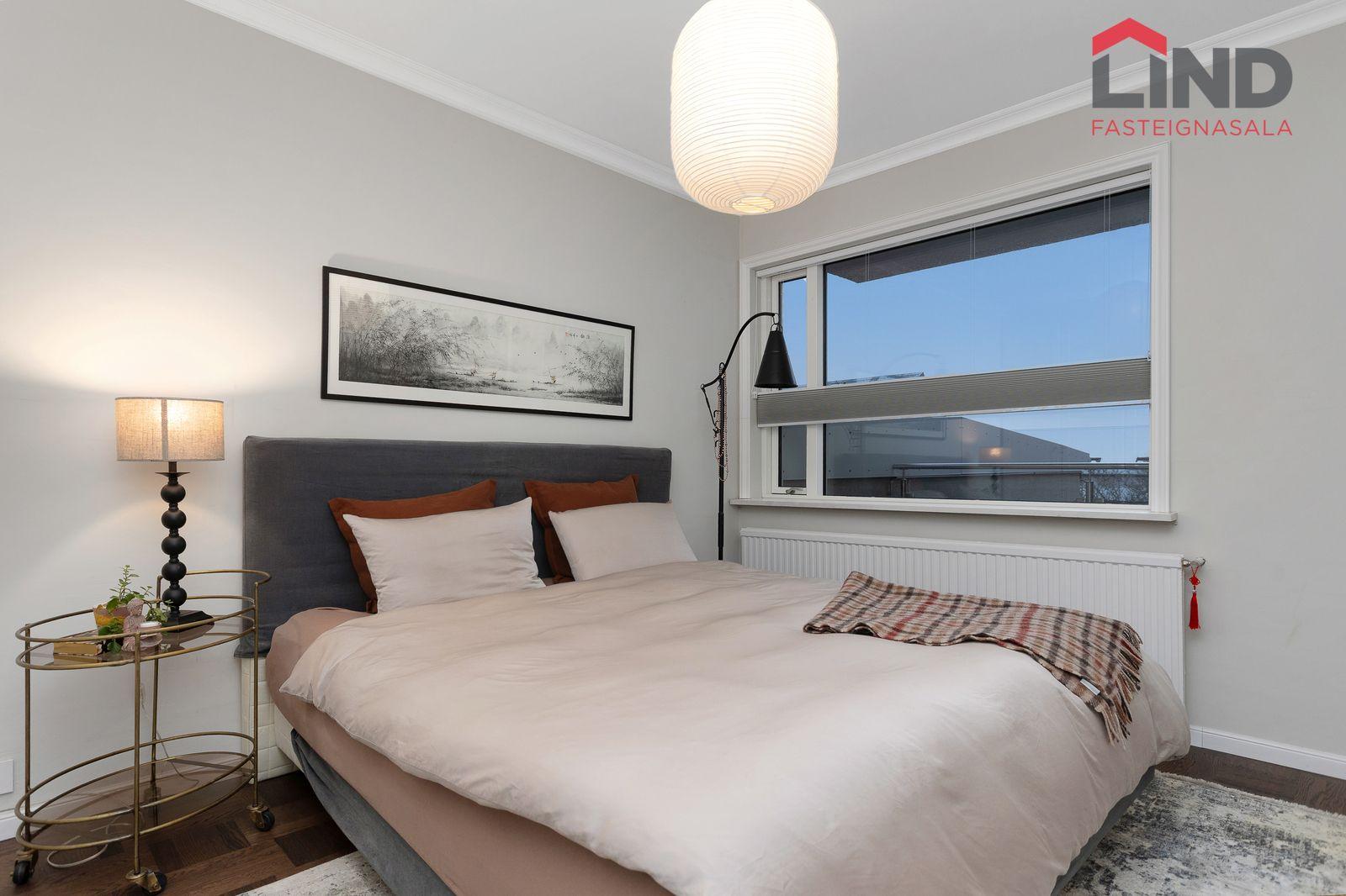 Svefnherbergi: Að undanskildu hjónaherbergi eru tvö svefnherbergi með parketi á gólfi, fataskápum og gardínum frá Casalisa í glugga.