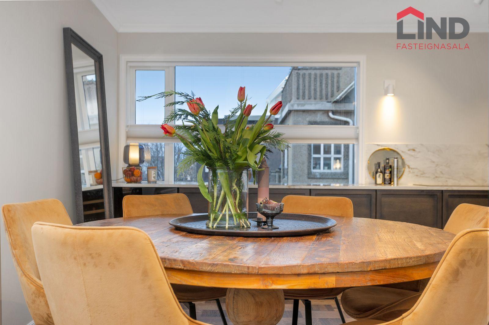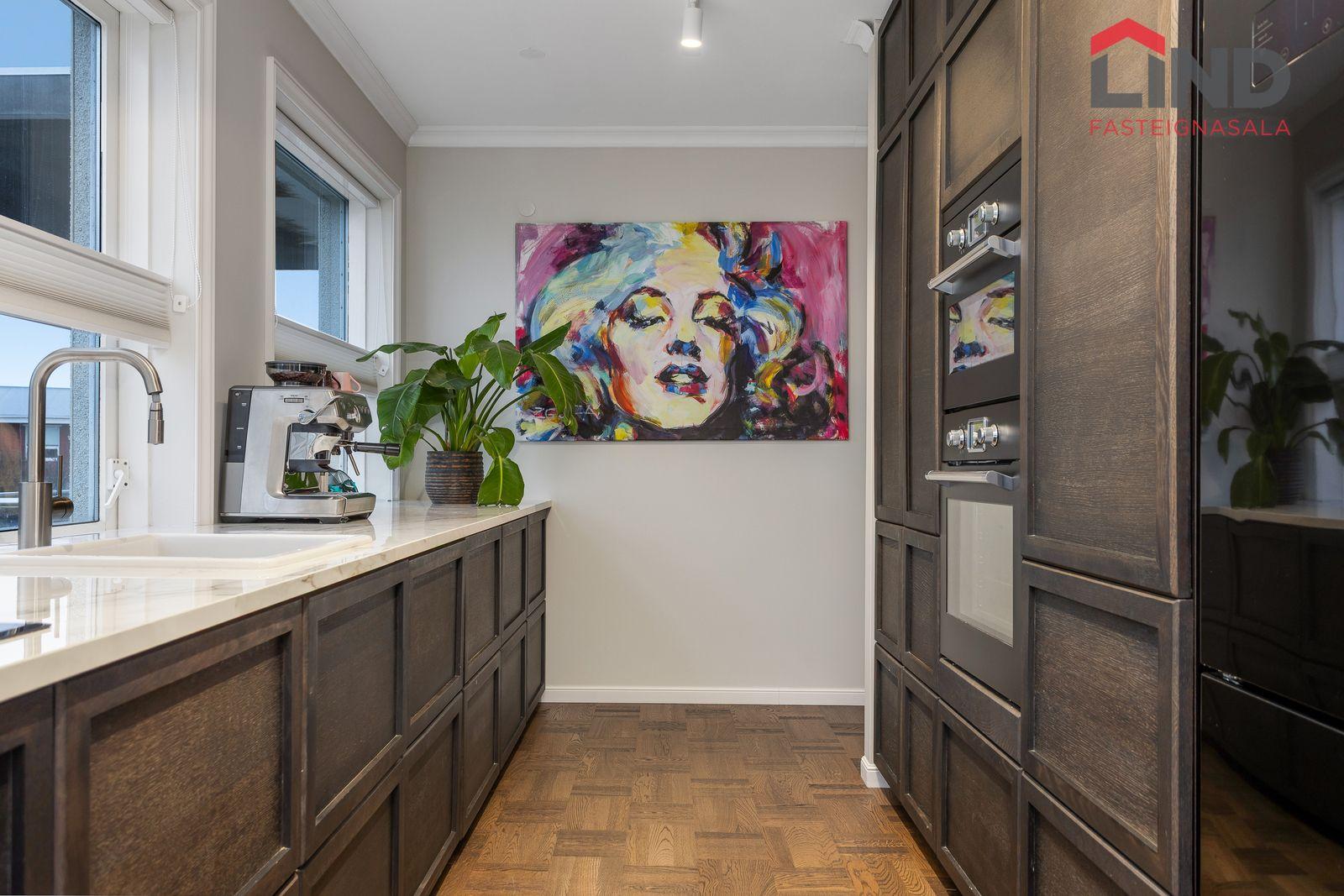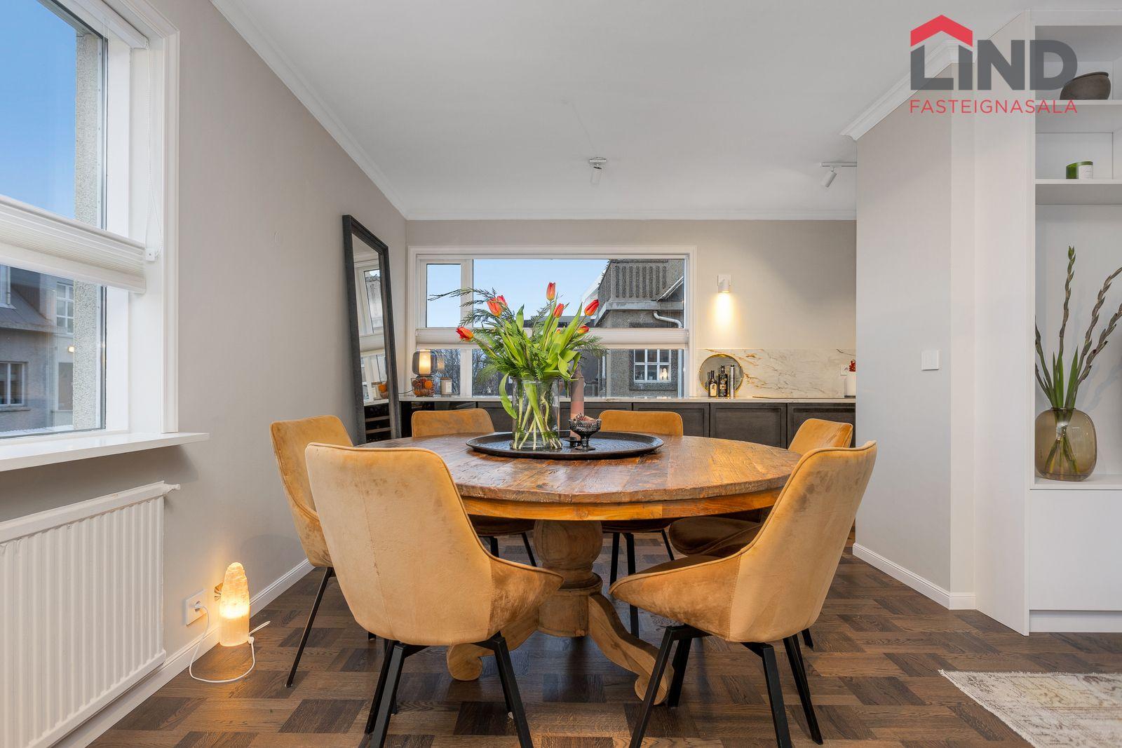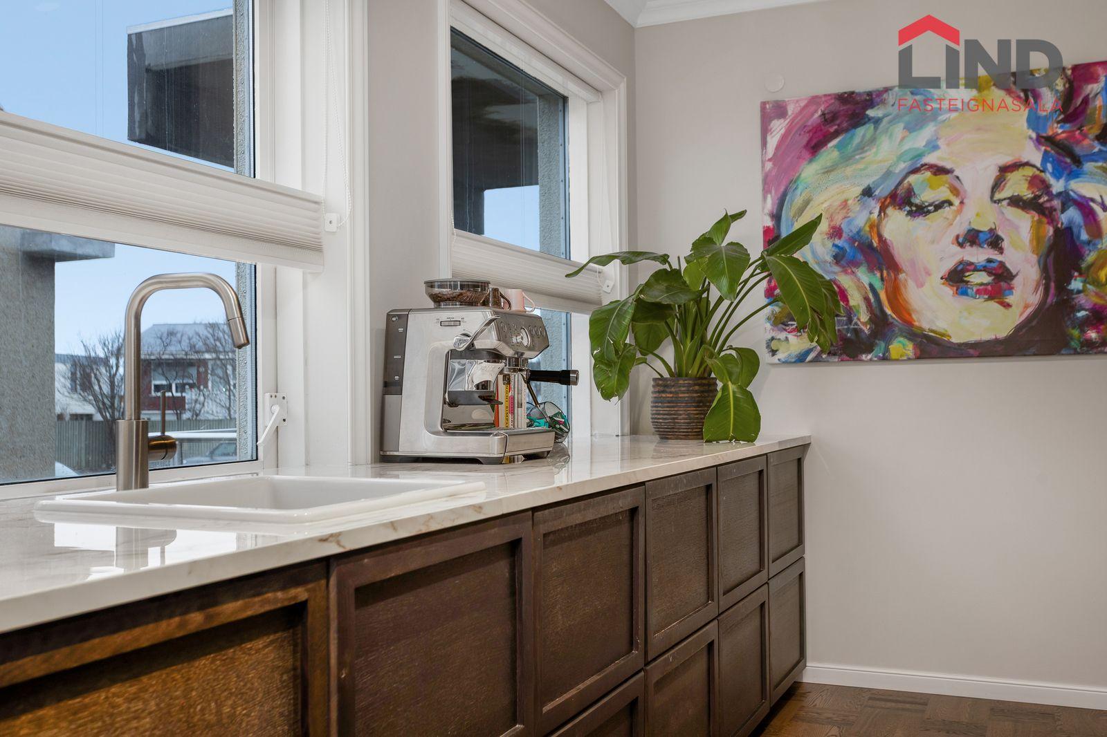 Eldhús: Mjög bjart og rúmgott eldhús með veglegri 7,5 metra langri innréttingu og búrskáp hannað í samstarfi við HAF STUDIO. Innréttingin er búin dökkum eikar frontum frá HAF STORE með einkar góðu skápaplássi. Fallegar flæðandi steinflísar á borðum og hluta veggjar. Eldhúsið er búið tveimur bakaraofnum í vinnuhæð, gert er ráð fyrir vínkæli, innbyggðri uppþvottavél, vask með útdraganlegum barka og niðurfelldu spanhelluborð af stærri gerð, Innbyggðum búrskáp útfærður af Svansverk í samvinnu við HAF STUDIO. Flæðandi dökkt viðarparket með fallegu mynstri (basket weave) á gólfi og gluggar með opnanlegum fögum. Gardínur frá Casalisa.