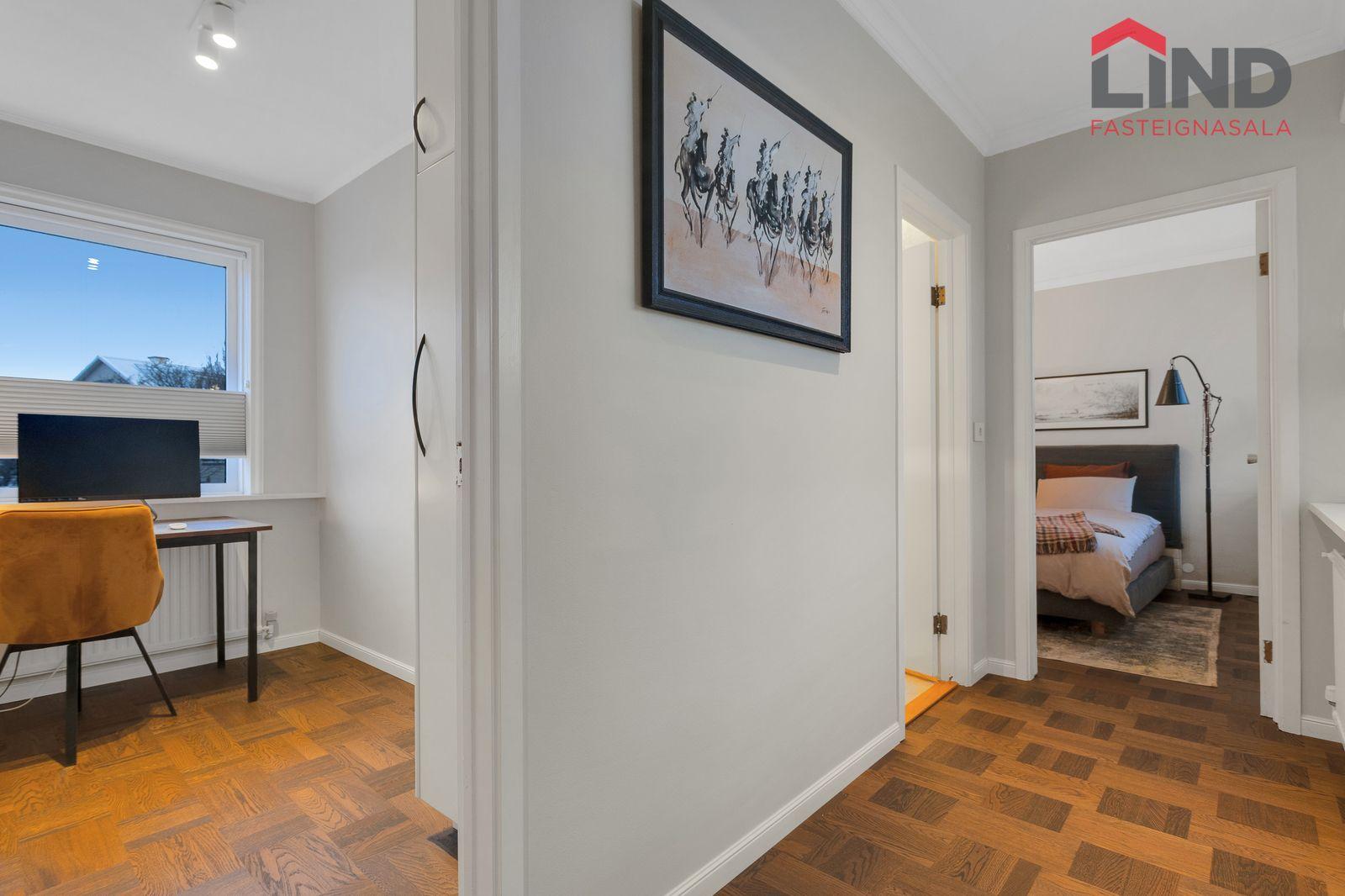Eignin skiptist í forstofu/hol, sjónvarpsstofu, borðstofu, rúmgott eldhús, svefnherbergisgang, þrjú svefnherbergi, baðherbergi, herbergi/geymslu á jarðhæð og bílskúr. Sameiginleg þvotta- og þurrkaðstaða er í kjallara eignar. Íbúðin var mikið endurnýjuð að innan árið 2021 ásamt því að húsið hefur fengið mikið viðhald. Gróinn og fallegur sameiginlegur garður umlyggja húsið og búið er að setja upp rafhleðslustöð í bílskúr.